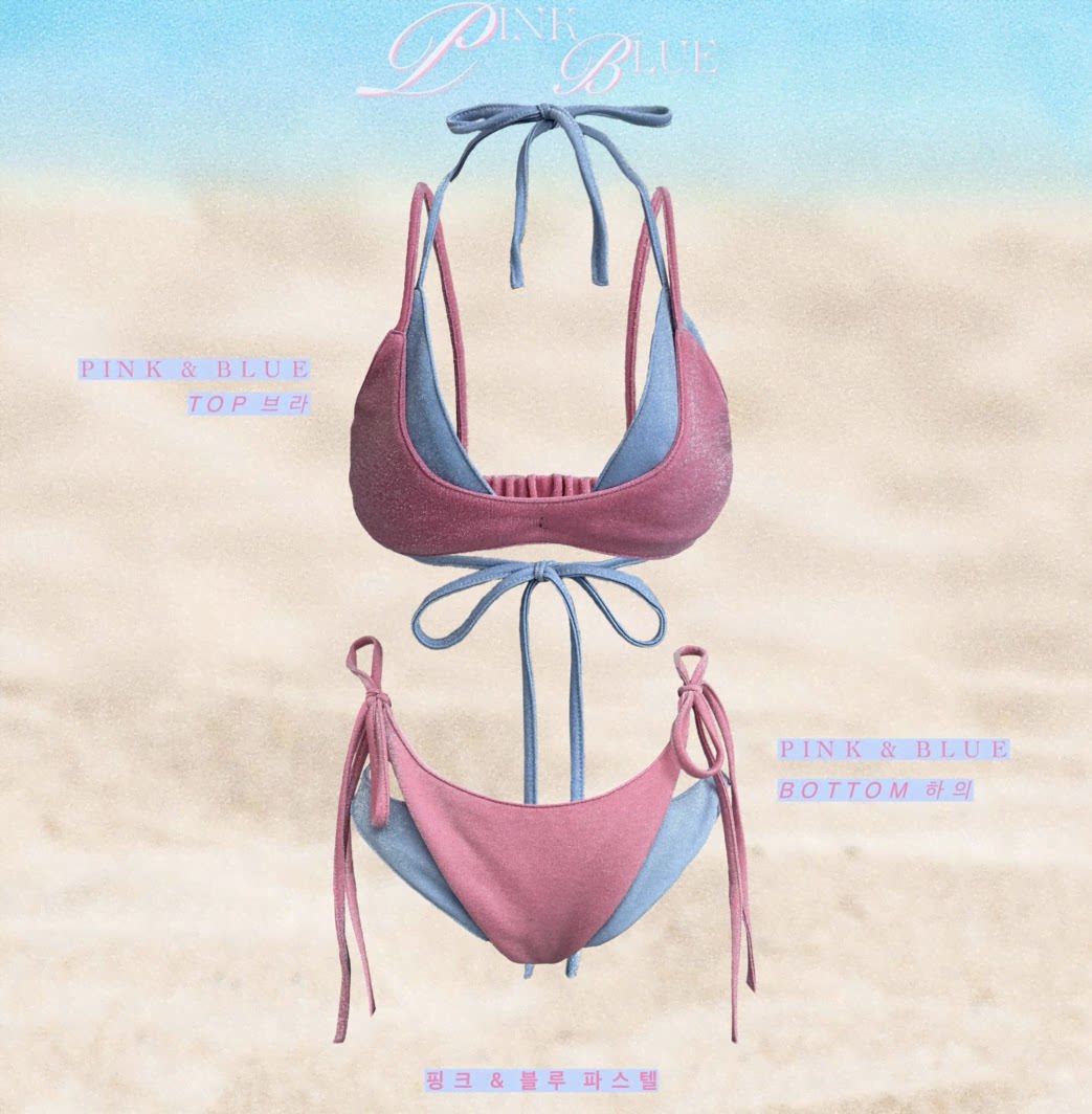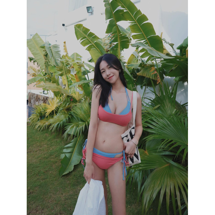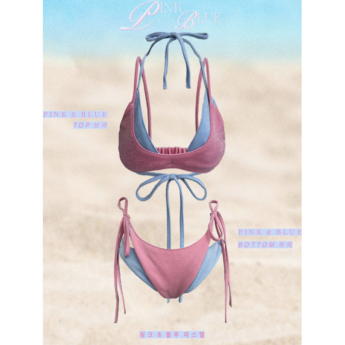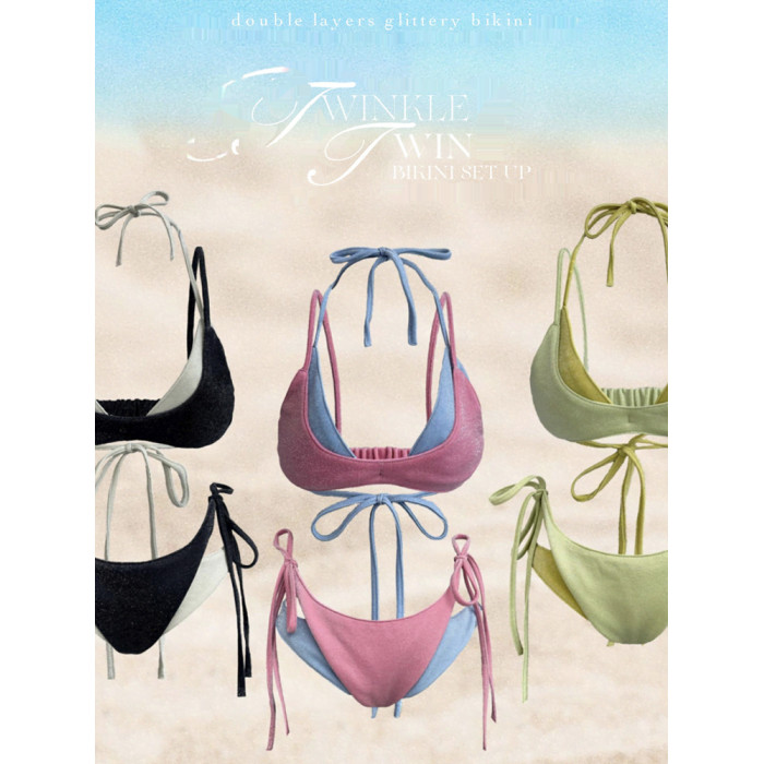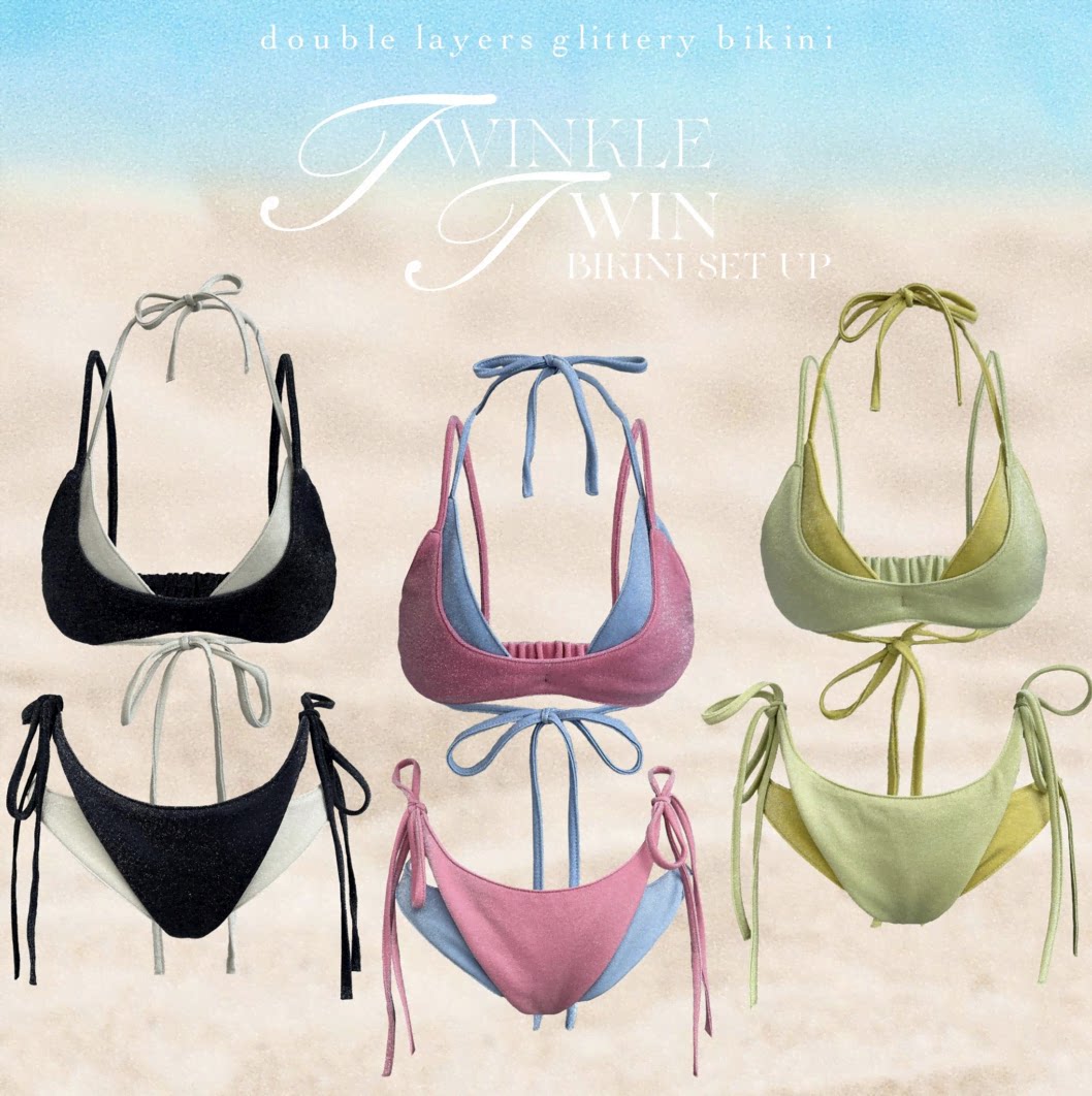 辣妹自製撞色曡穿比基尼四件套女2025年新款海鹽薄荷度假分體泳衣