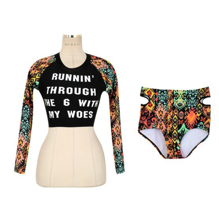 女泳衣字母三件套高腰平角長袖防曬水母衣潛水服溫泉泳裝
