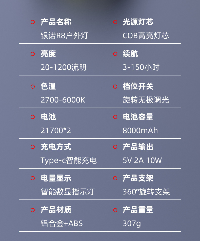 | 顔色 | R8皓月銀+掛鉤+充電線+收納包+燈罩 |