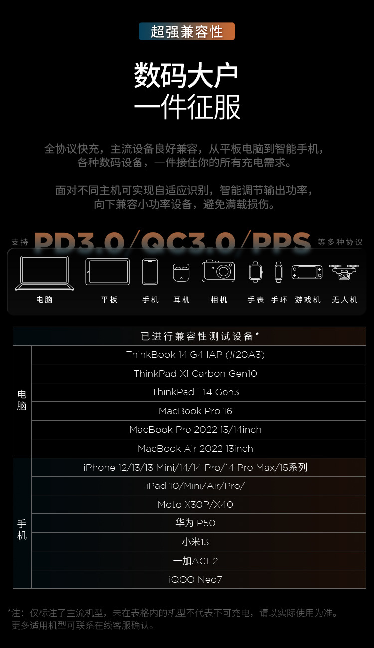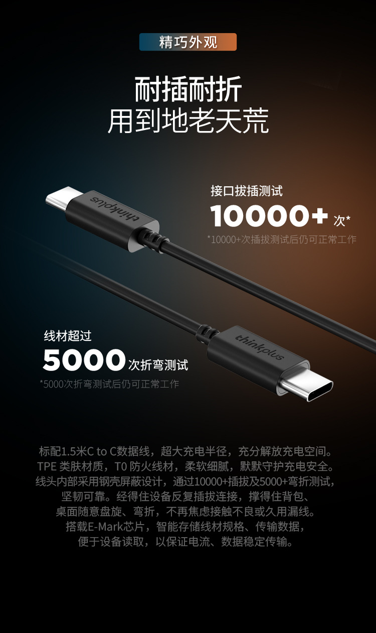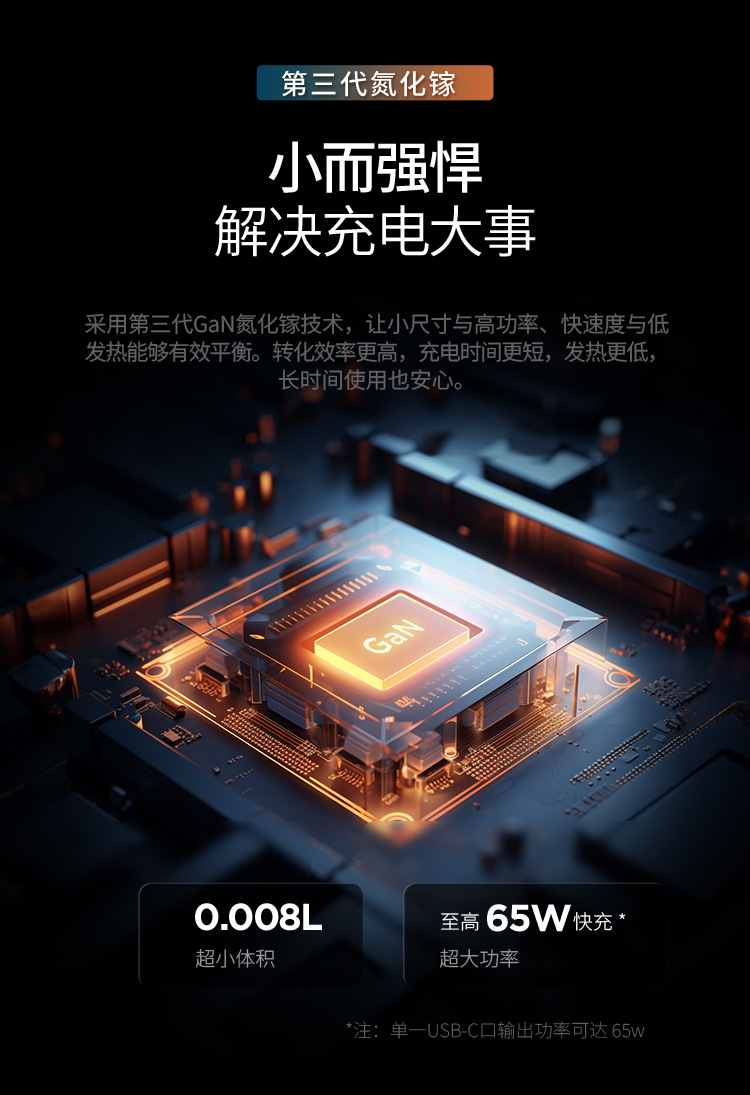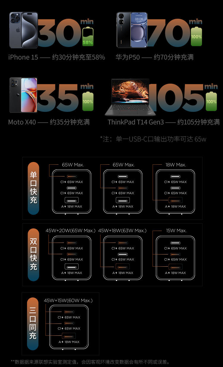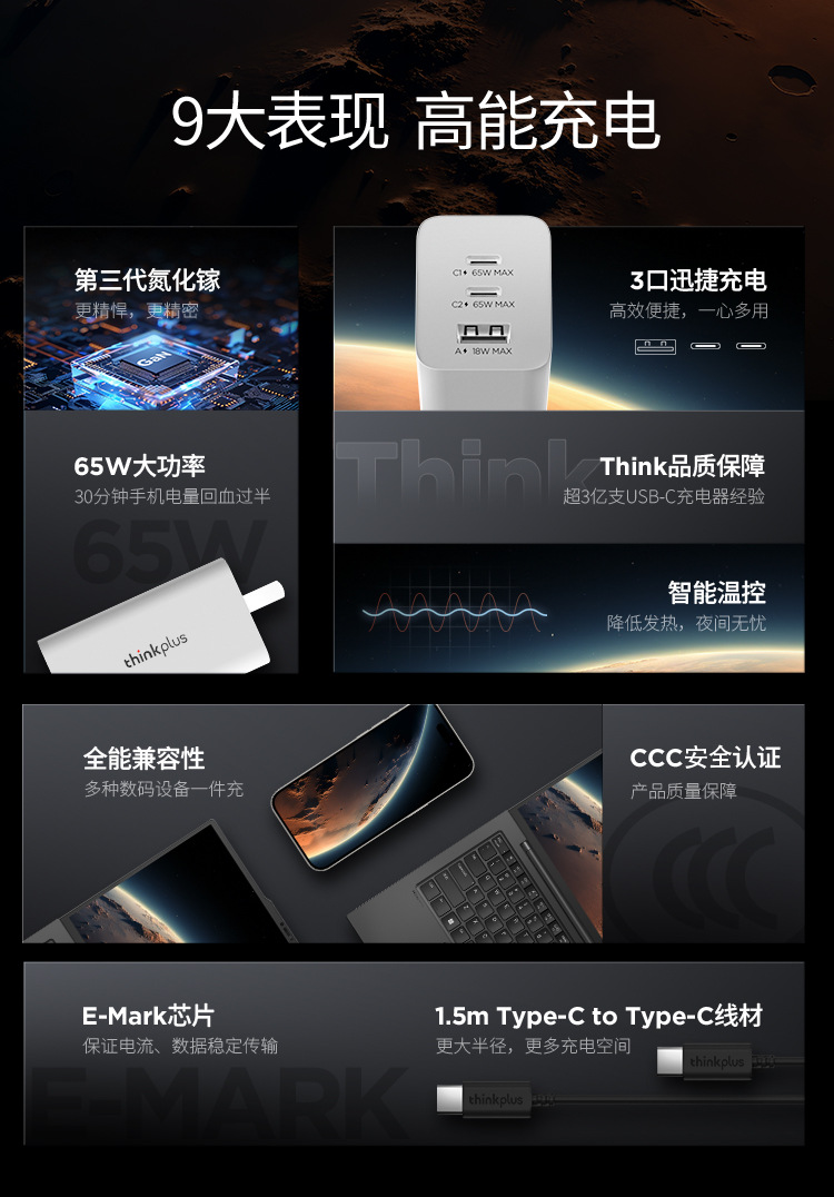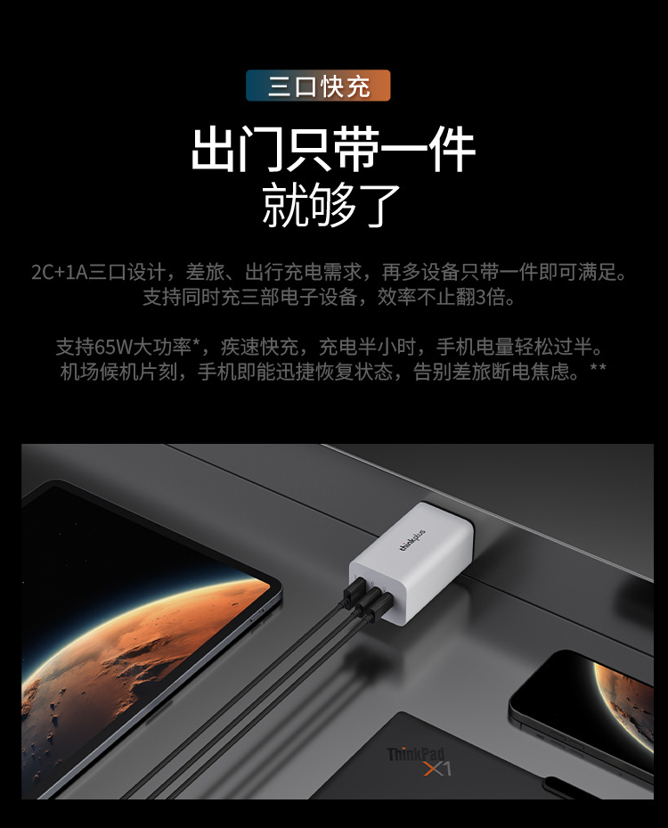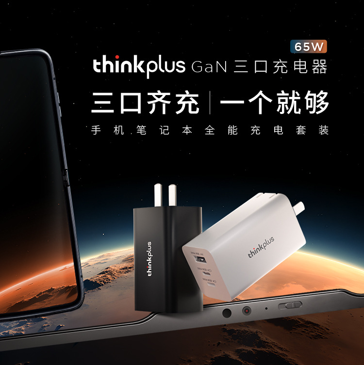聯想thinkplus三口PD65w氮化鎵充電器快充適用手機電腦充電頭禮品