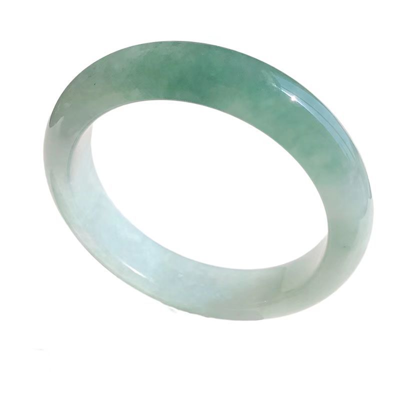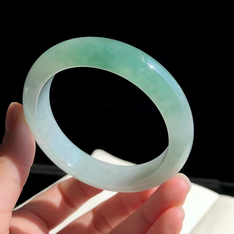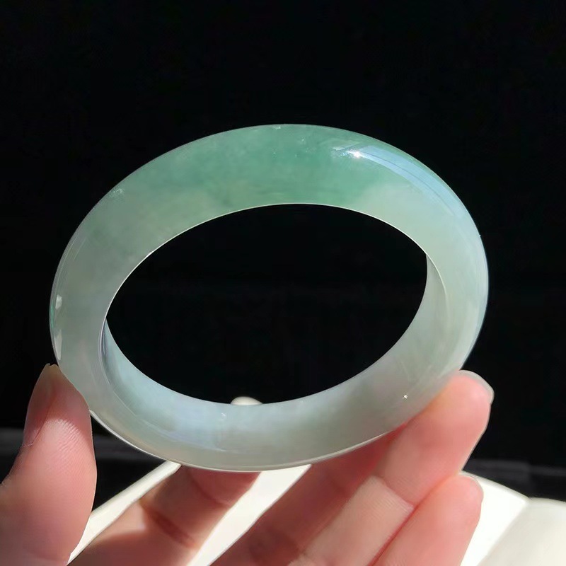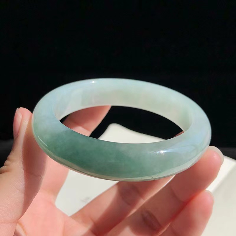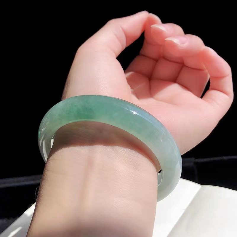 緬甸翡翠玉手鐲冰種油青色淺綠單色飄花正圈圓條貴妃少女款玉鐲子