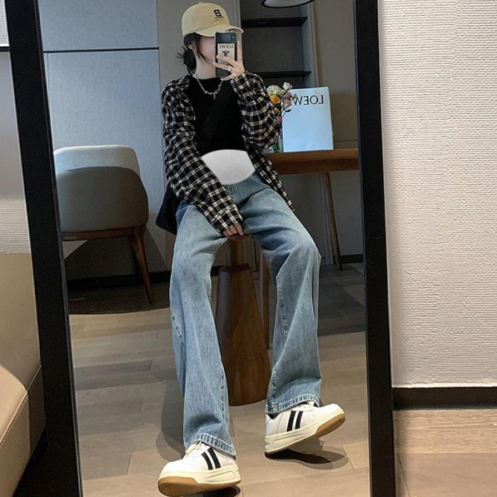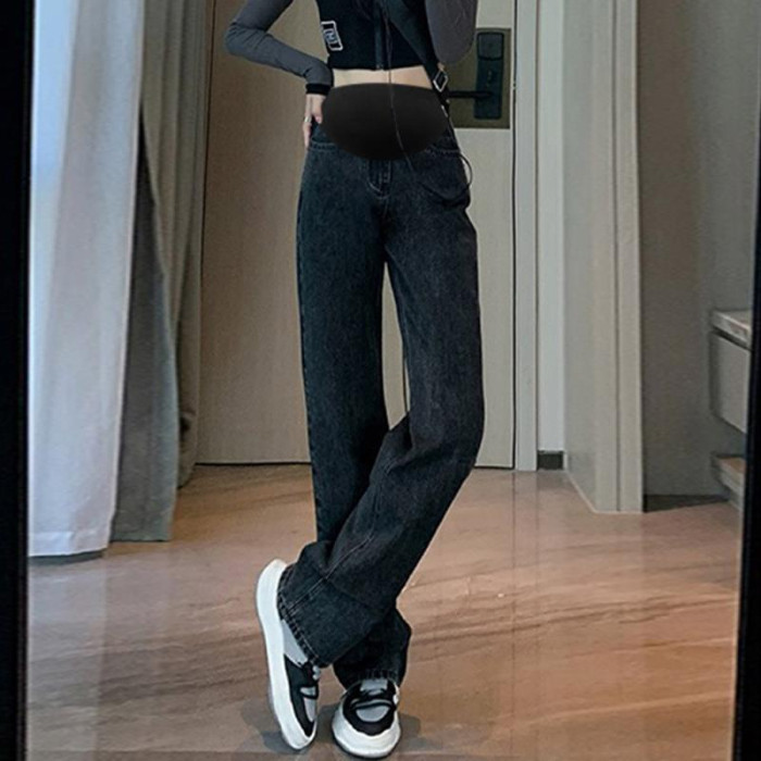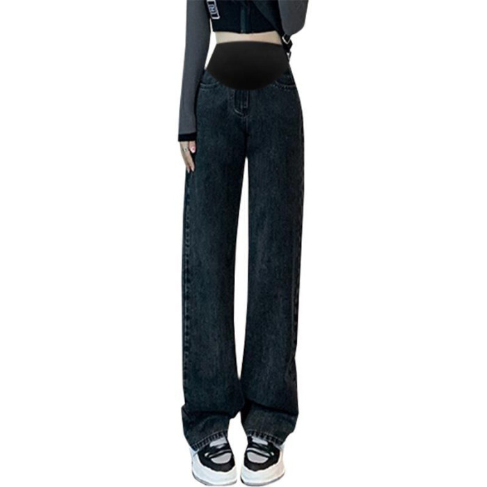 9513孕婦濶腿牛仔褲寬松秋款外穿顯瘦垂感直筒拖地褲高腰托腹長褲