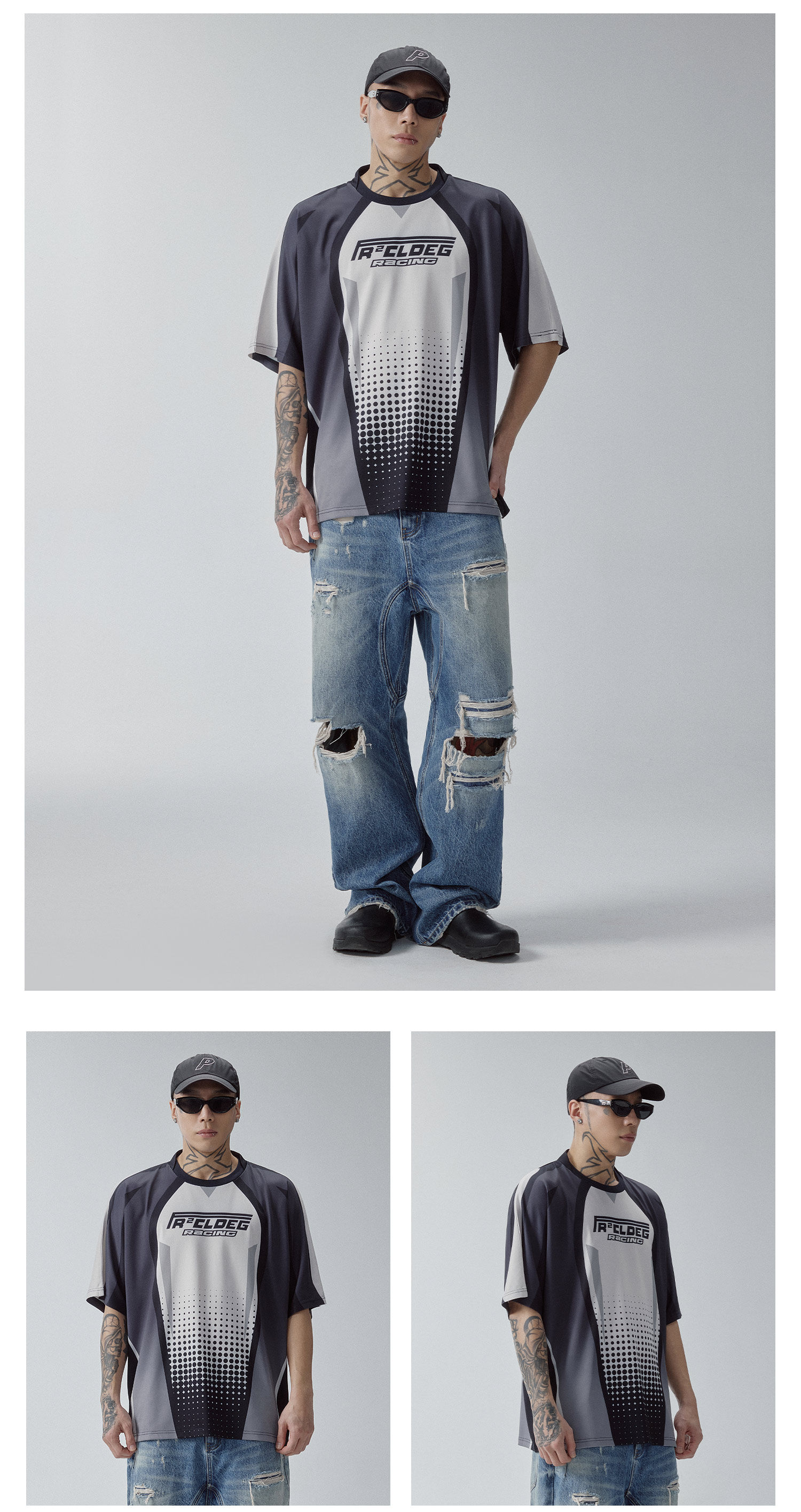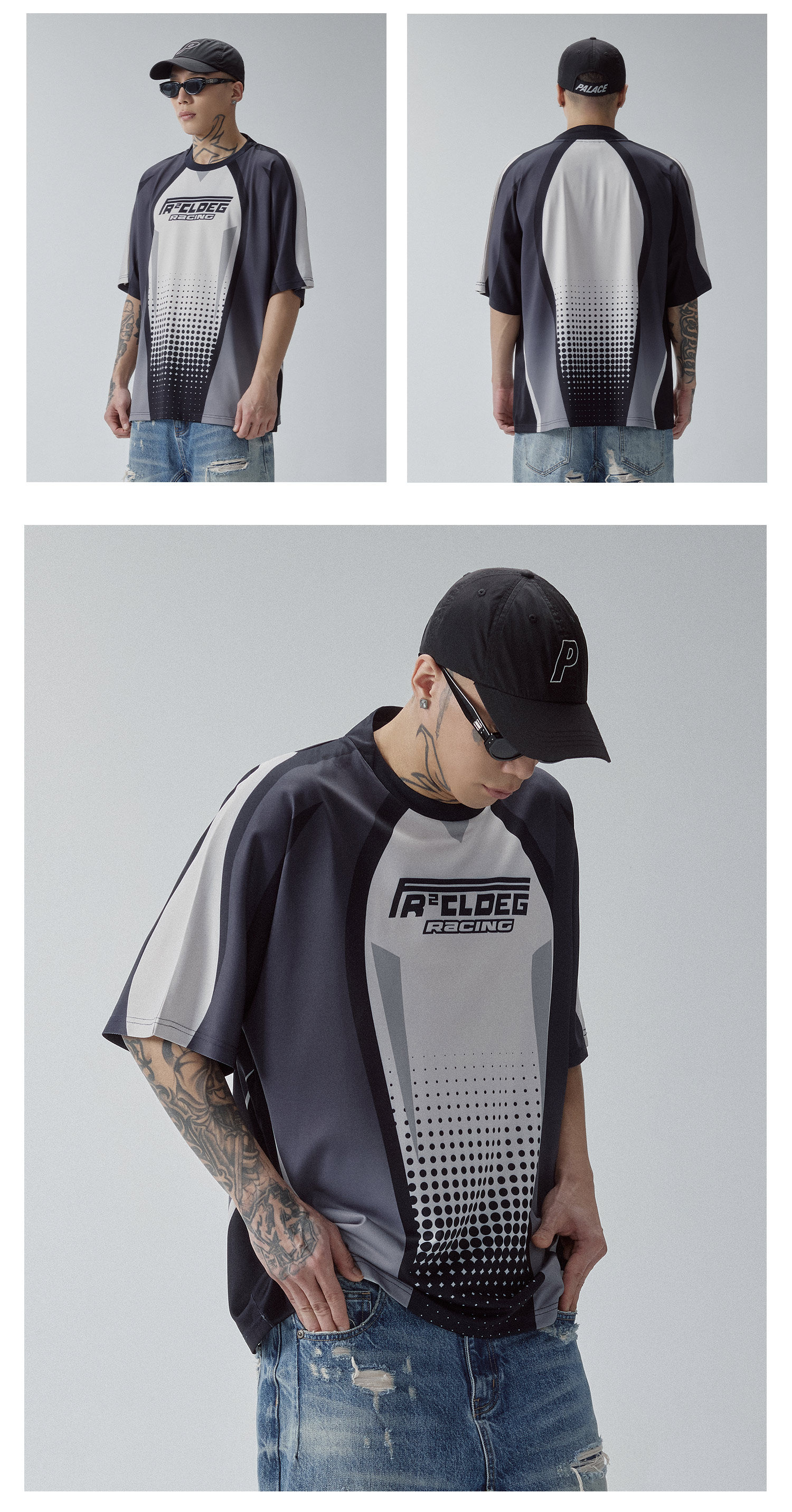 F2CE美潮短袖吸濕速乾復古休閒拼接印花撞色球衣運動上衣男T恤衫