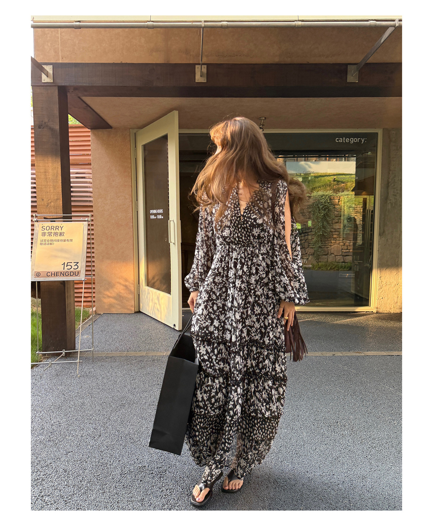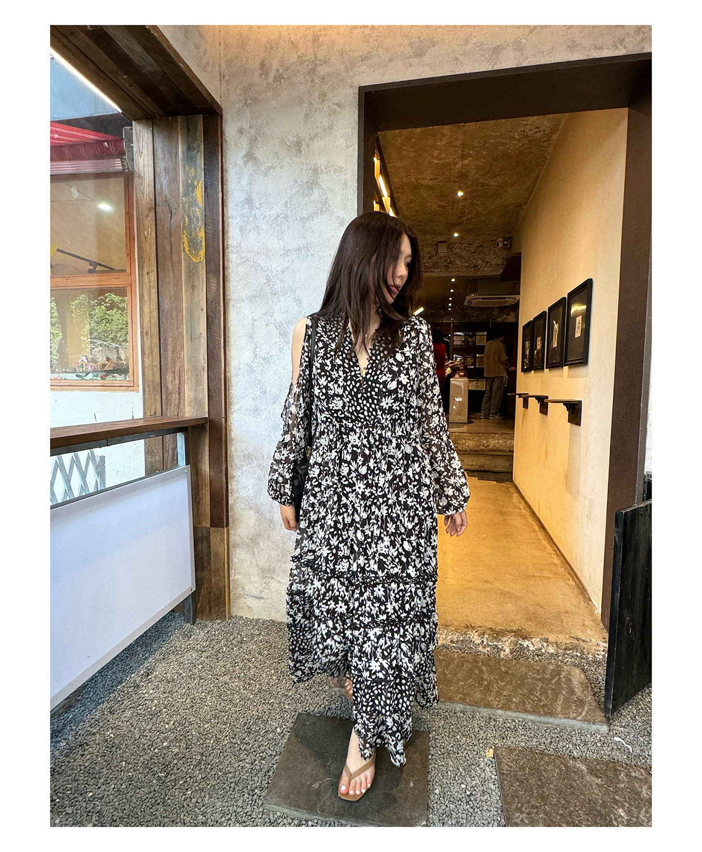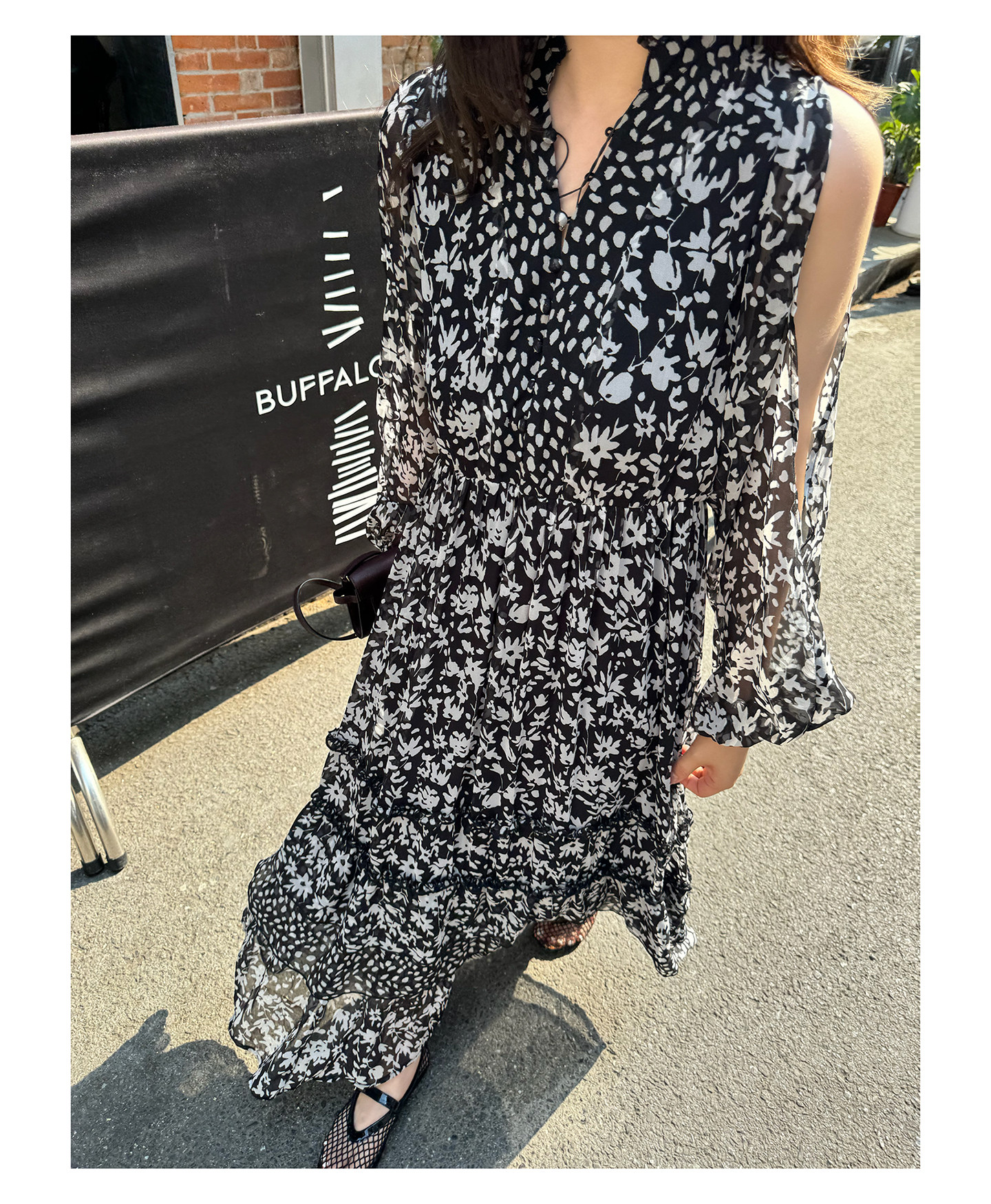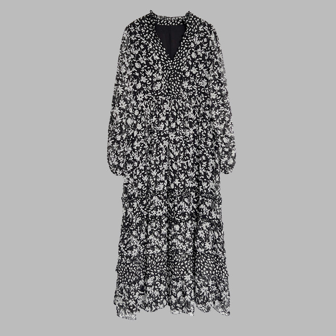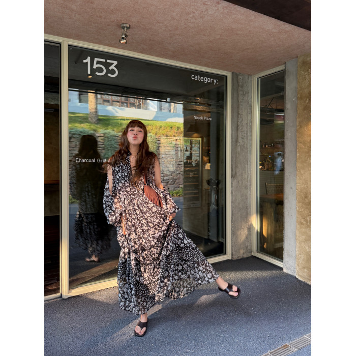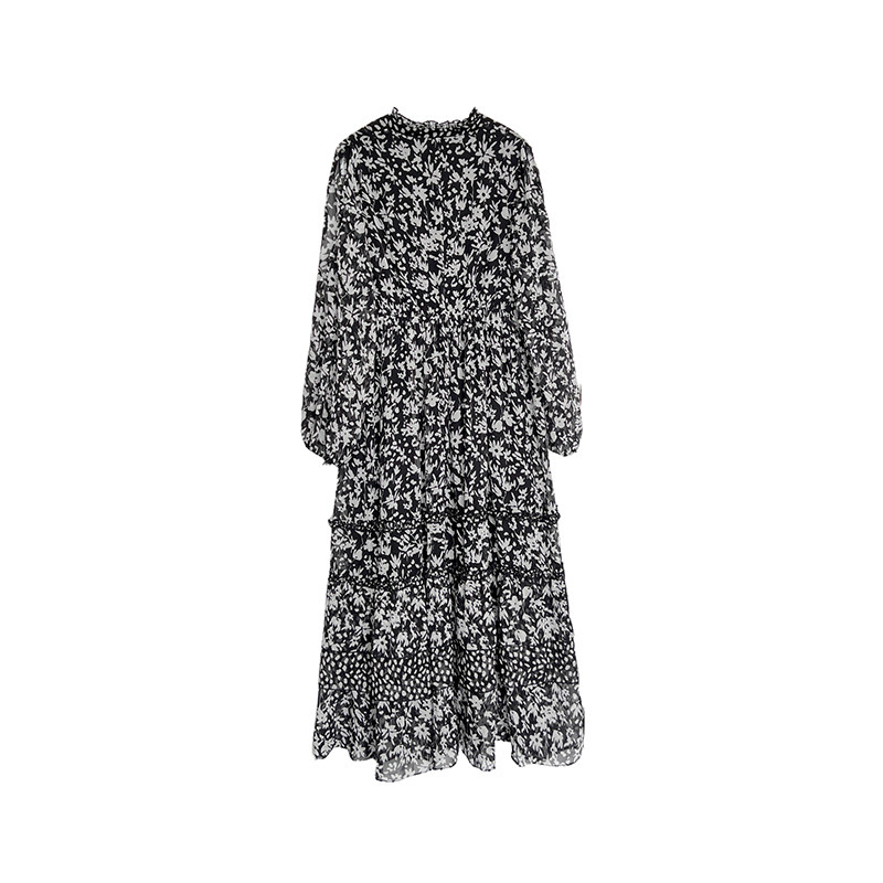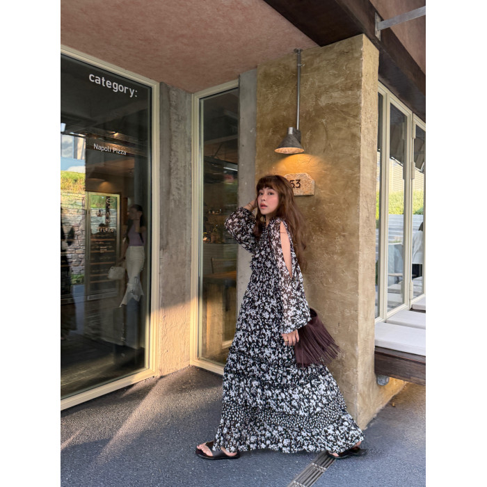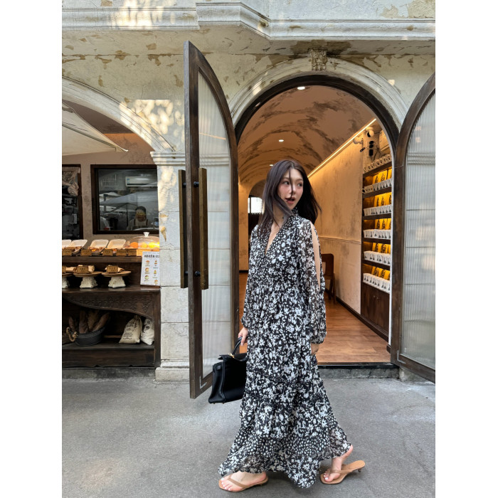 3ts法式黑色碎花v領連衣裙露肩雪紡印花度假花卉長裙