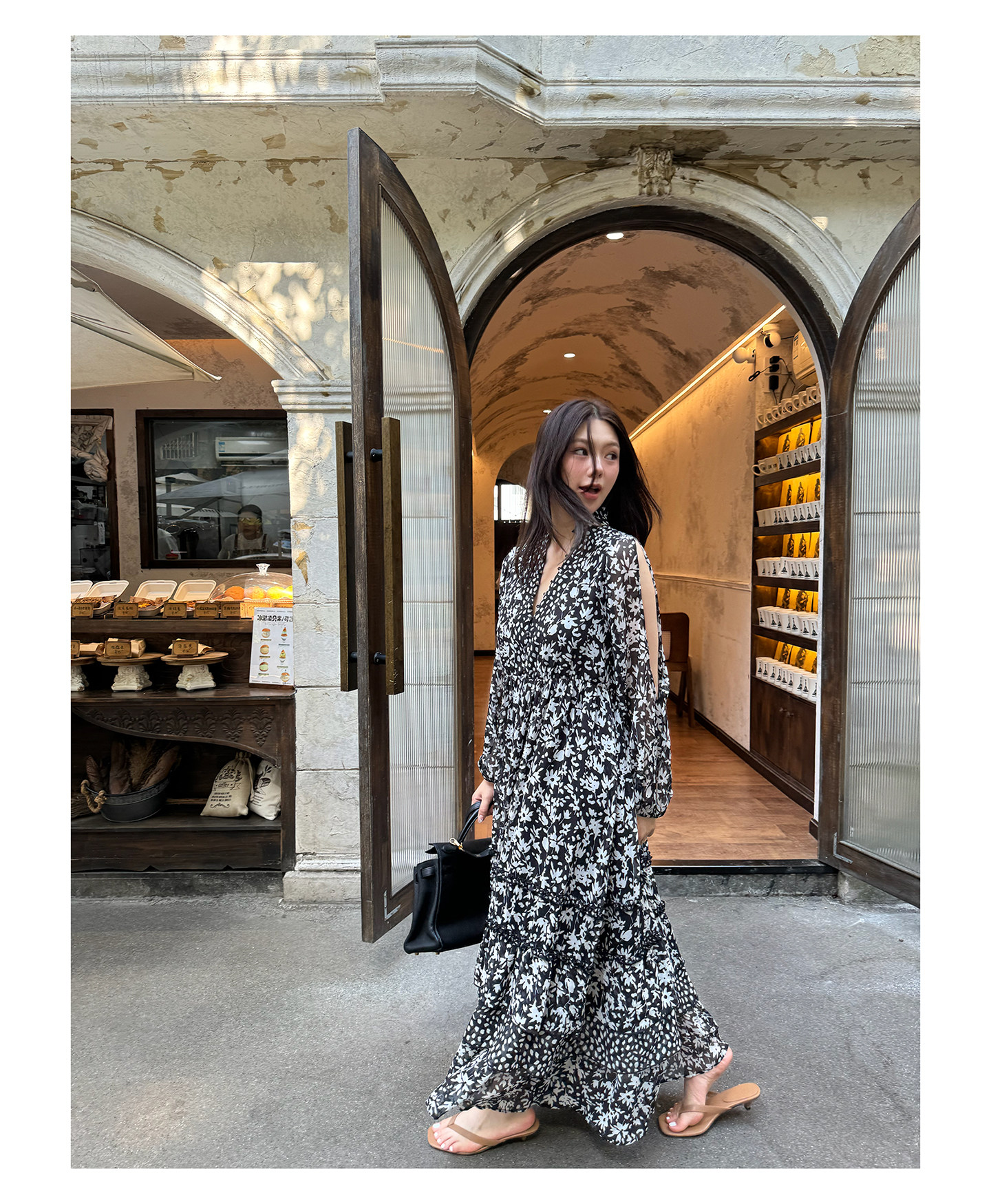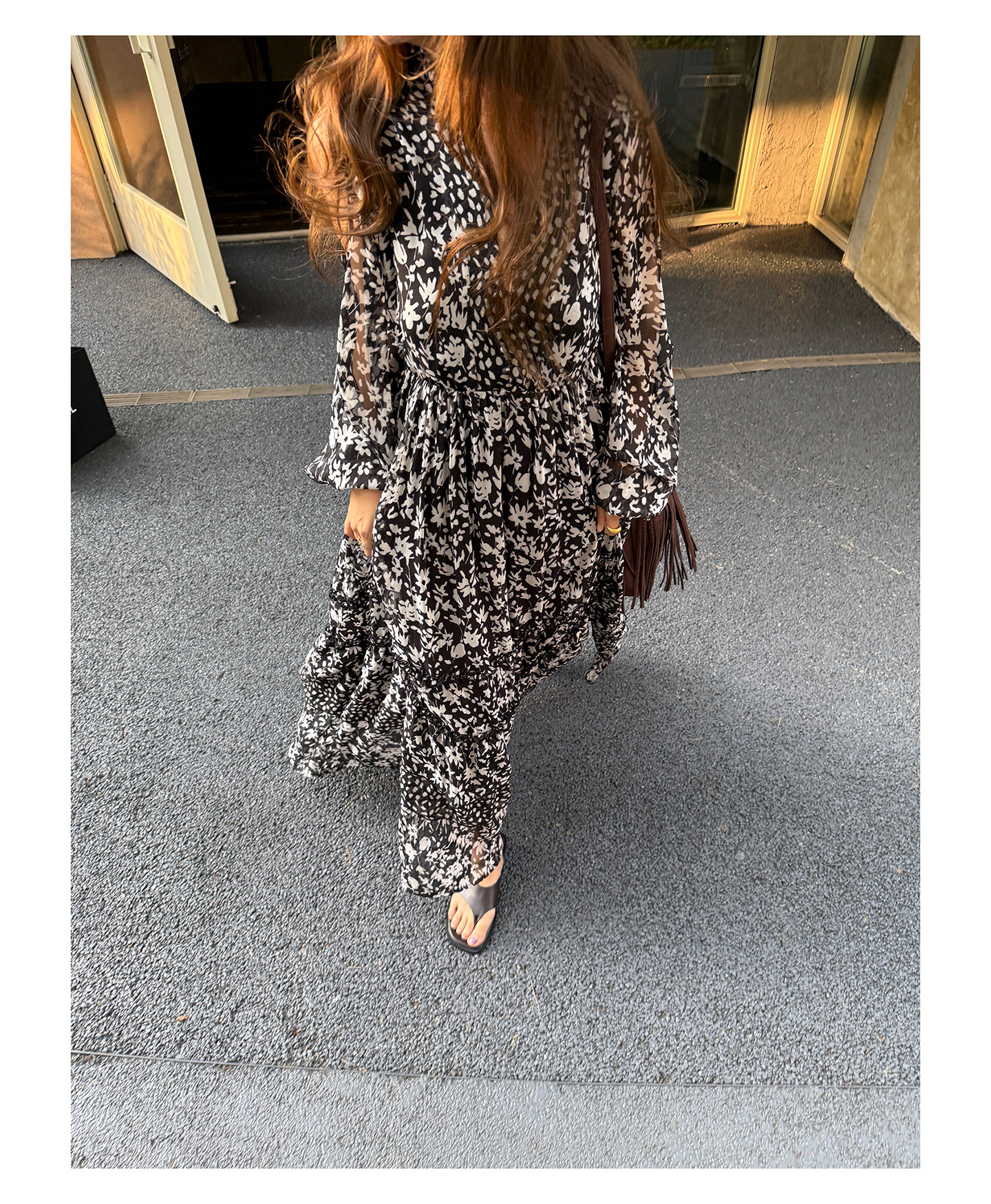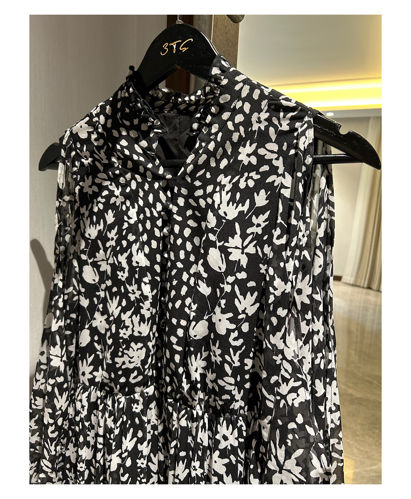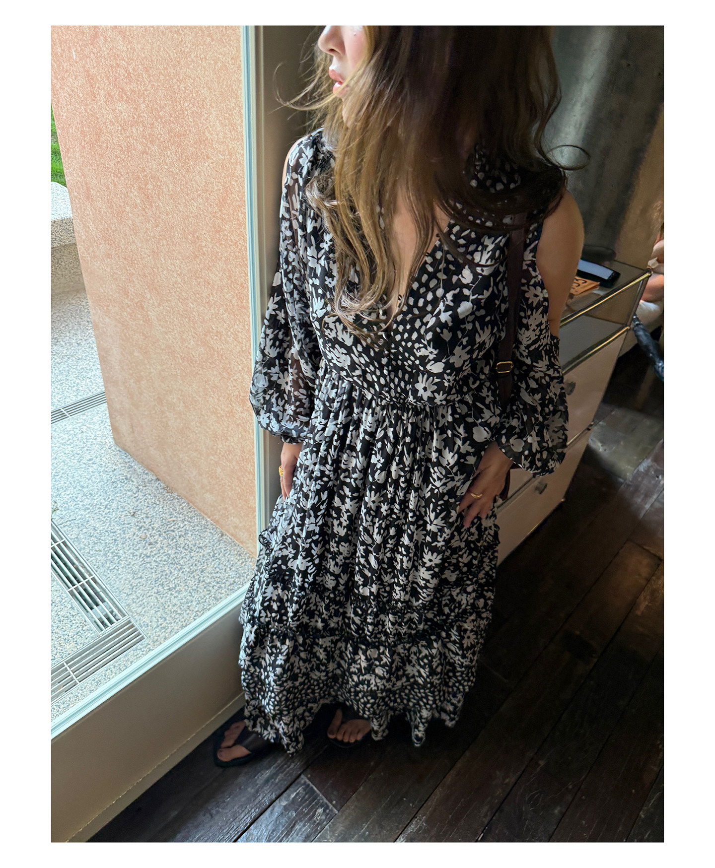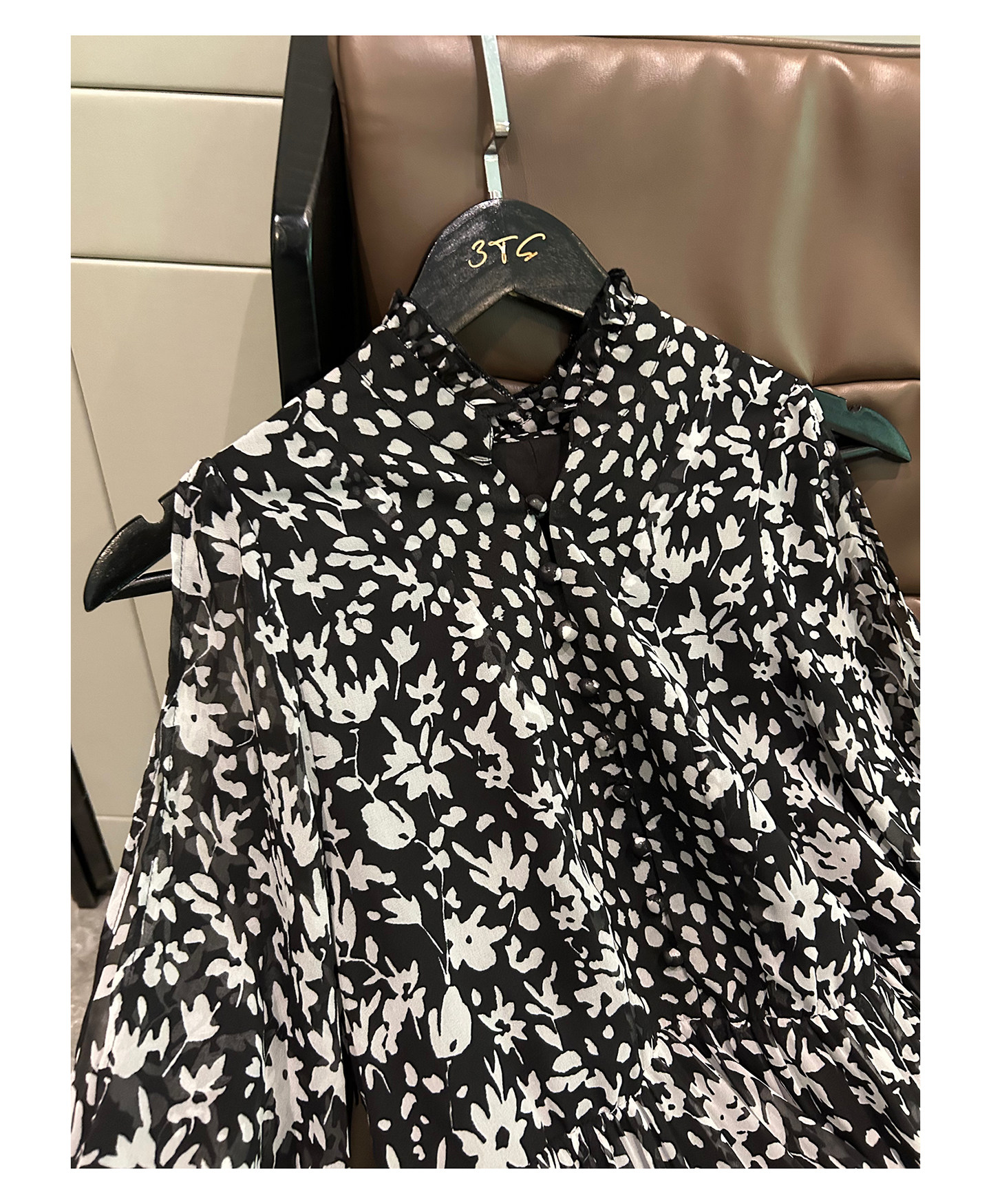 3ts法式黑色碎花v領連衣裙露肩雪紡印花度假花卉長裙