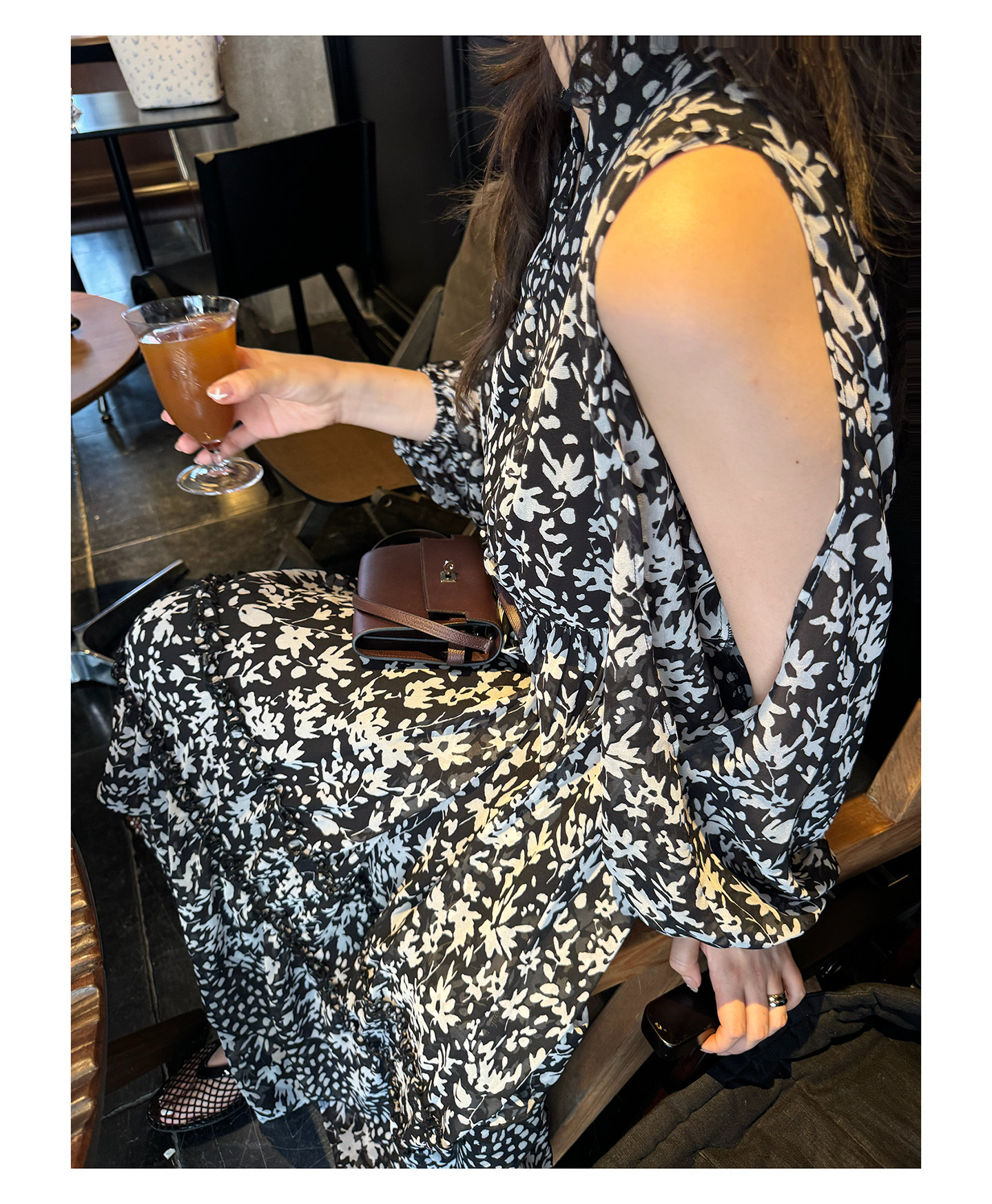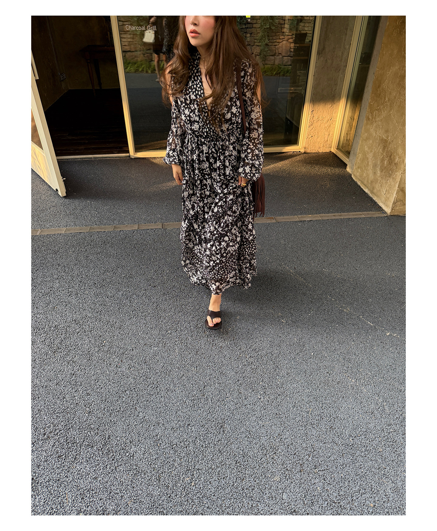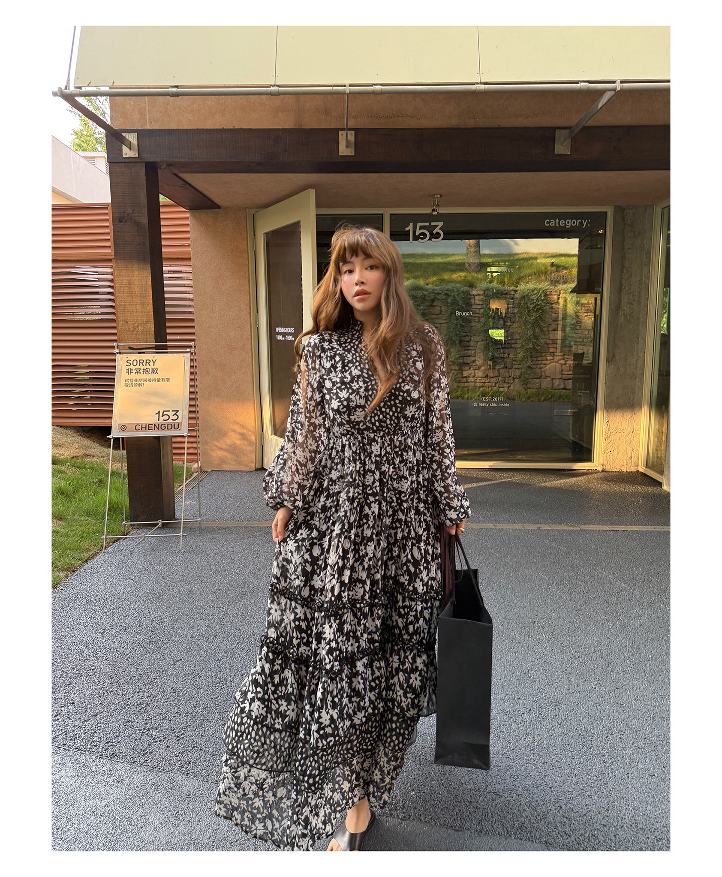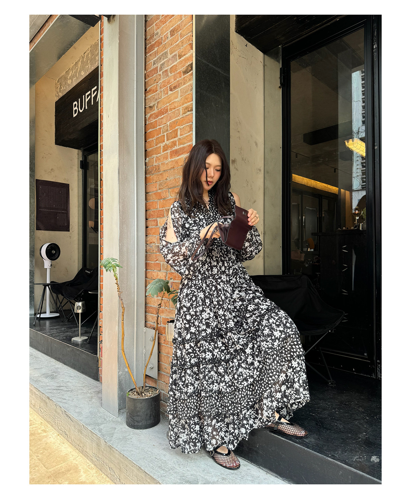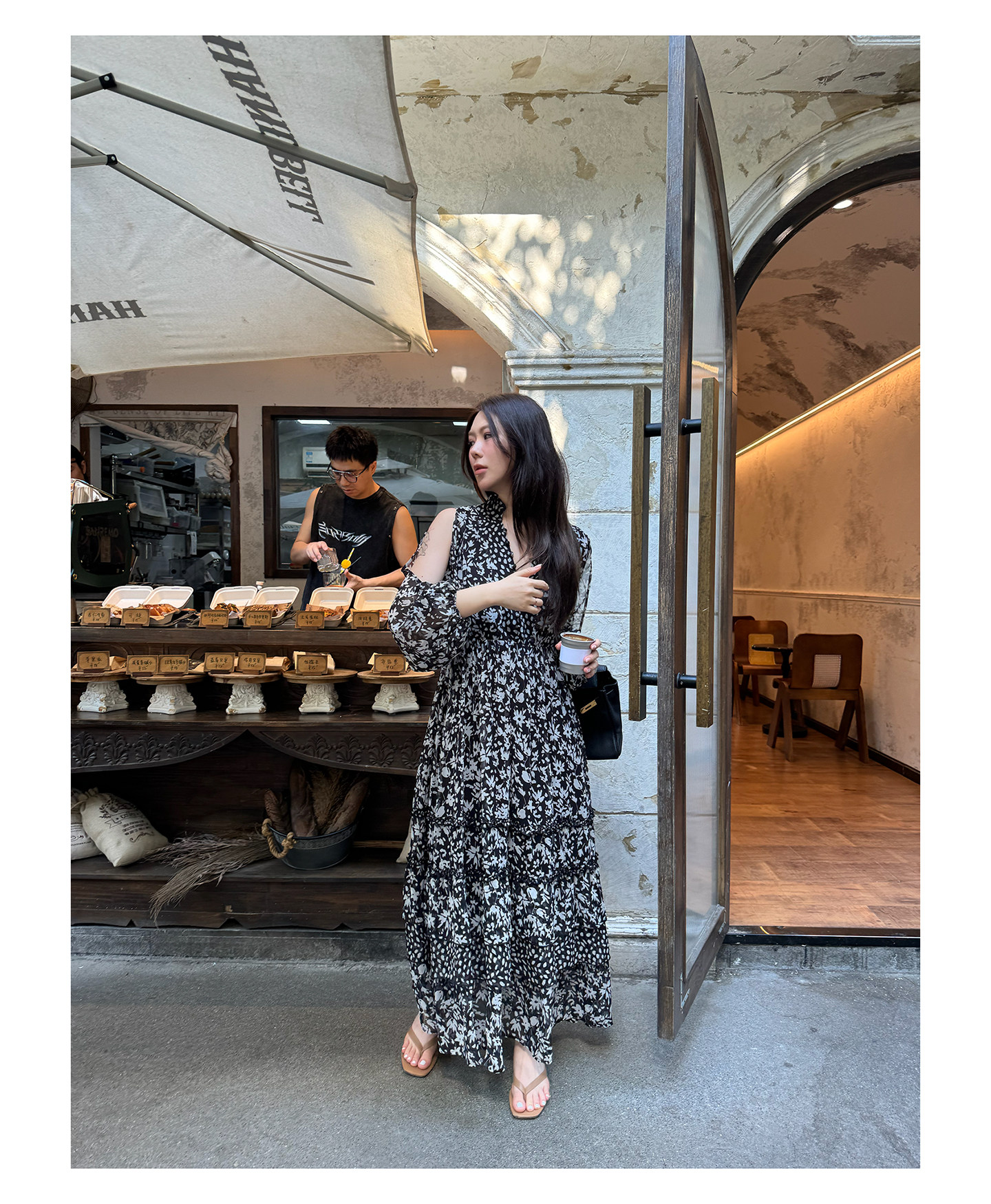 3ts法式黑色碎花v領連衣裙露肩雪紡印花度假花卉長裙