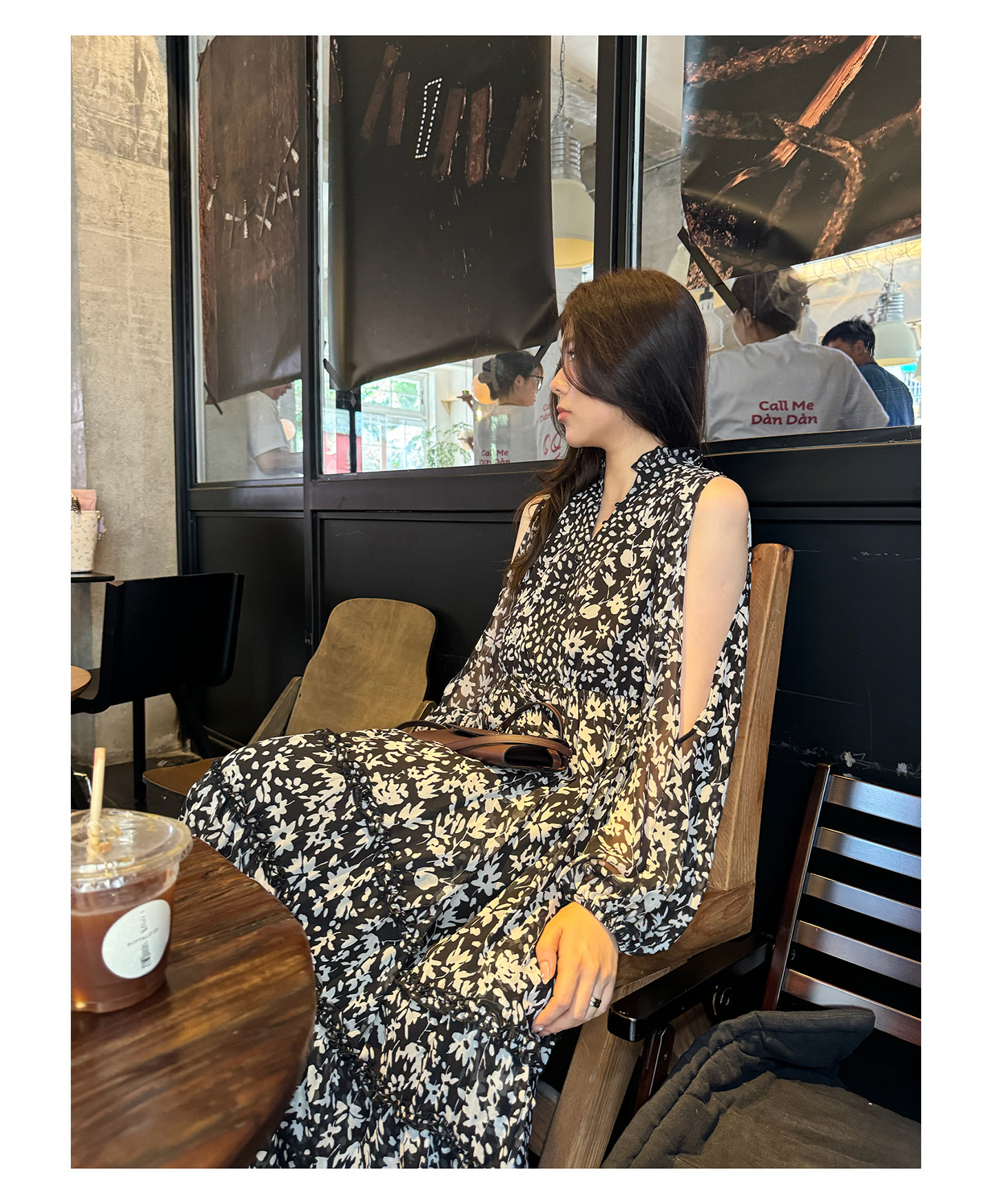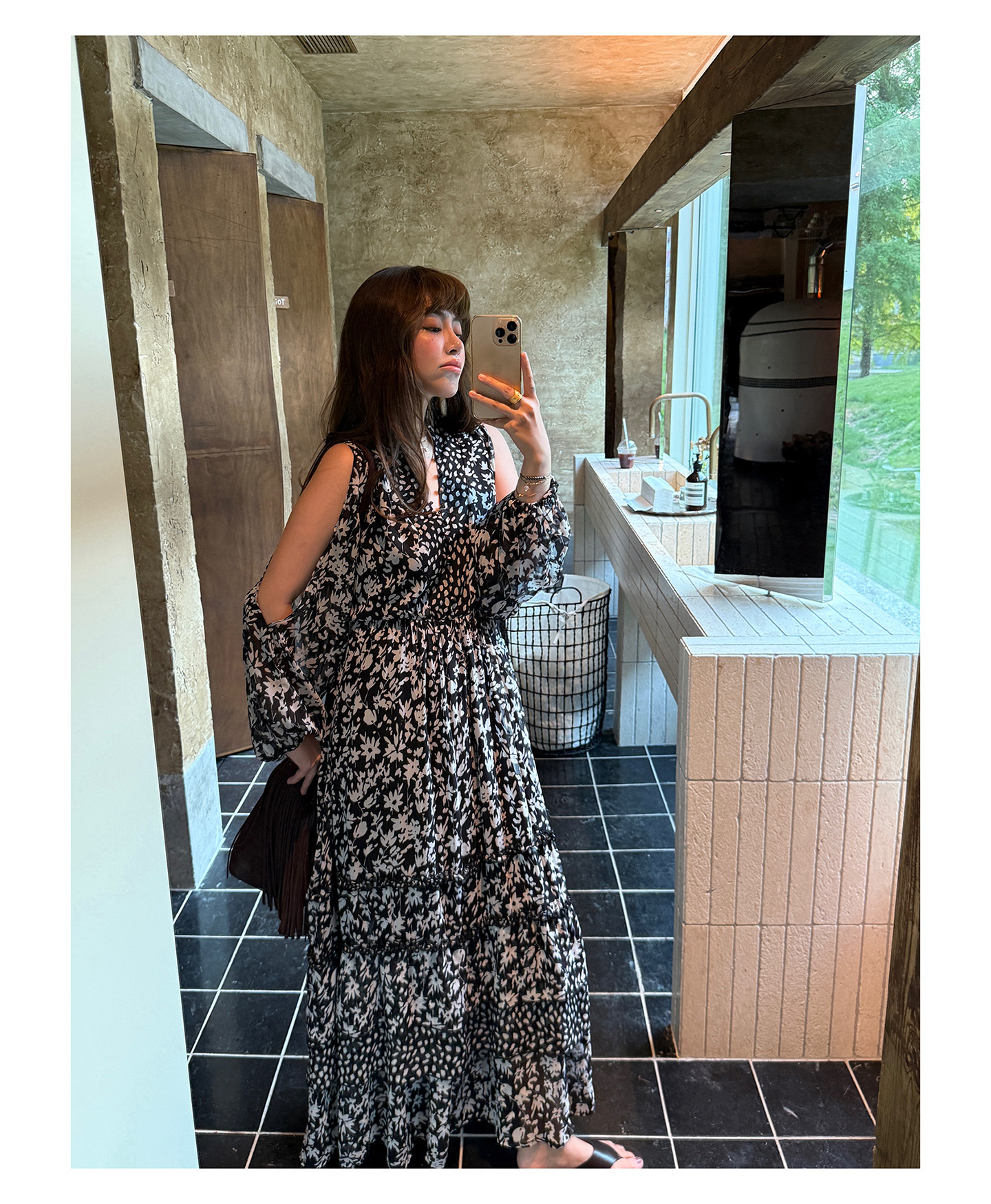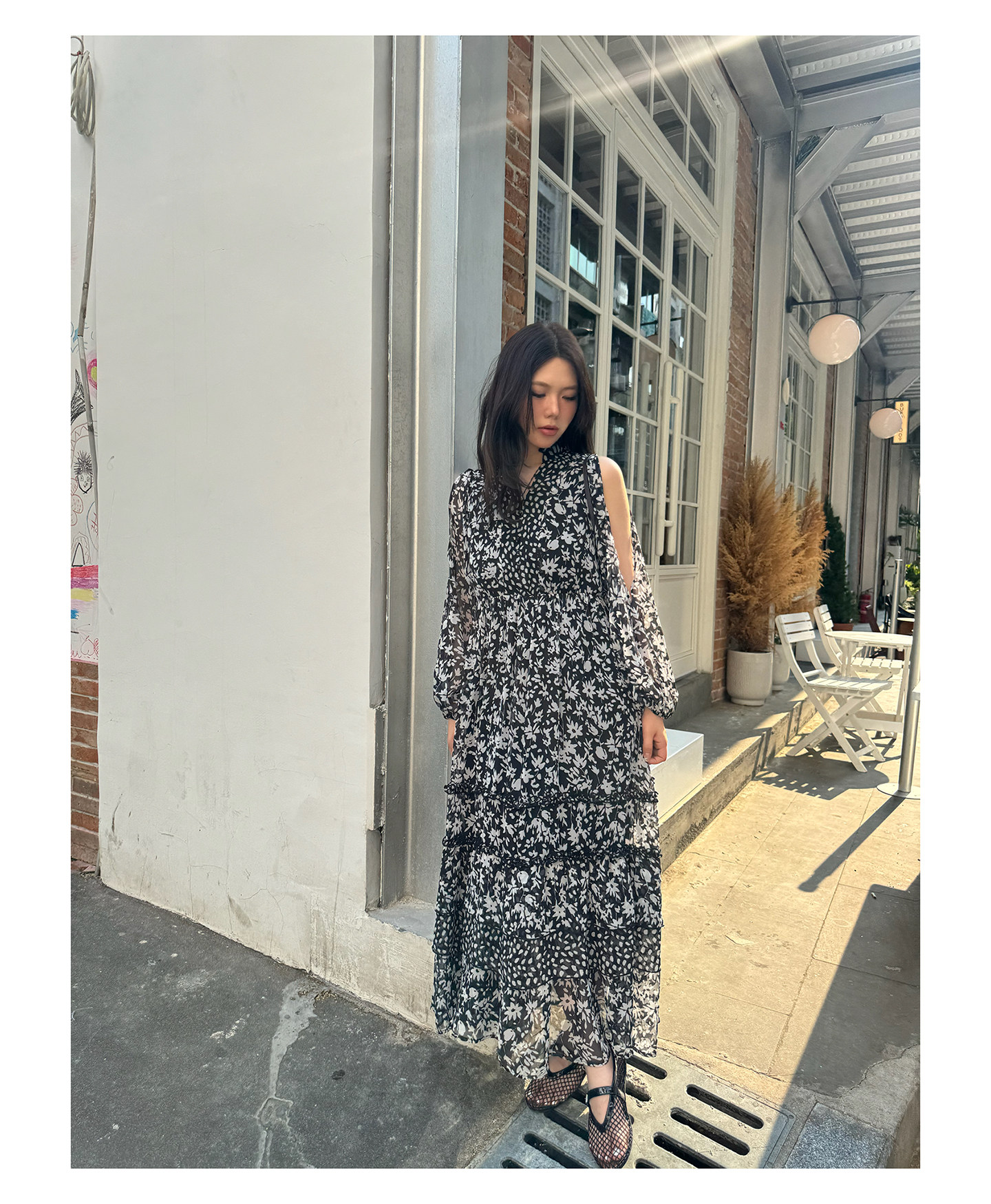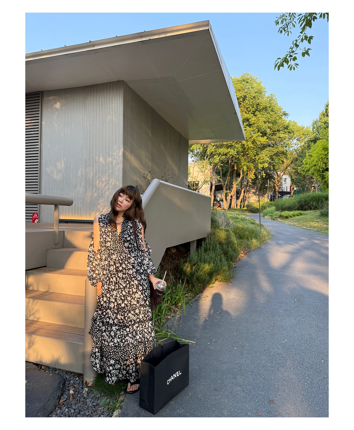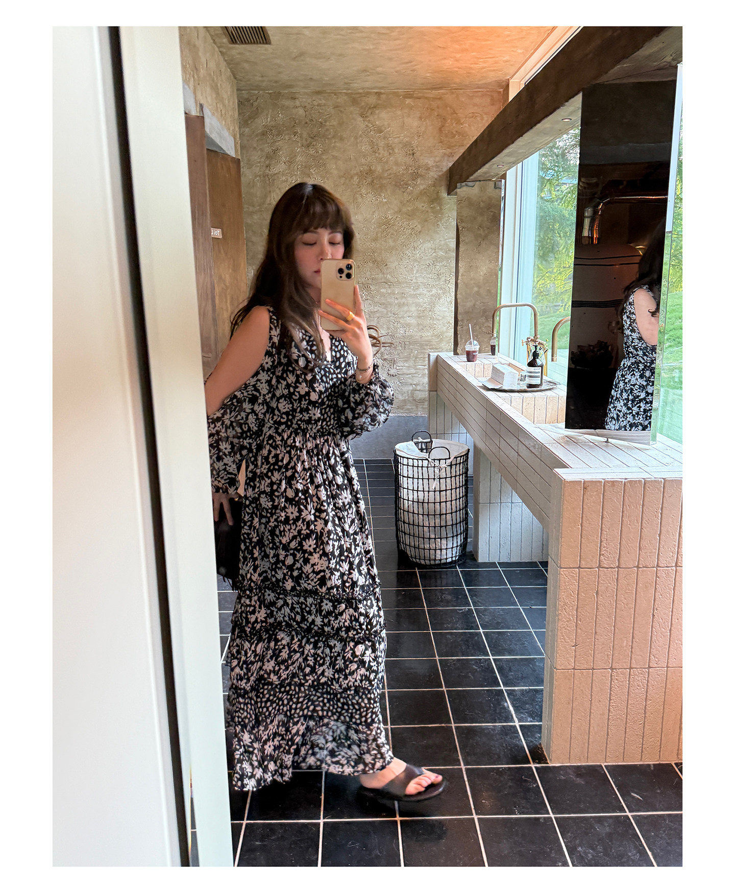 3ts法式黑色碎花v領連衣裙露肩雪紡印花度假花卉長裙