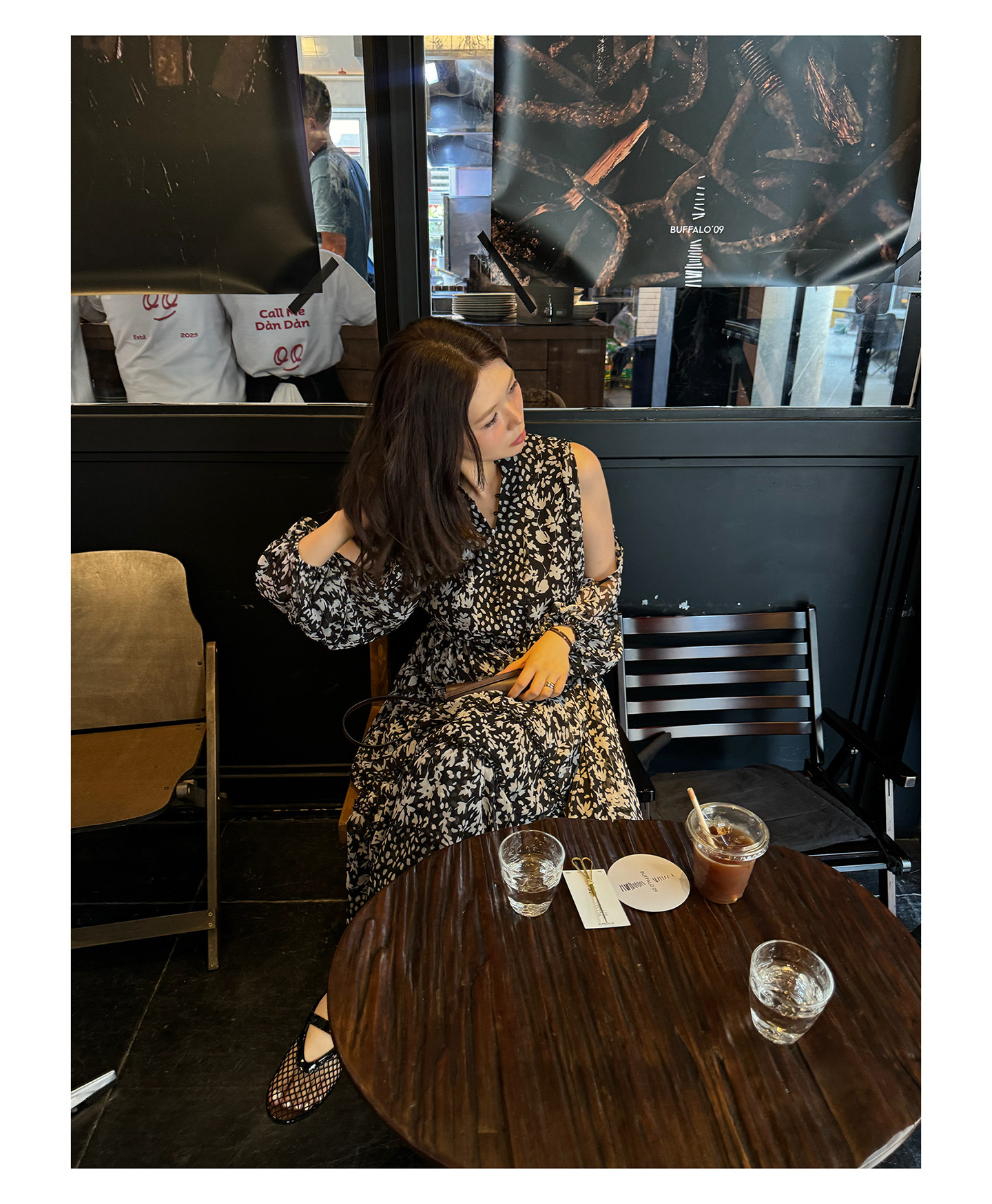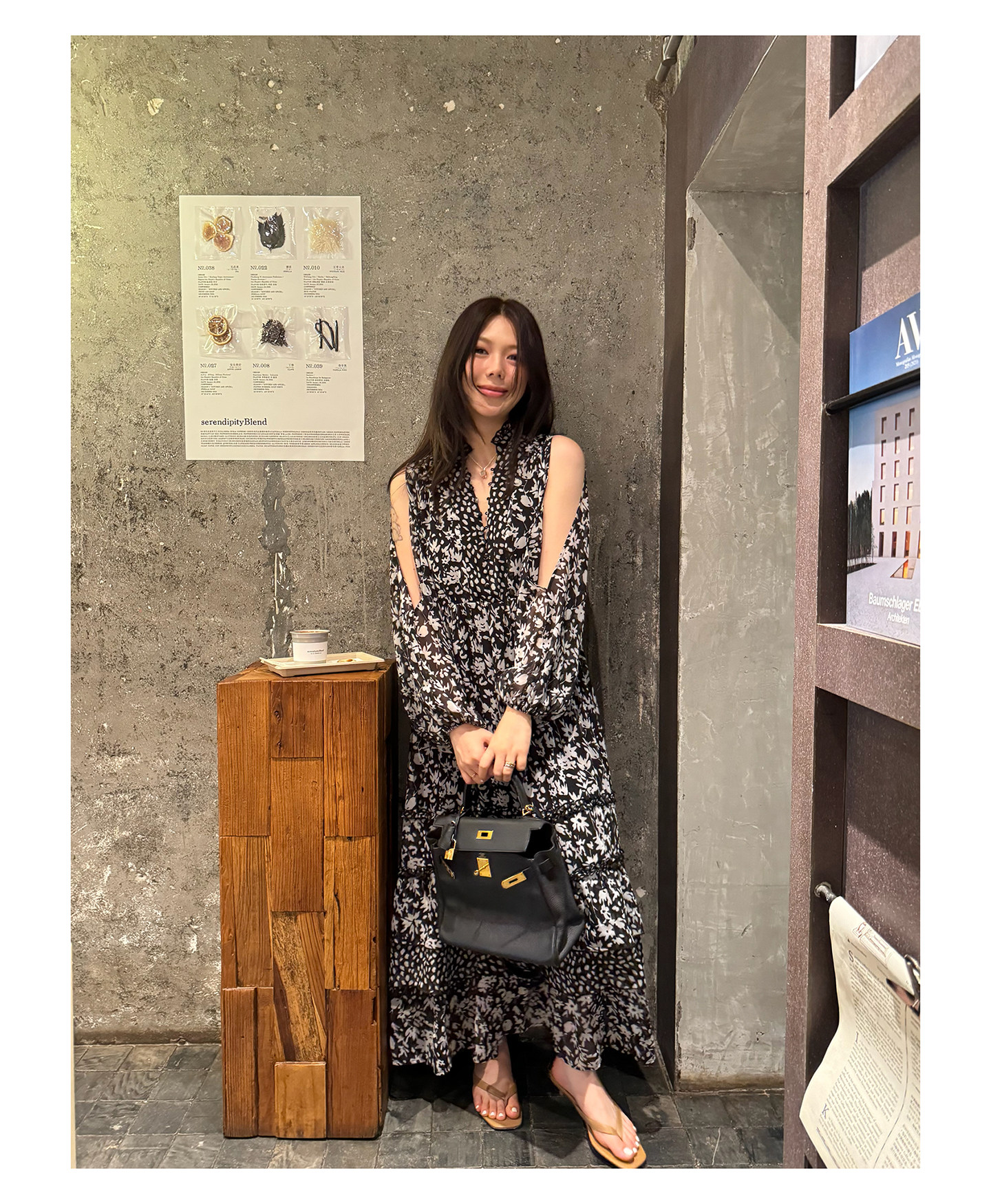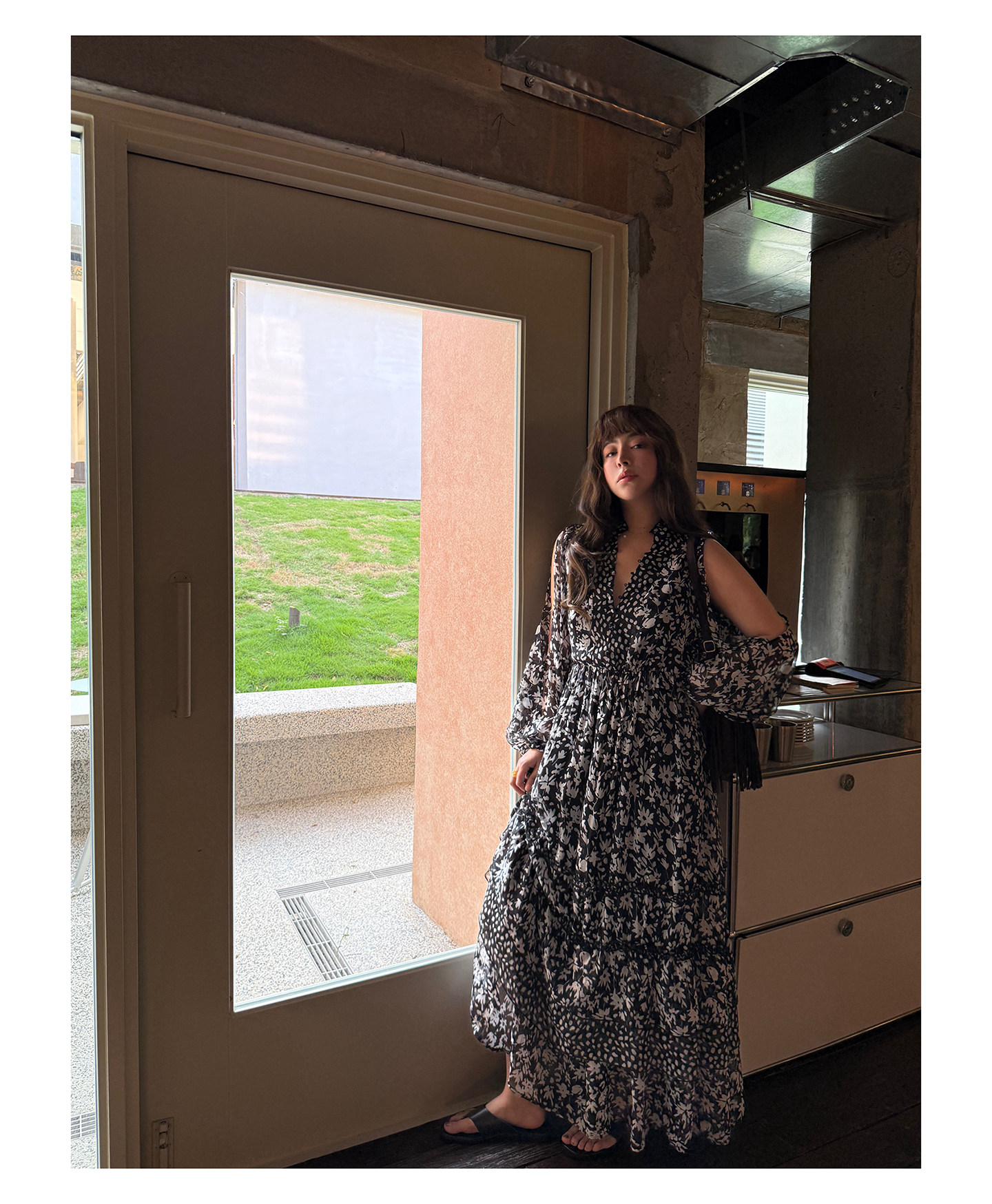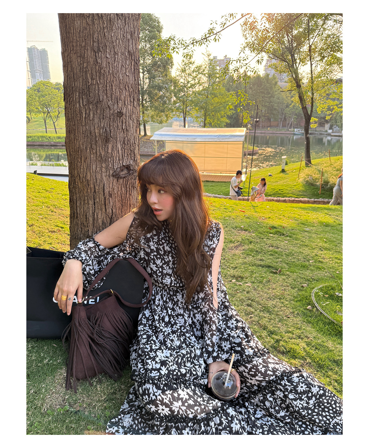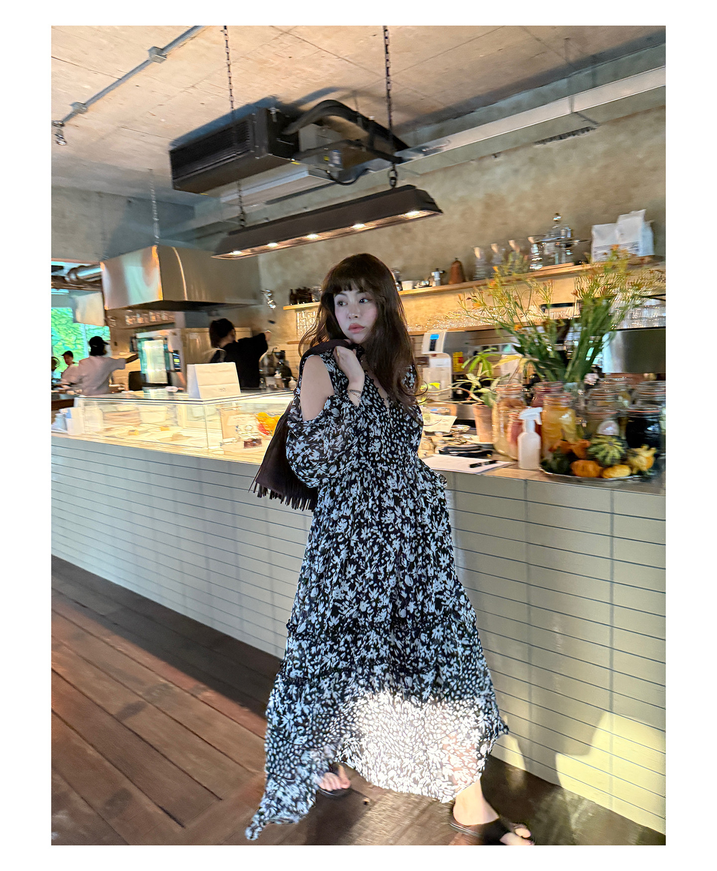 3ts法式黑色碎花v領連衣裙露肩雪紡印花度假花卉長裙