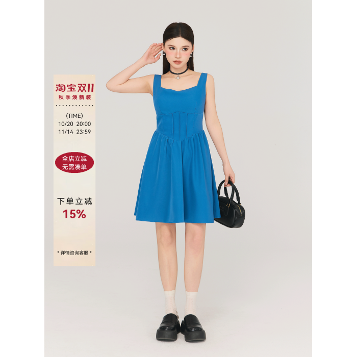 吊帶連衣裙女夏2025新款大碼胖mm藍色收腰巨顯瘦a字小個子吊帶裙