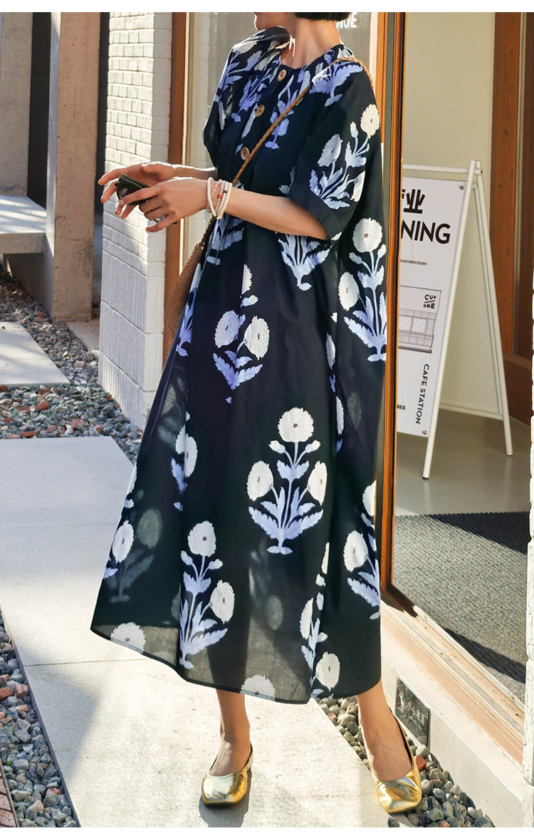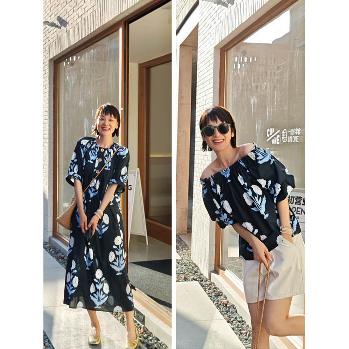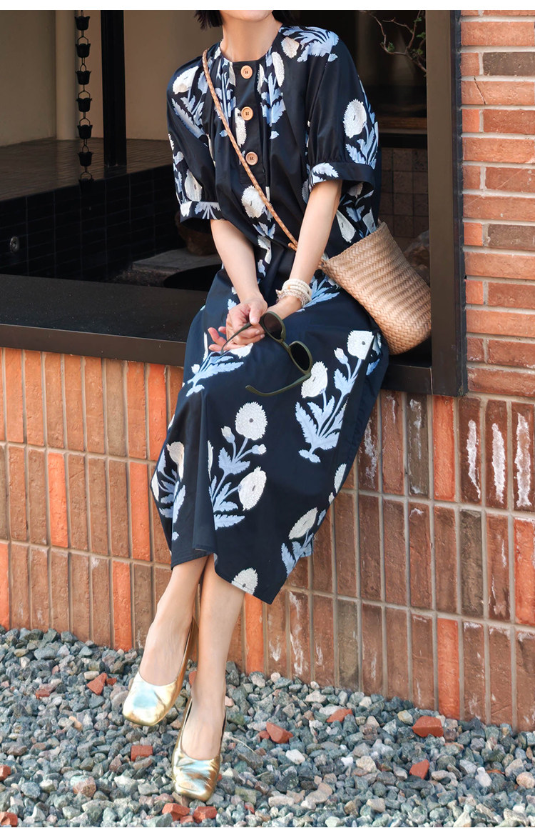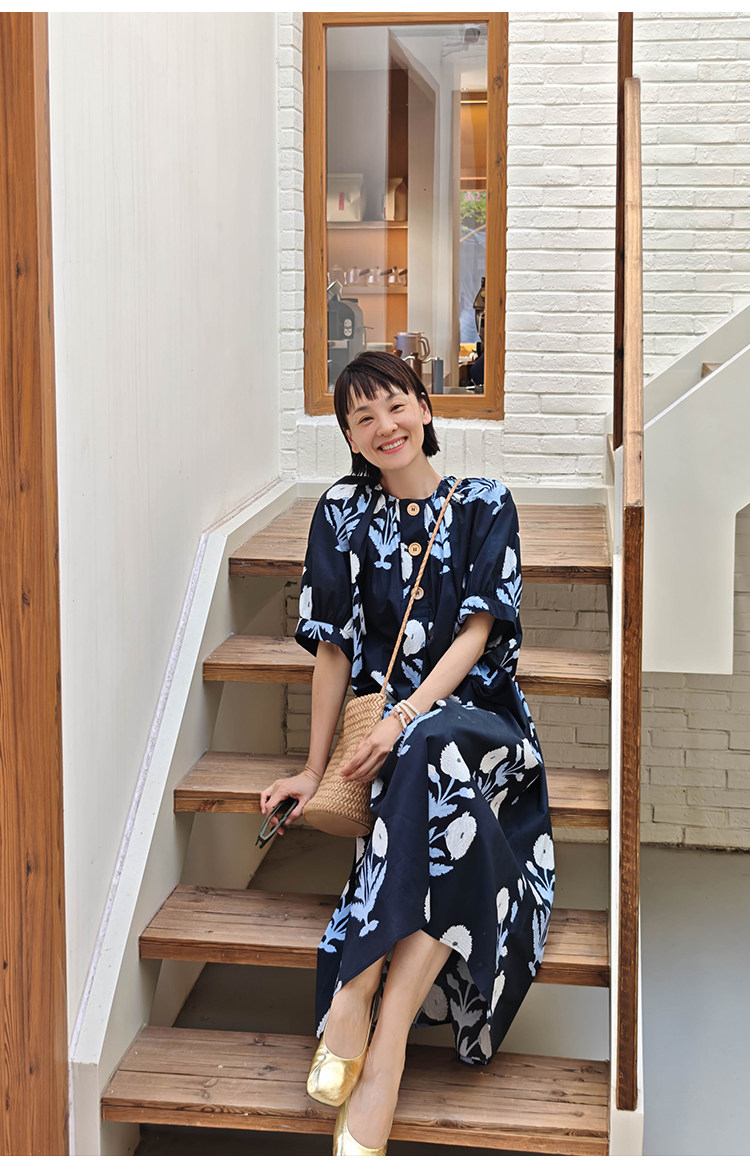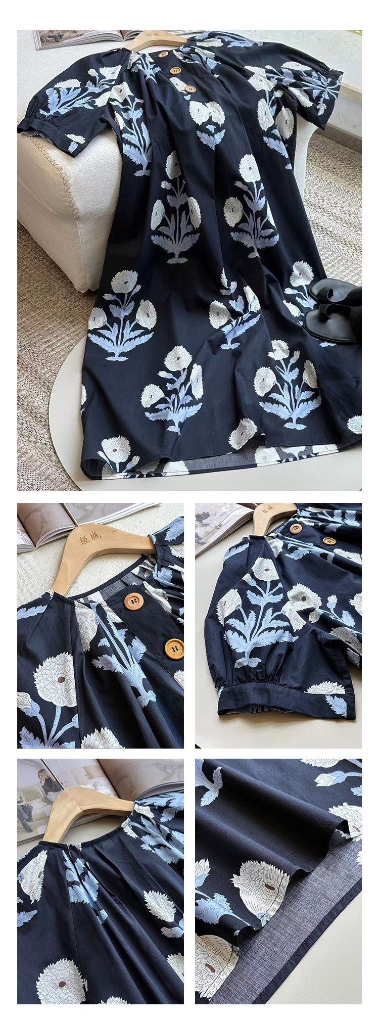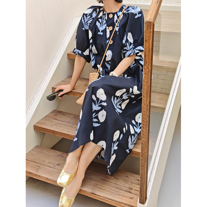輕城蘇小糖|法式復古植物印染連衣裙女夏季寬鬆泡泡短袖印花長裙