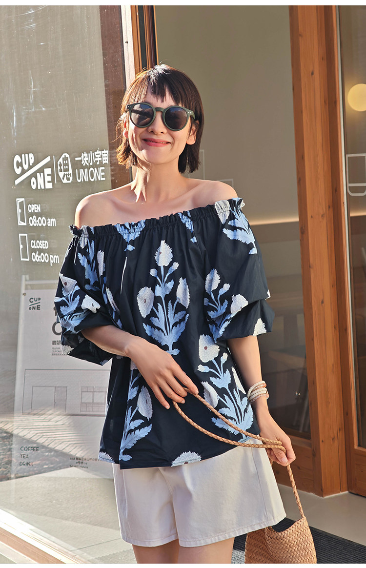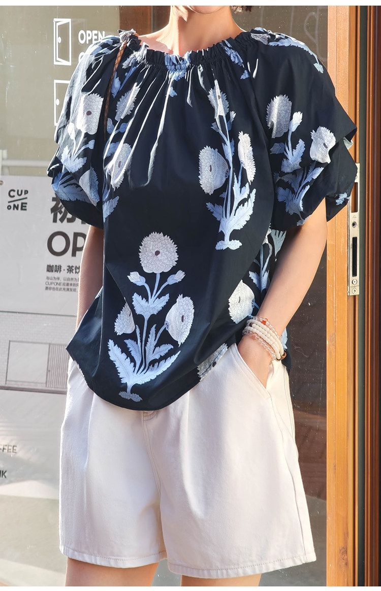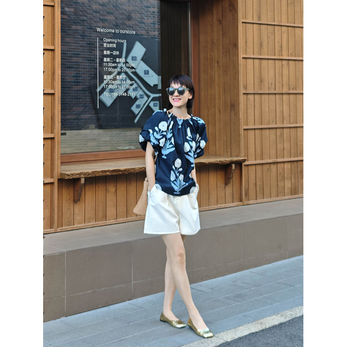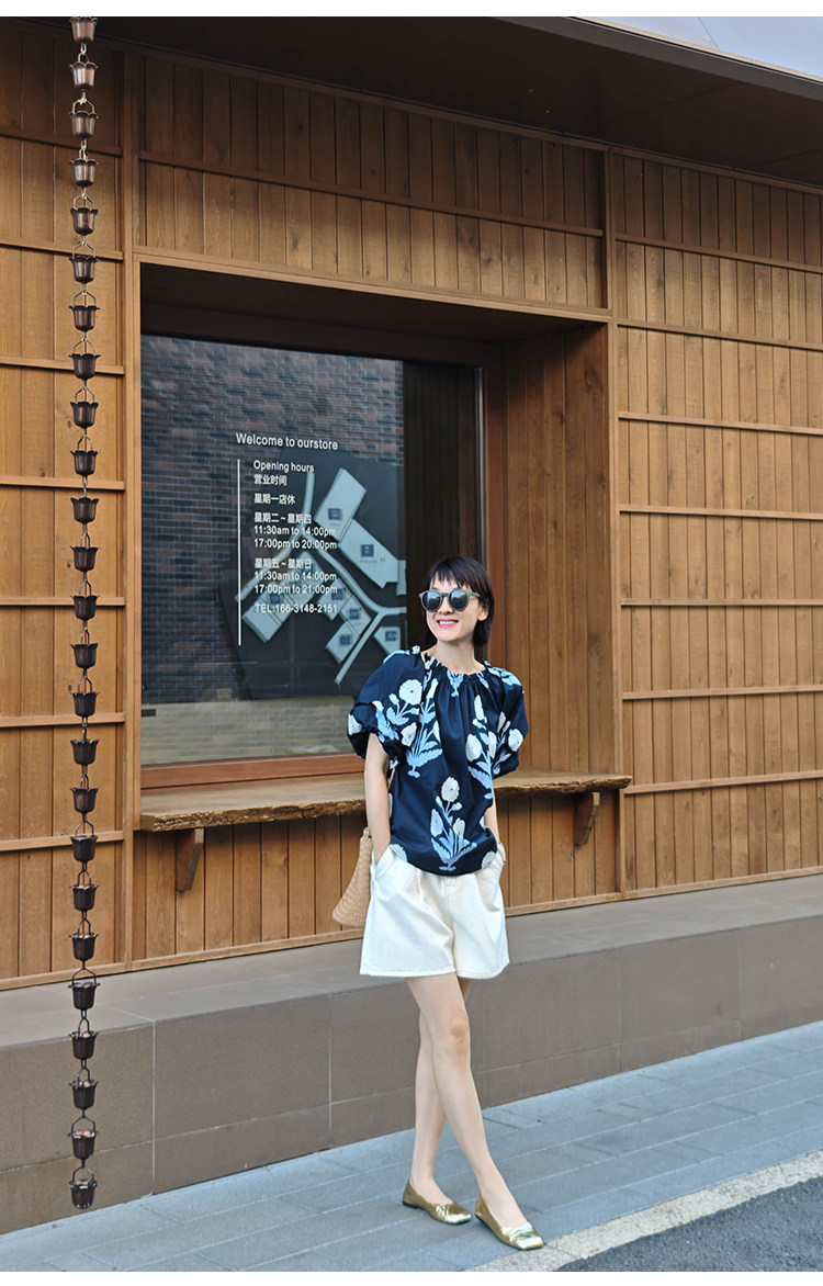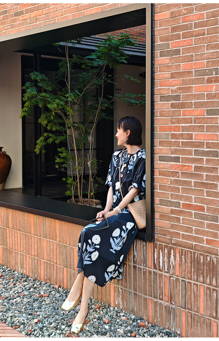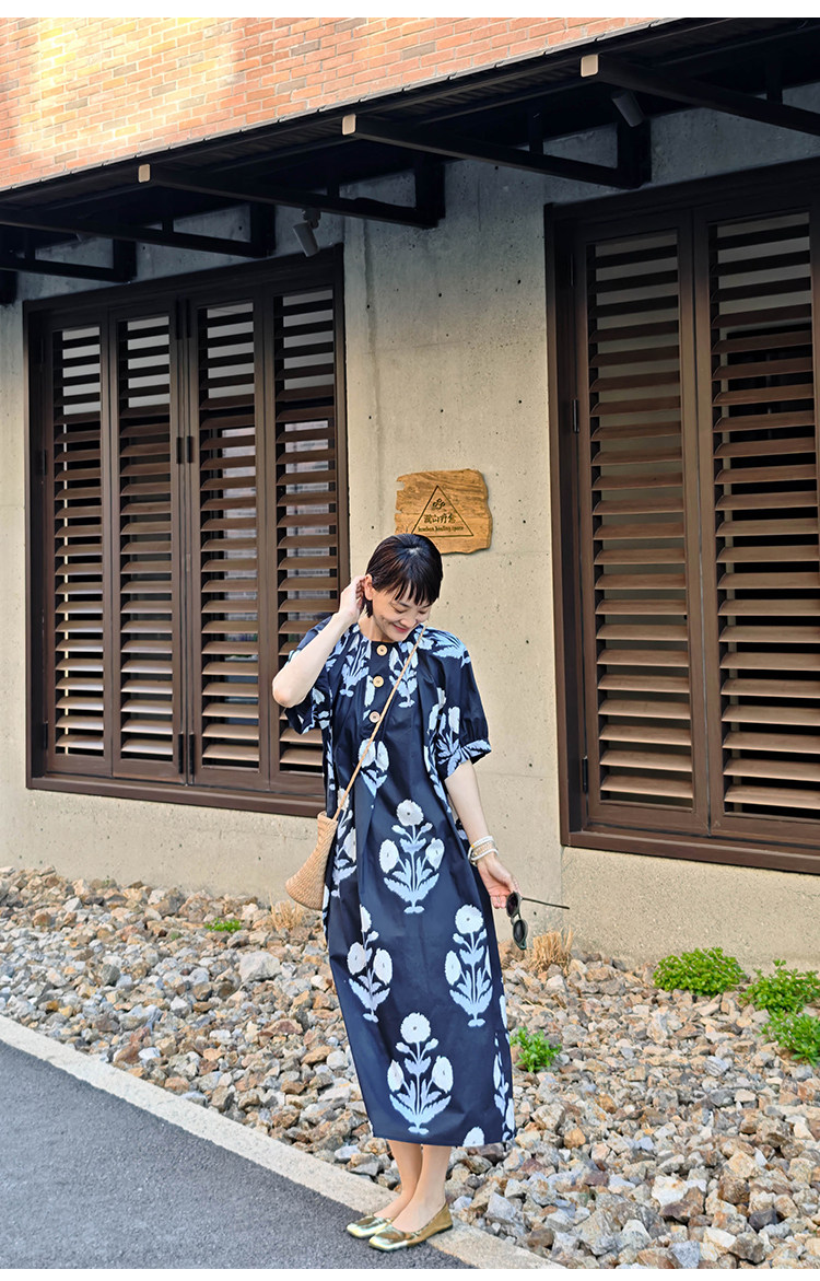 輕城蘇小糖|法式復古植物印染連衣裙女夏季寬鬆泡泡短袖印花長裙