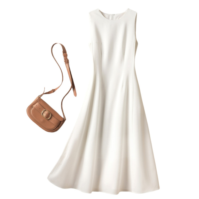 QXZL法式無袖背心裙2026春夏款A裙大擺中長白色圓領收腰連衣裙女