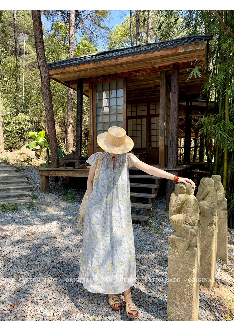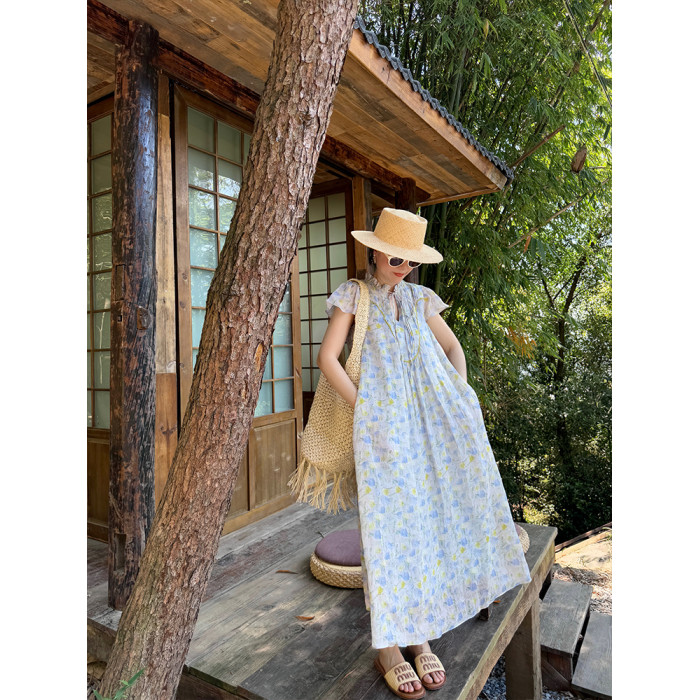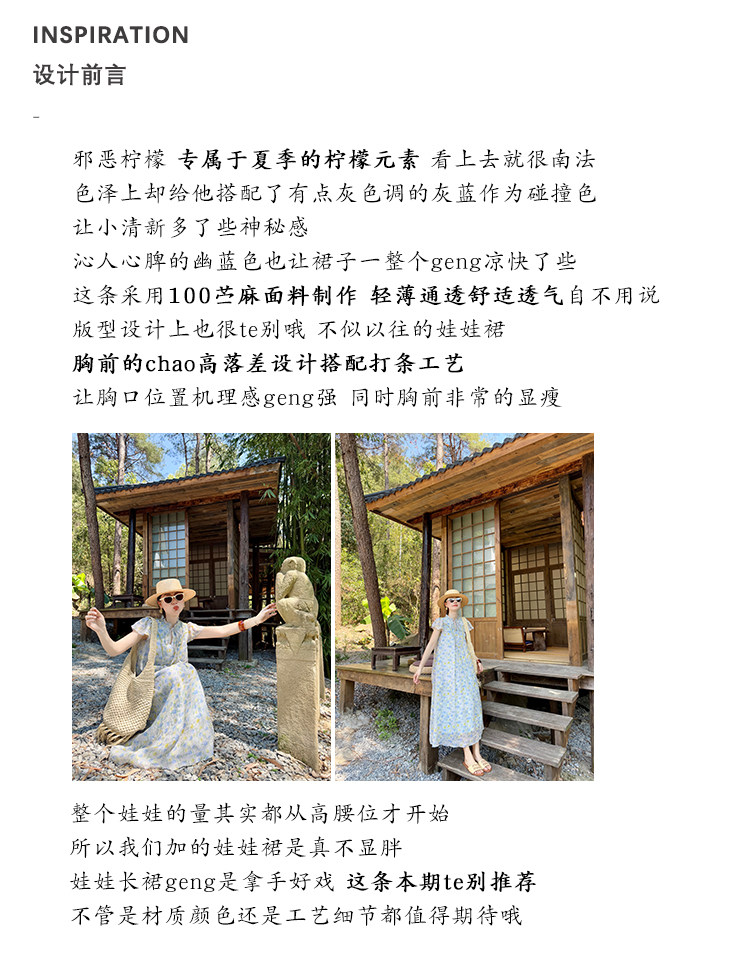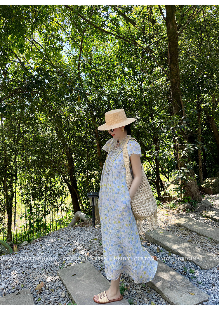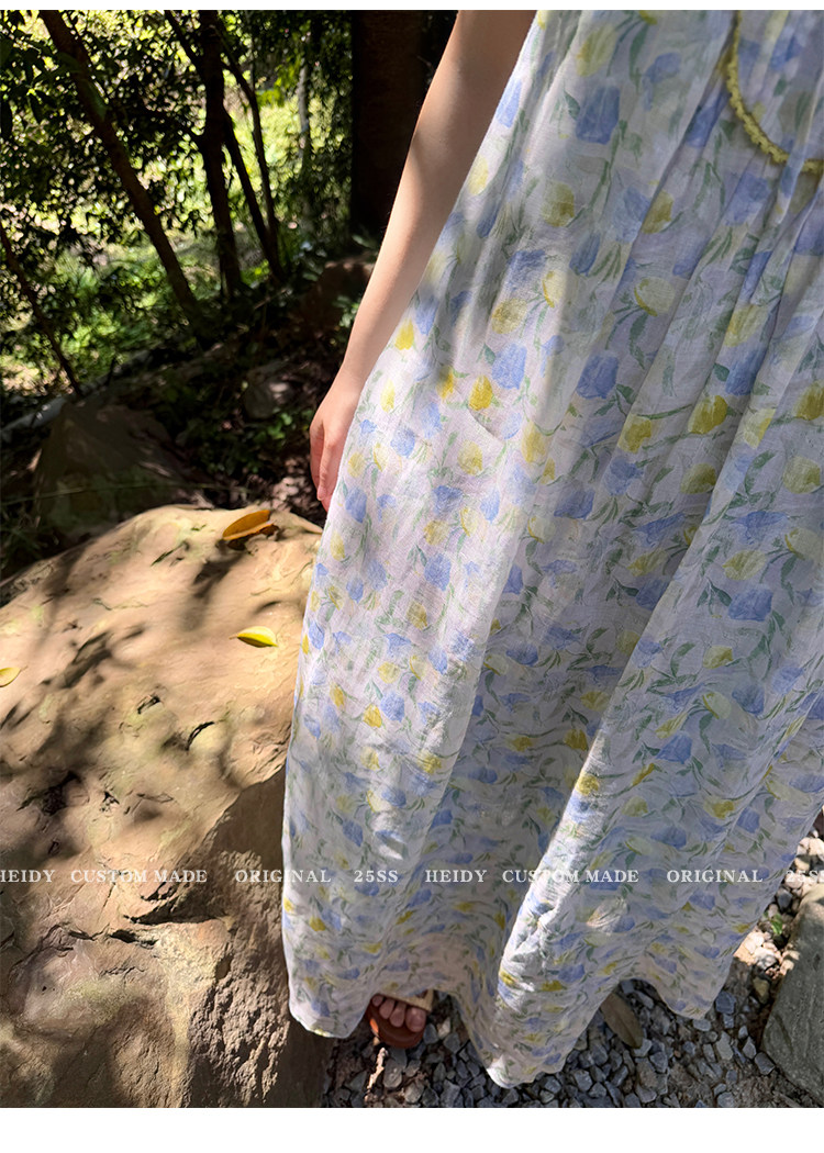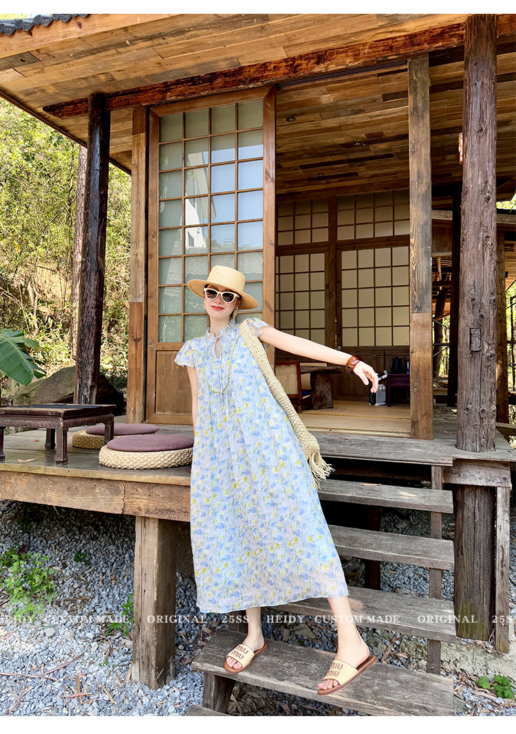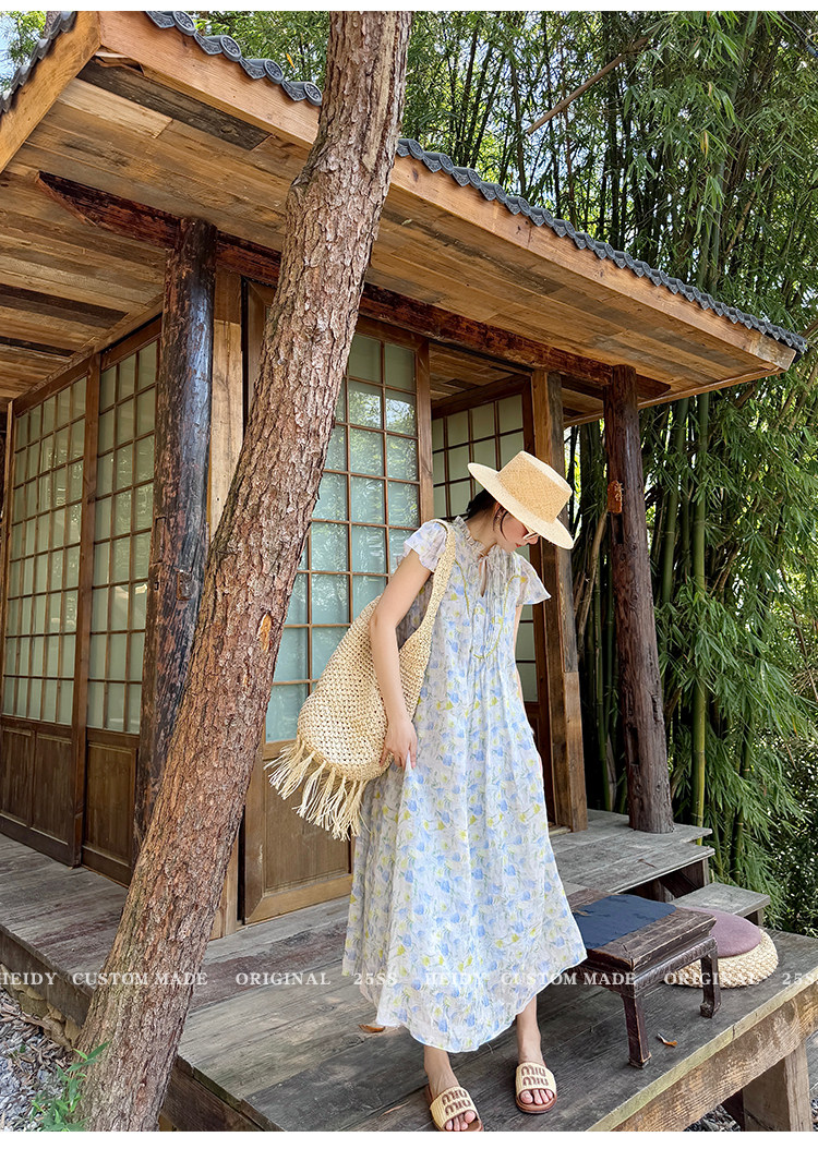 heidy海蒂 度假檸檬 壓條蕾絲邊100苧麻印花連衣裙系繩飛袖長裙子