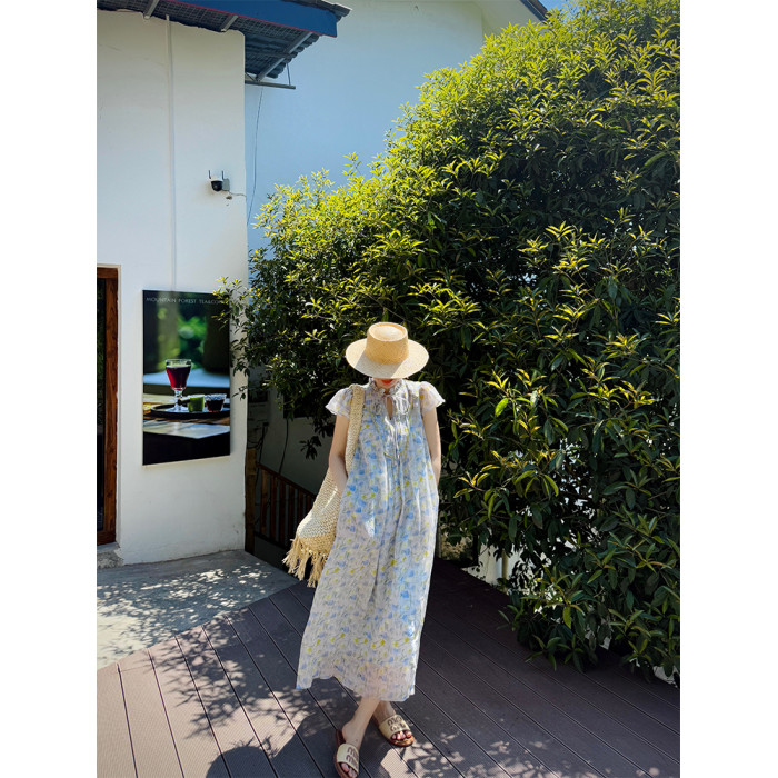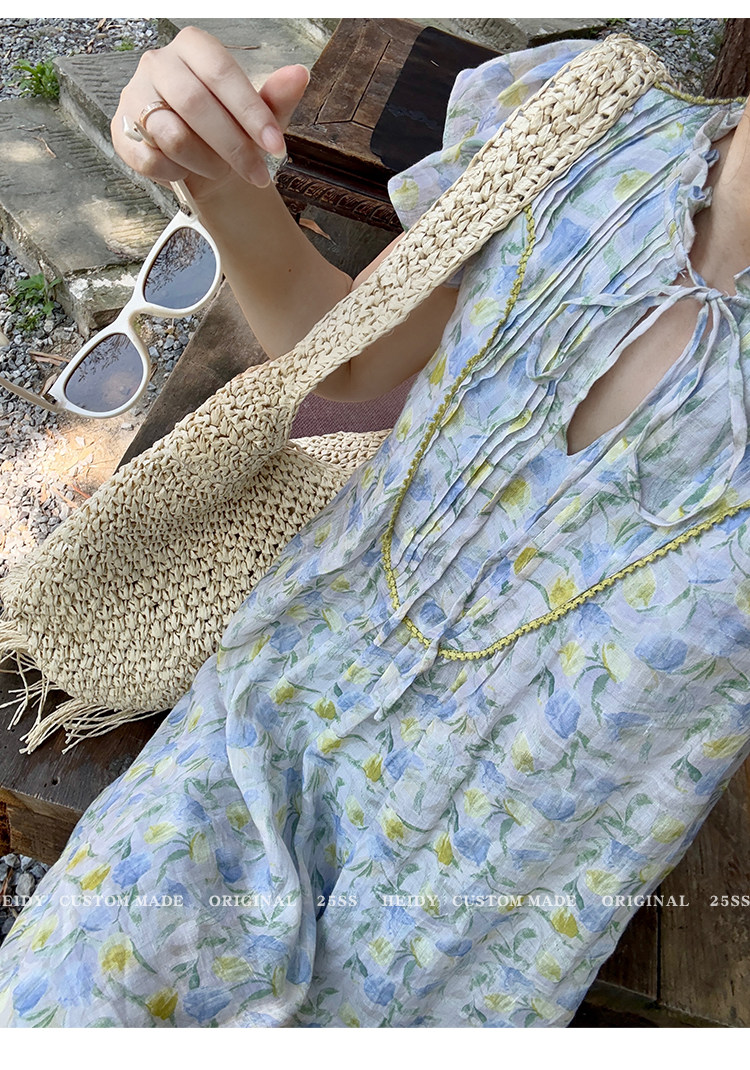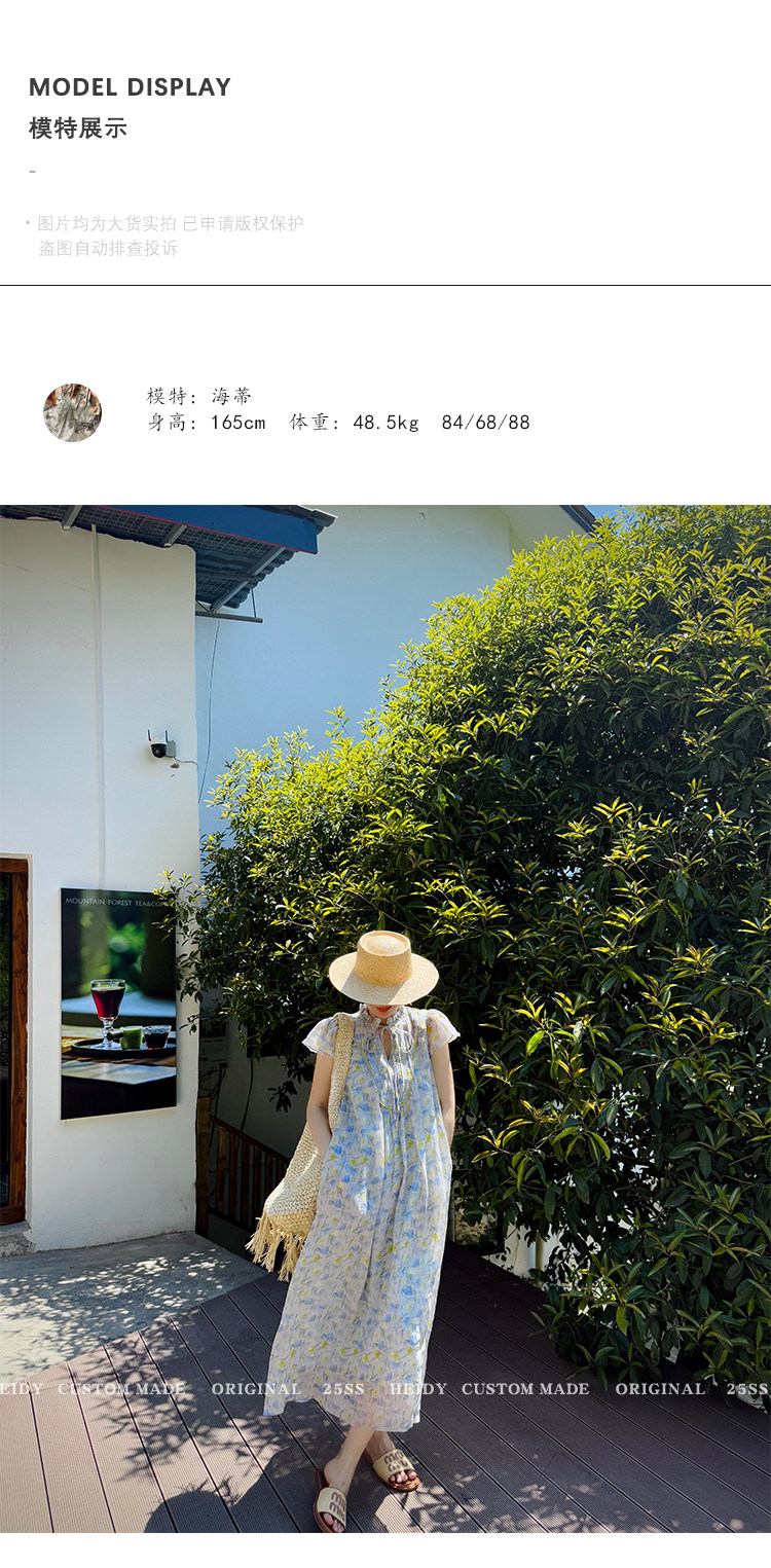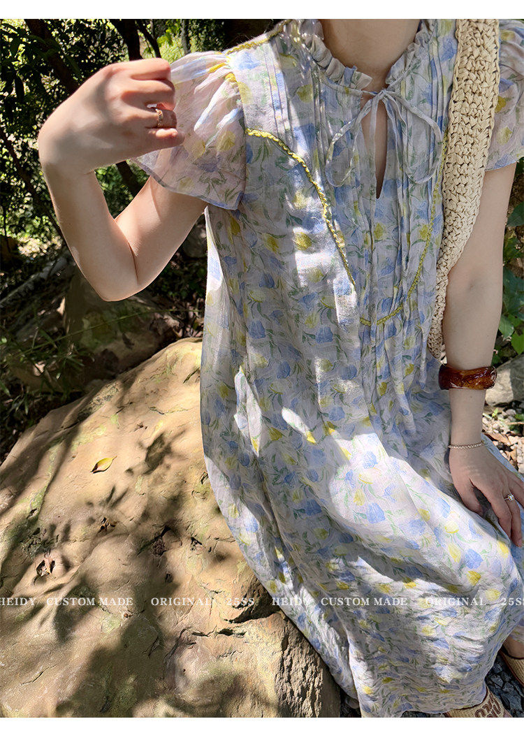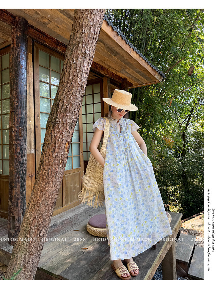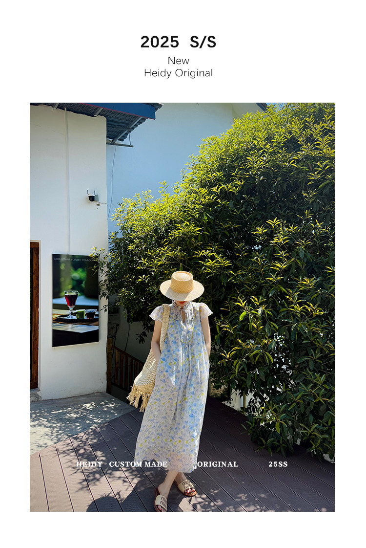 heidy海蒂 度假檸檬 壓條蕾絲邊100苧麻印花連衣裙系繩飛袖長裙子