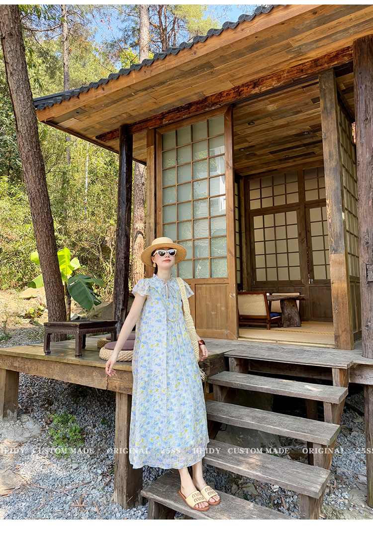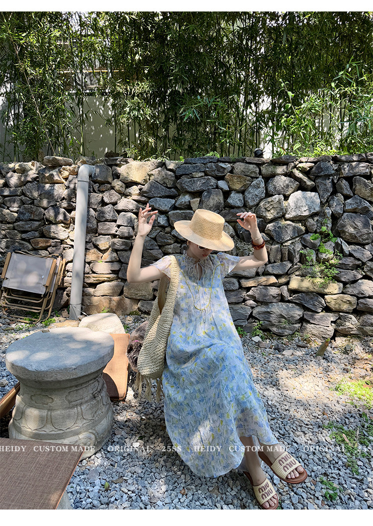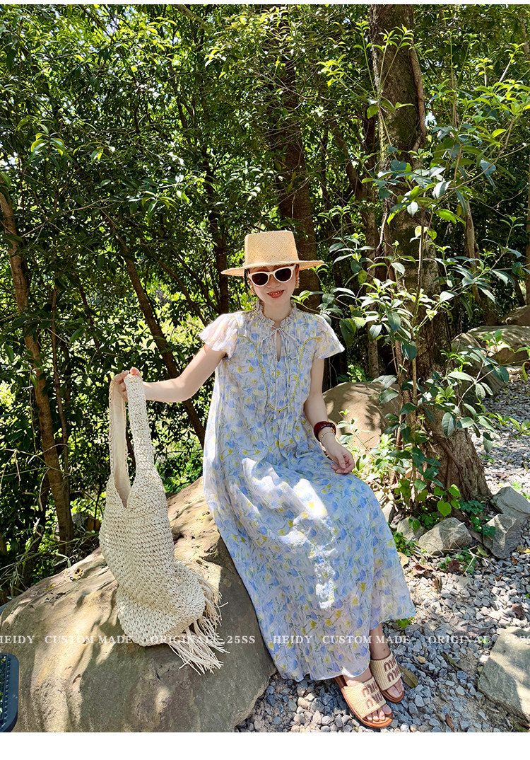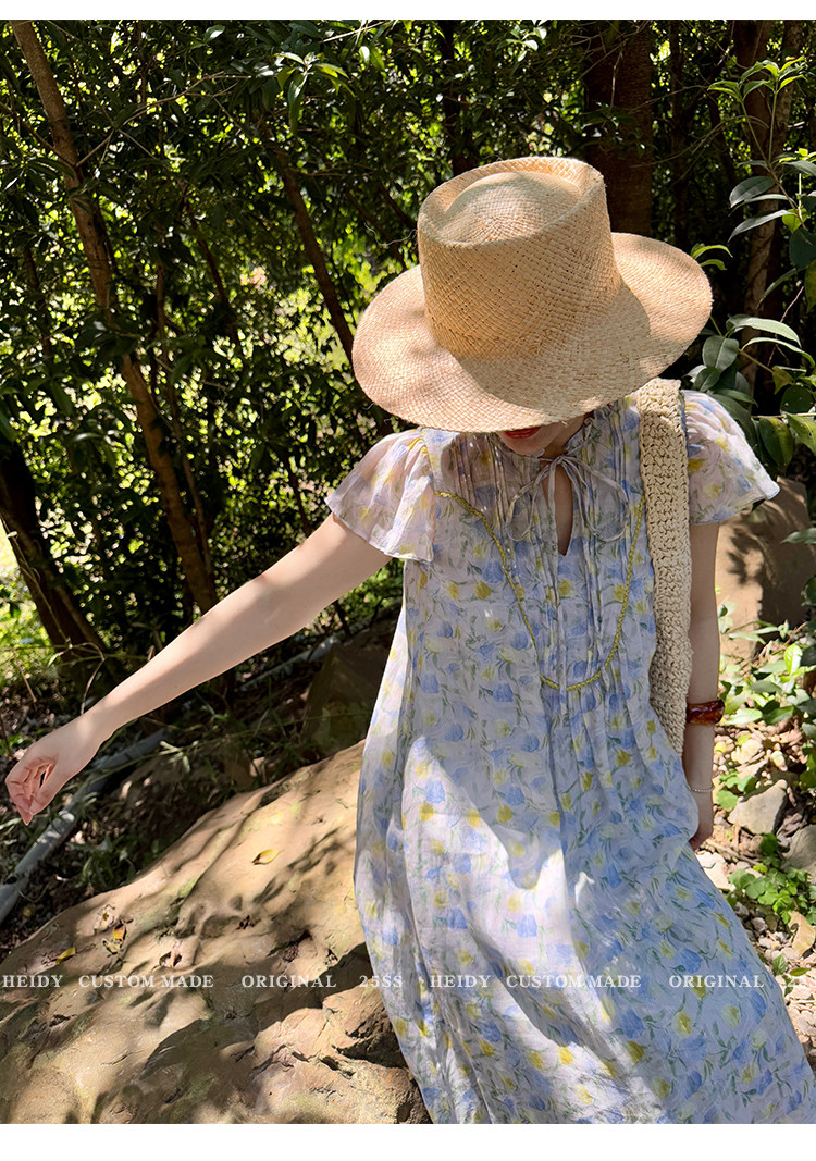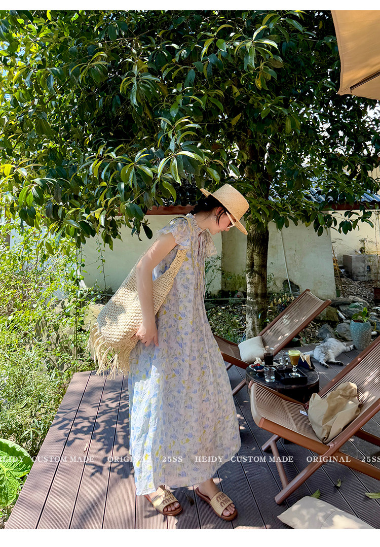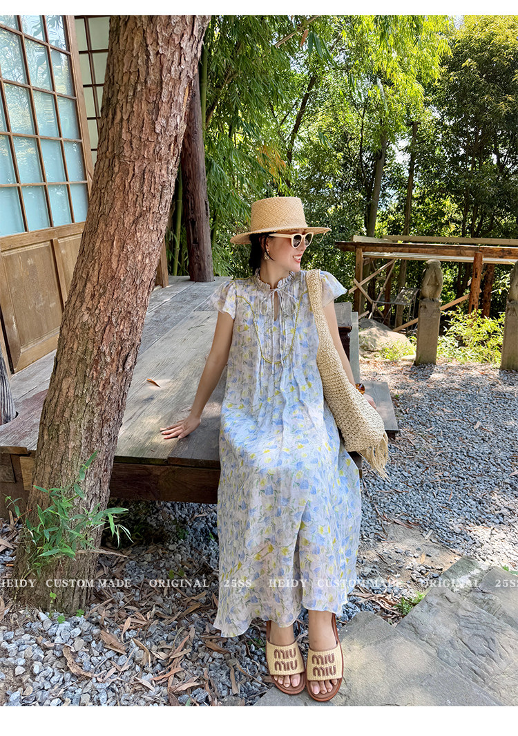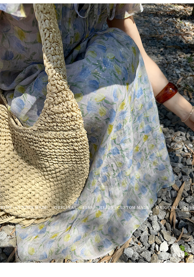 heidy海蒂 度假檸檬 壓條蕾絲邊100苧麻印花連衣裙系繩飛袖長裙子
