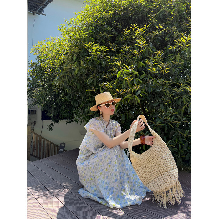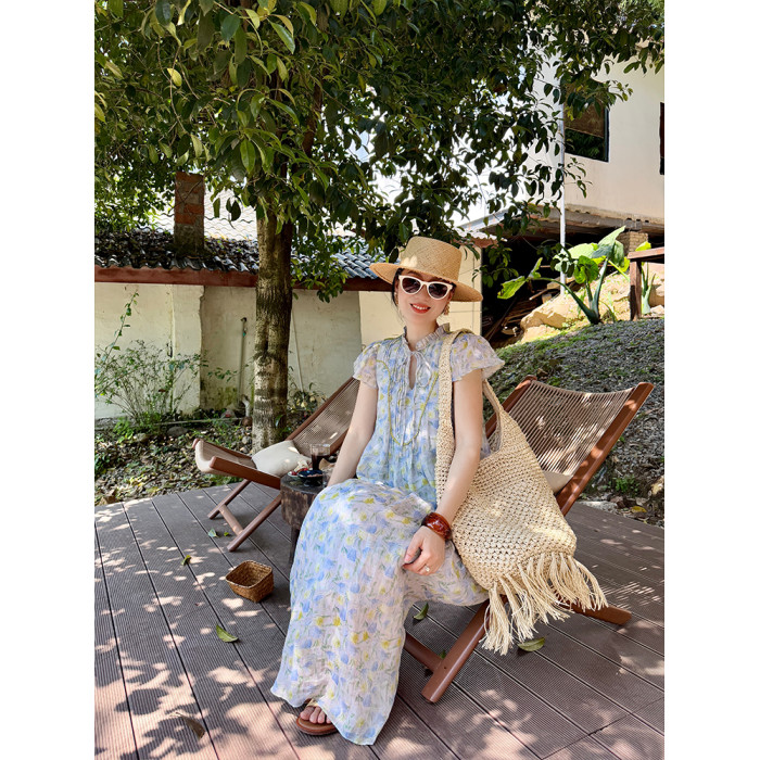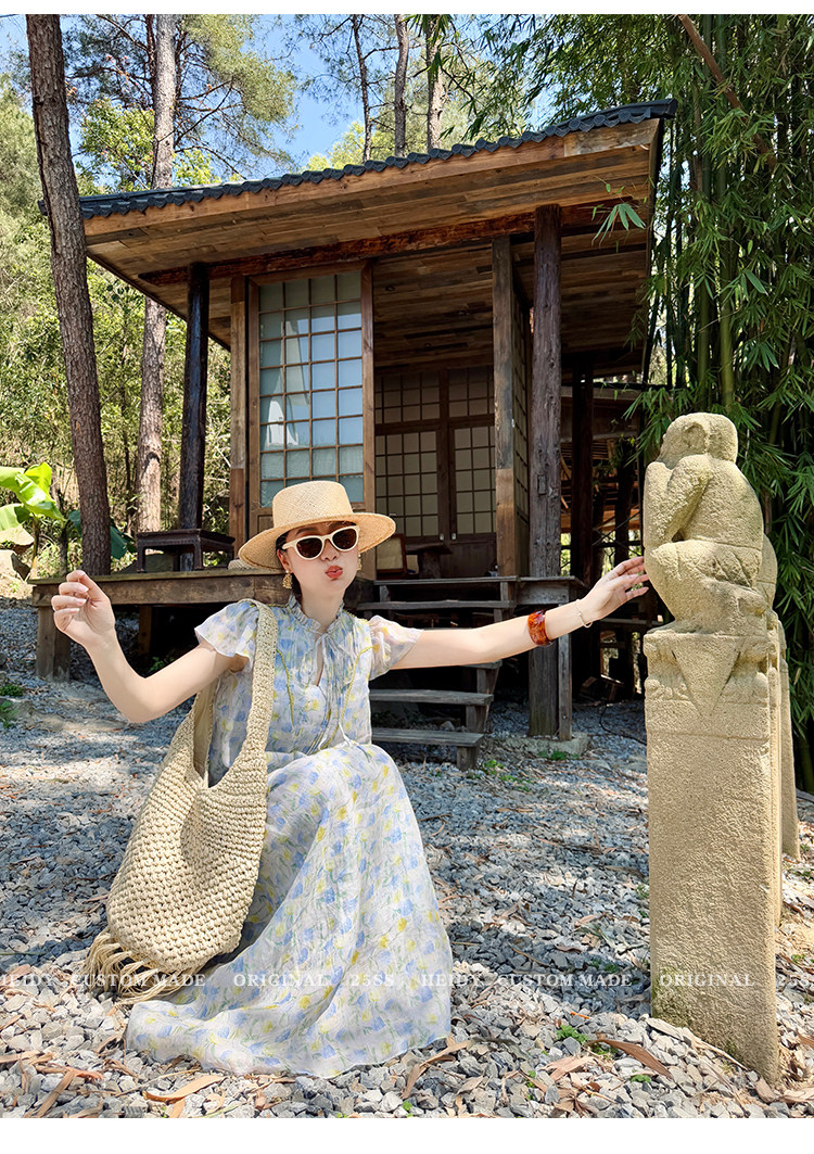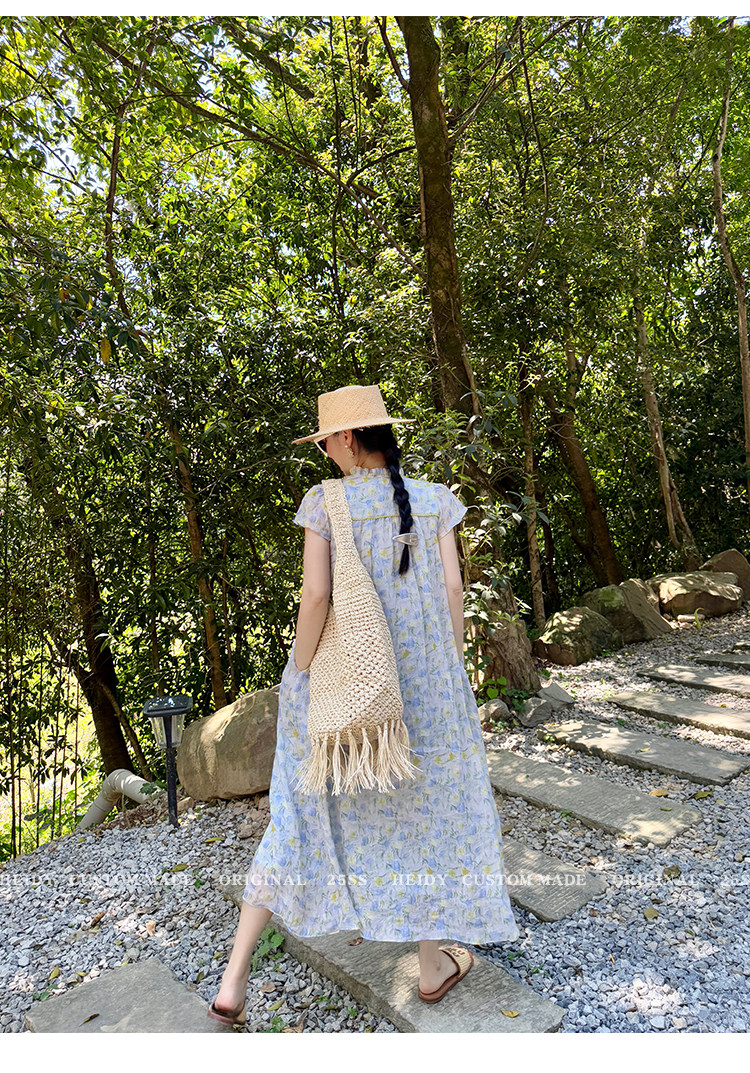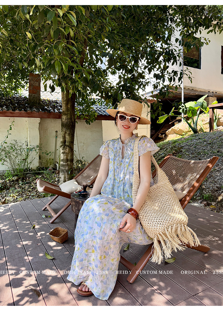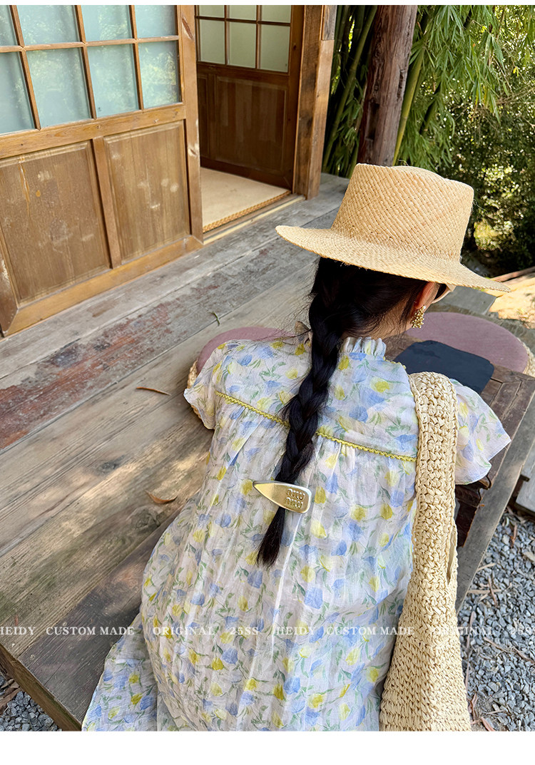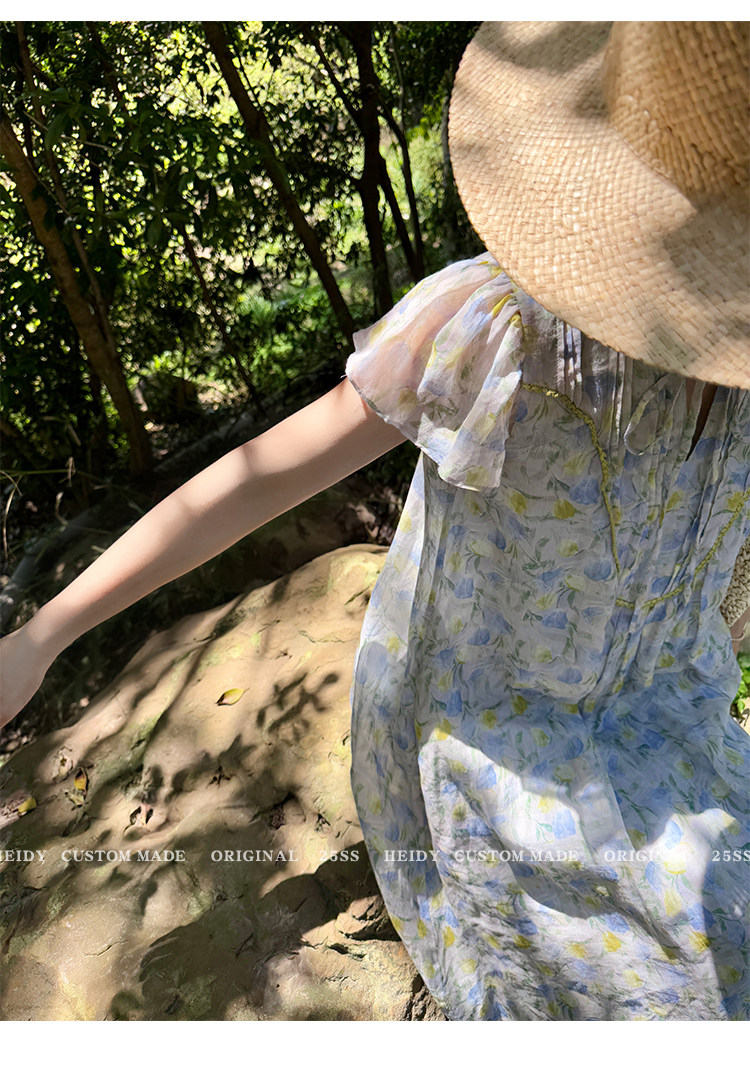 heidy海蒂 度假檸檬 壓條蕾絲邊100苧麻印花連衣裙系繩飛袖長裙子