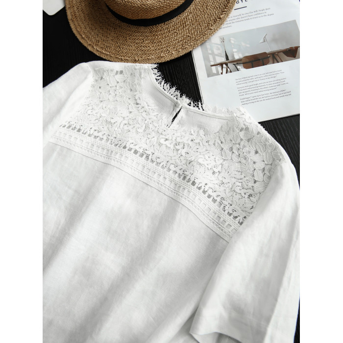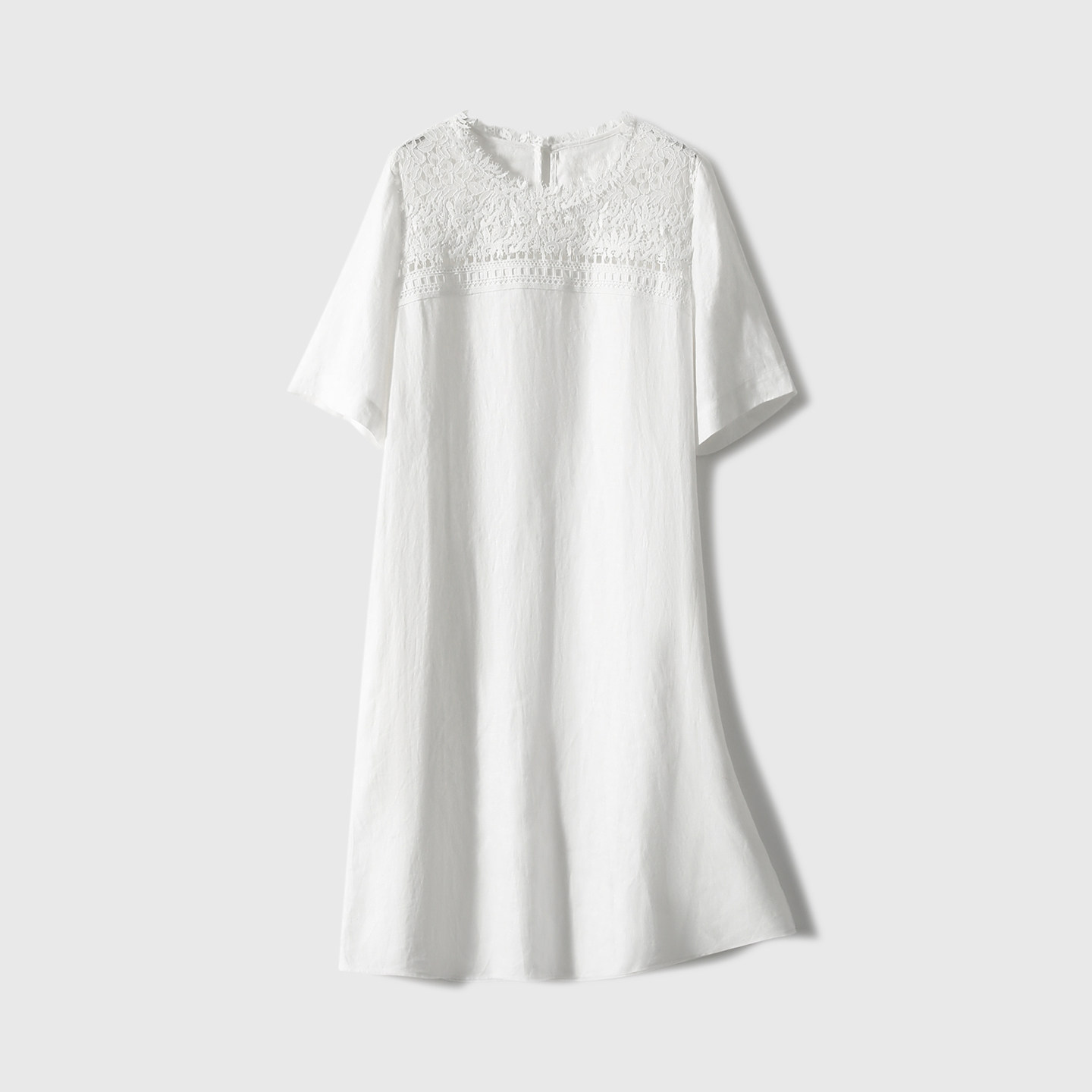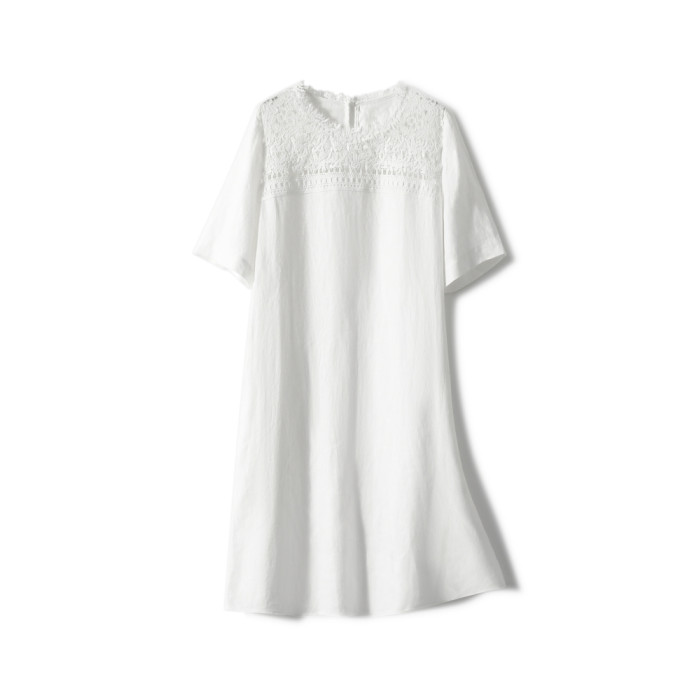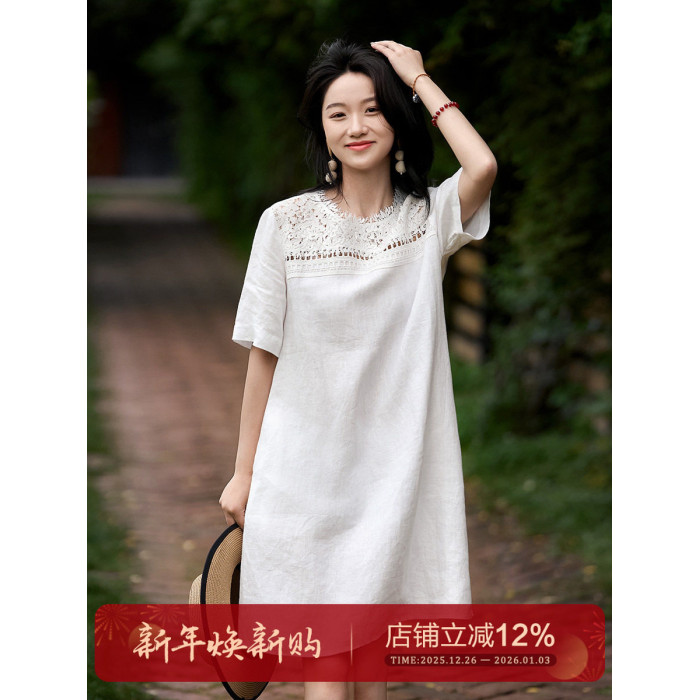 「浮生亞麻·重工蕾絲」100%亞麻/連衣裙 寬鬆圓領女直筒裙25夏新