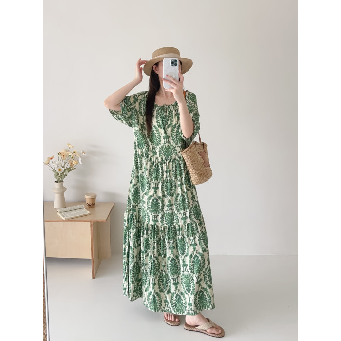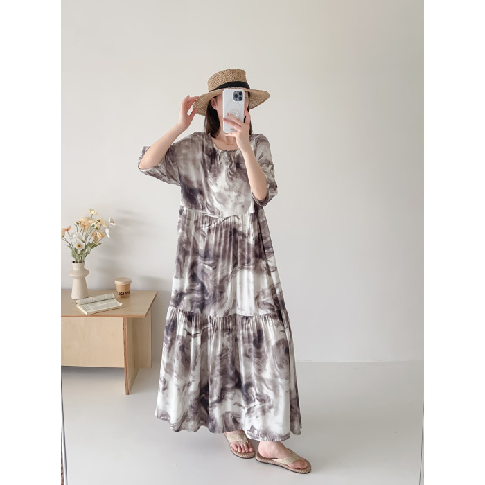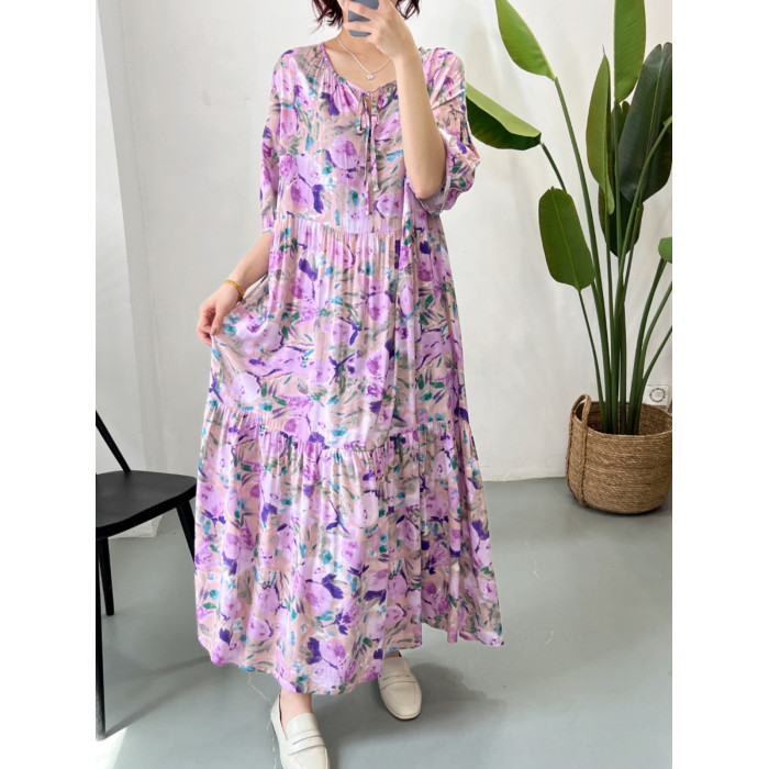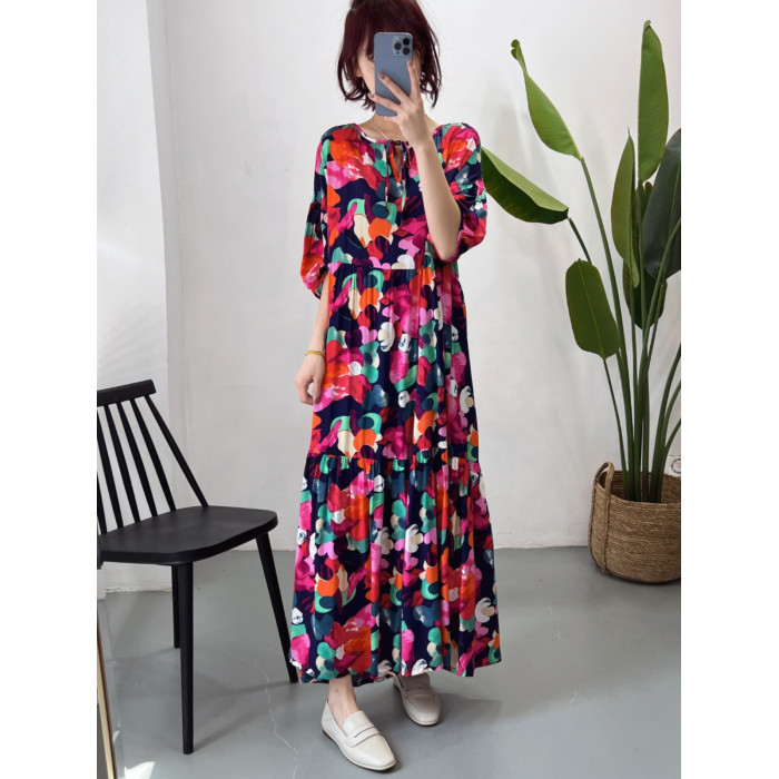 人造棉連衣裙時尚寬松大碼女裝夏季新款防曬外穿棉綢裙子垂感遮肉