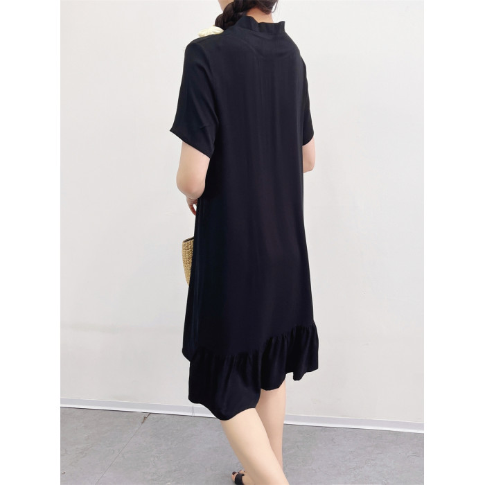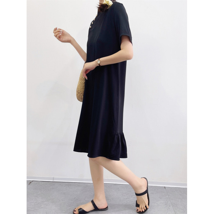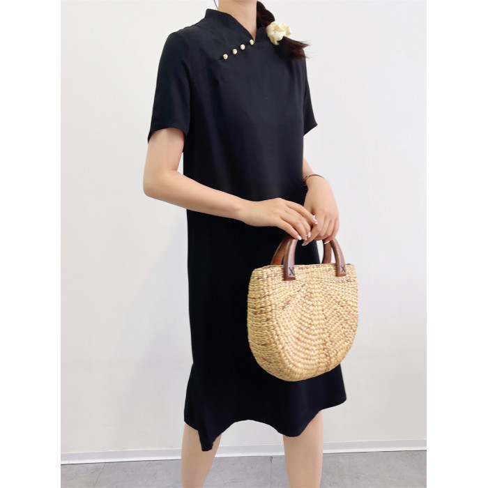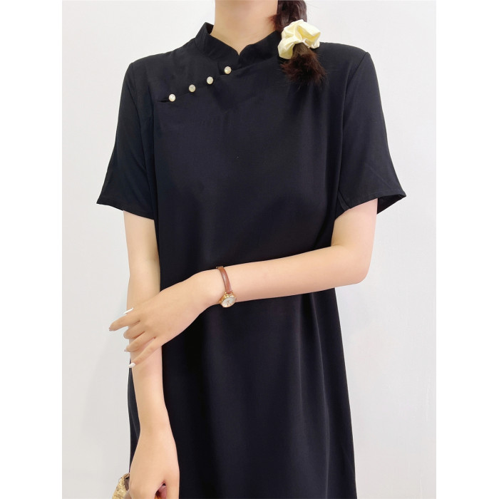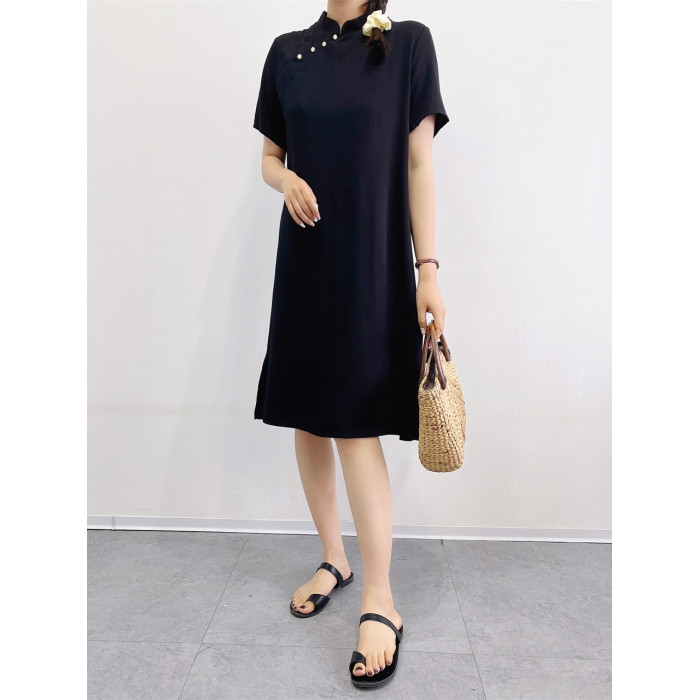 韓版棉綢連衣裙女夏季寬松顯瘦黑色短袖長裙立領套頭純色修身旗袍