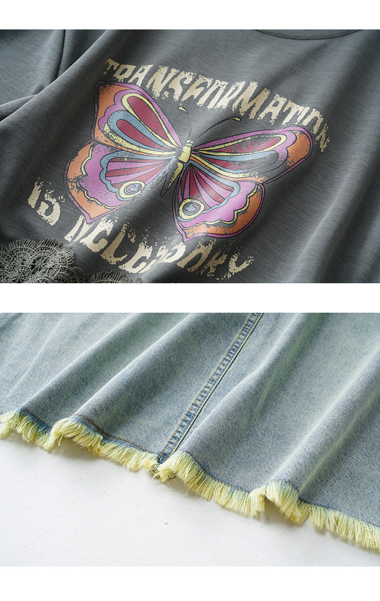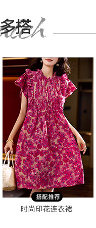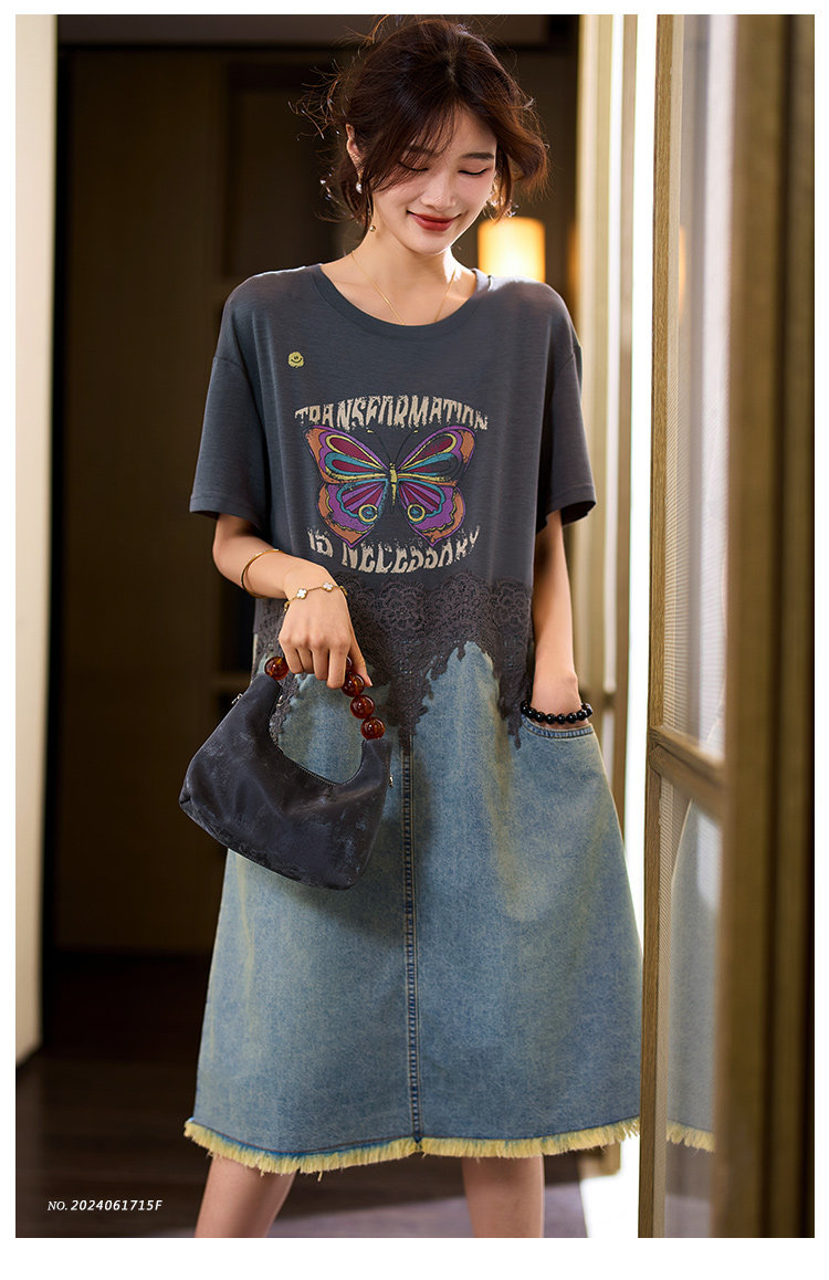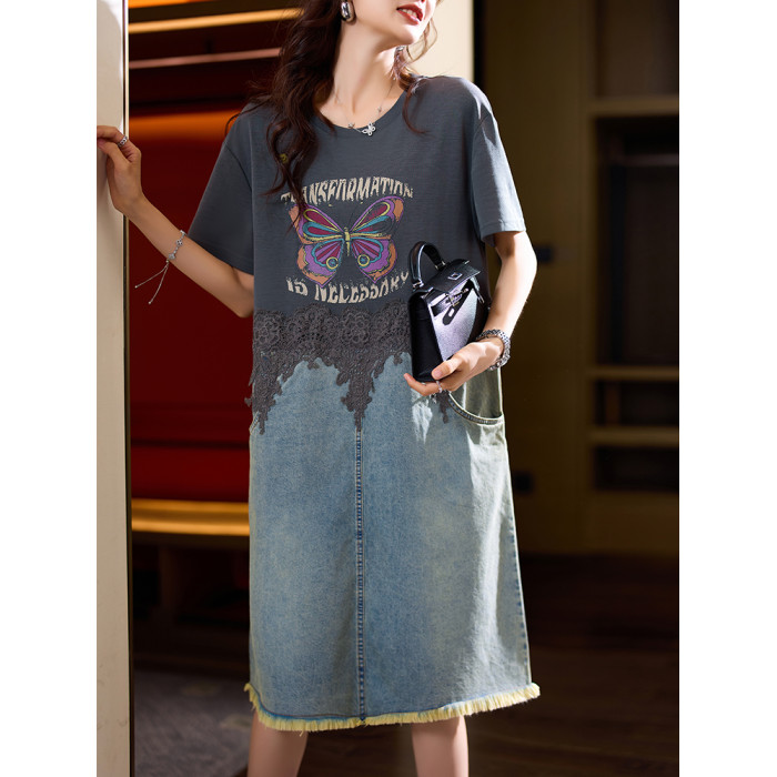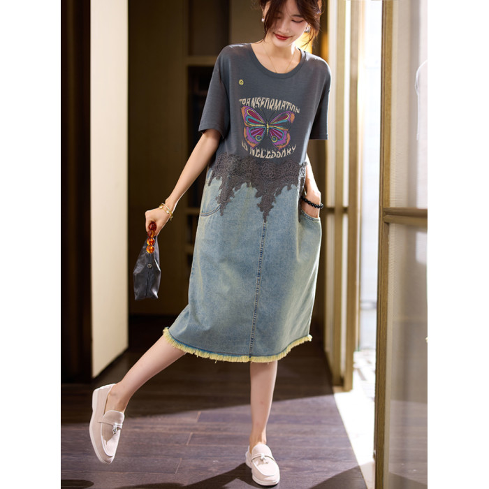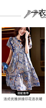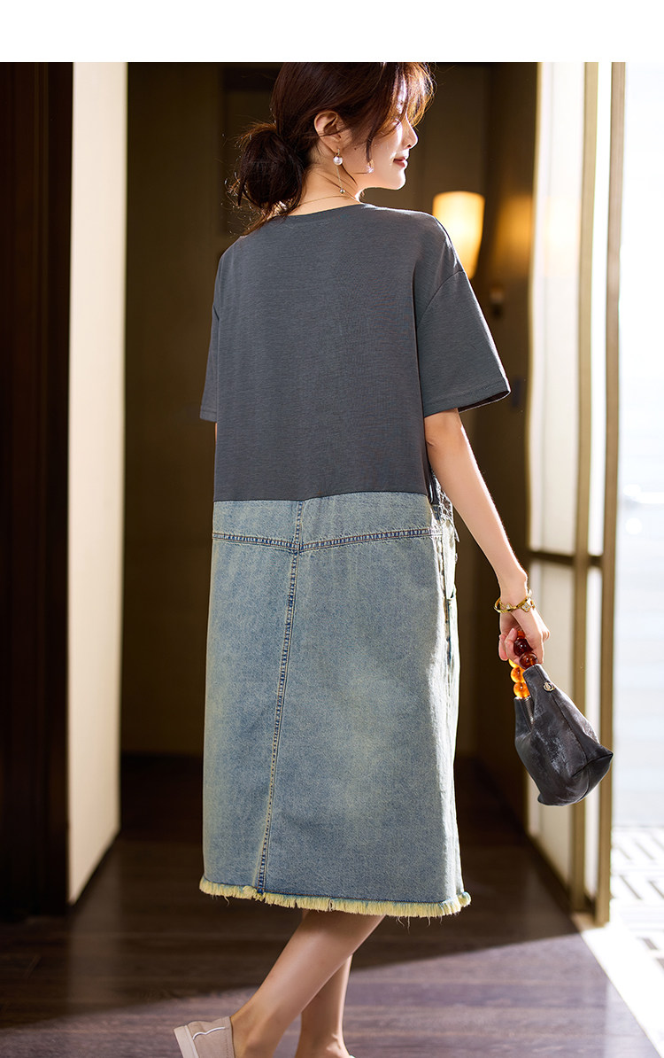 素木印花牛仔拼接連衣裙女夏季2025年新款歐貨裙子休閒大碼a字裙