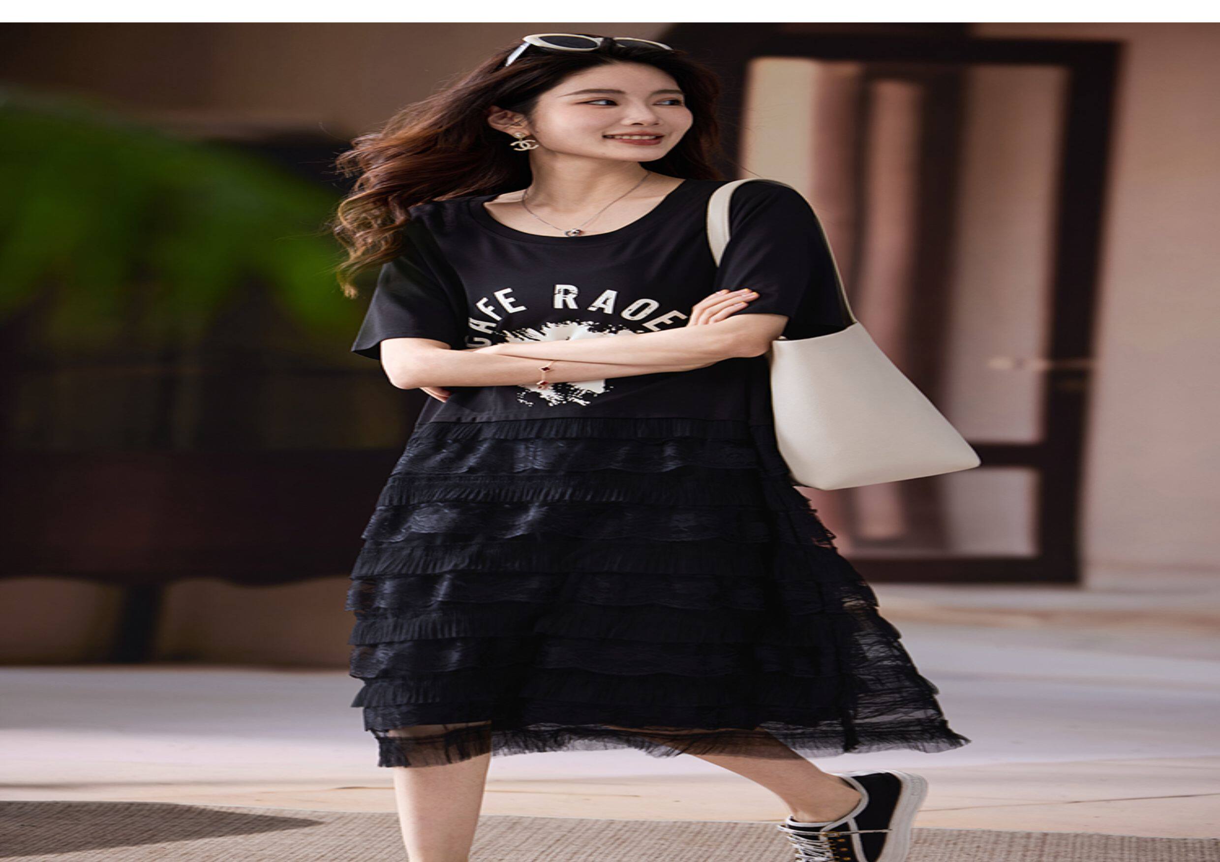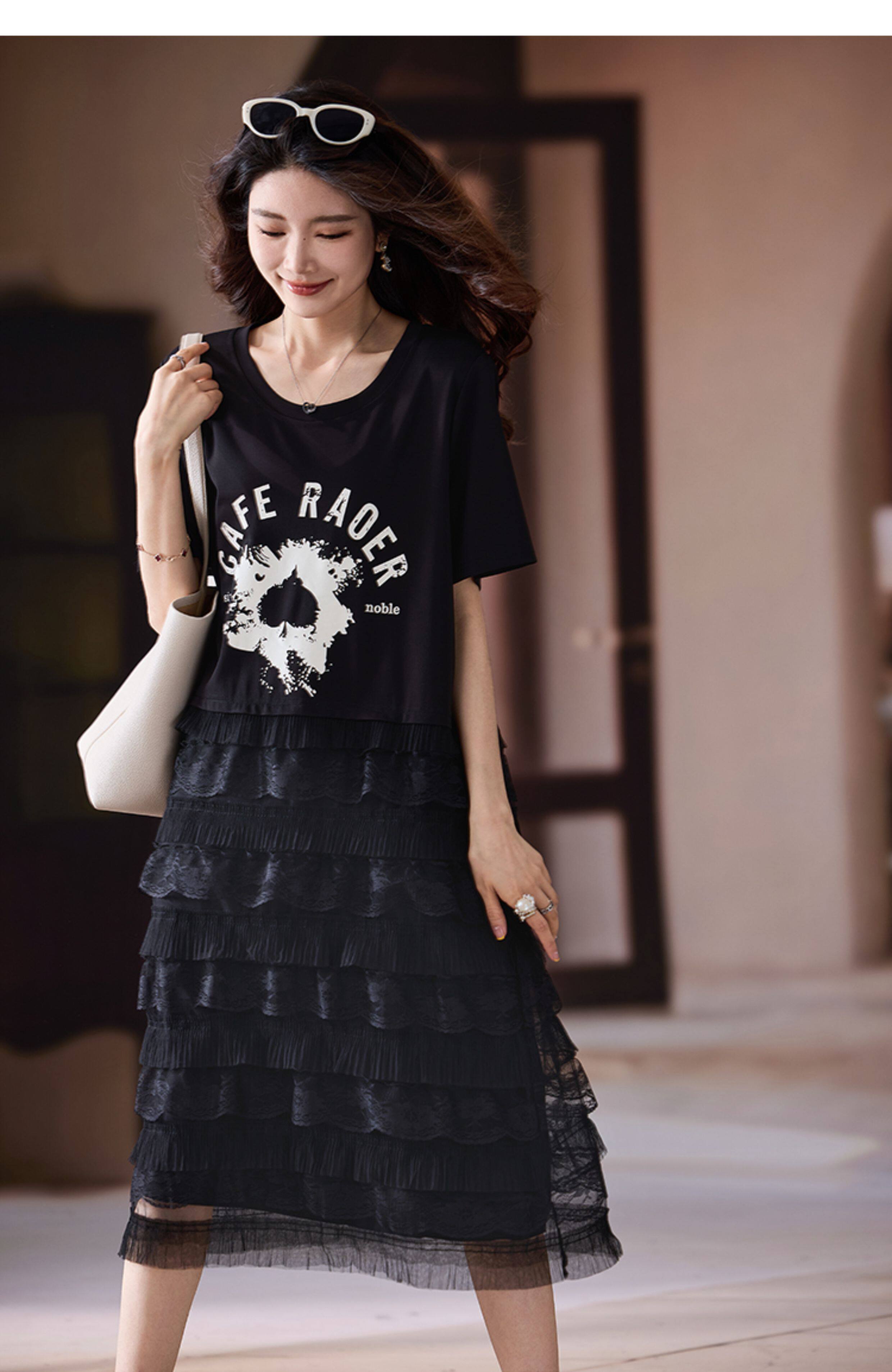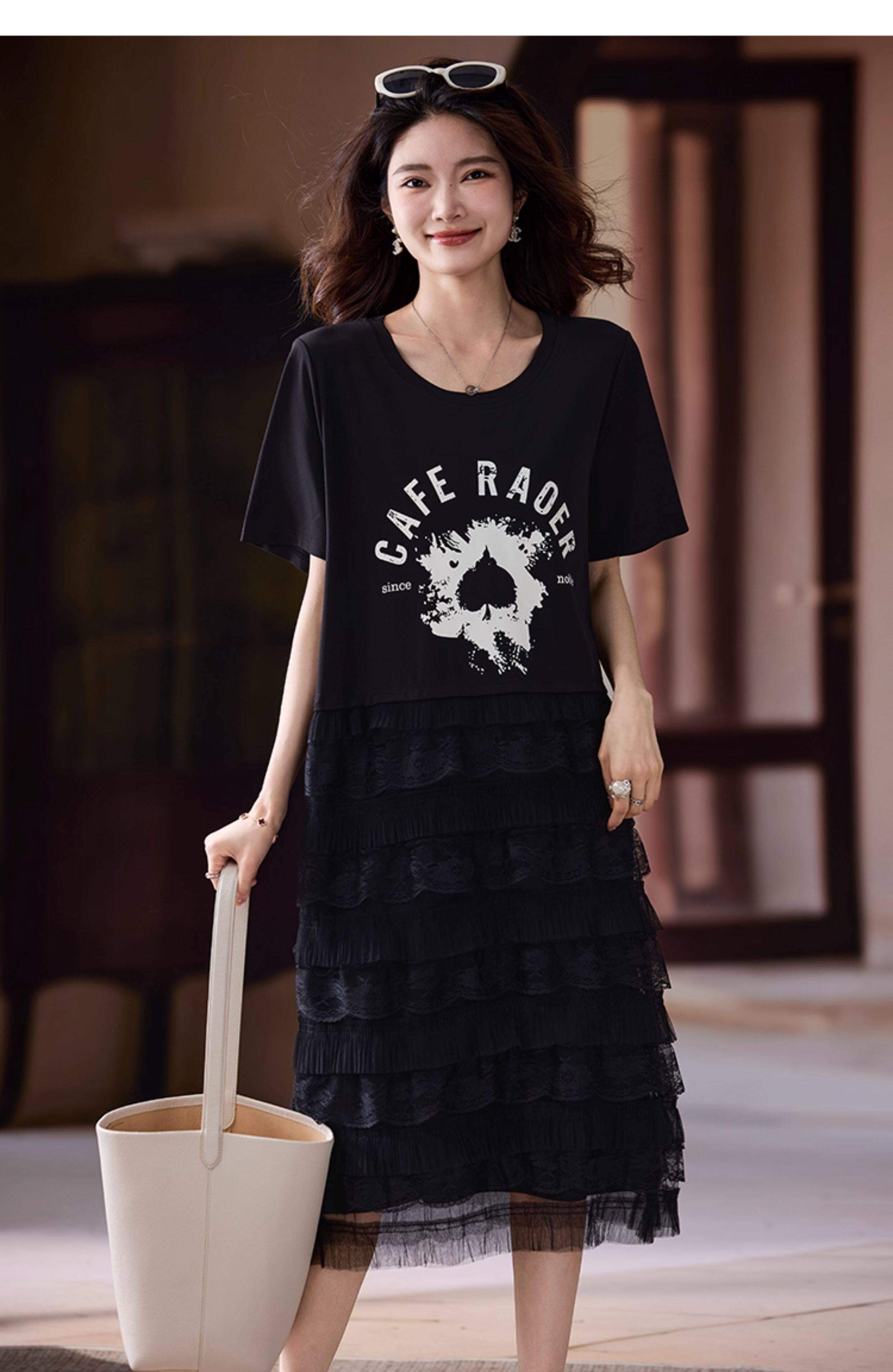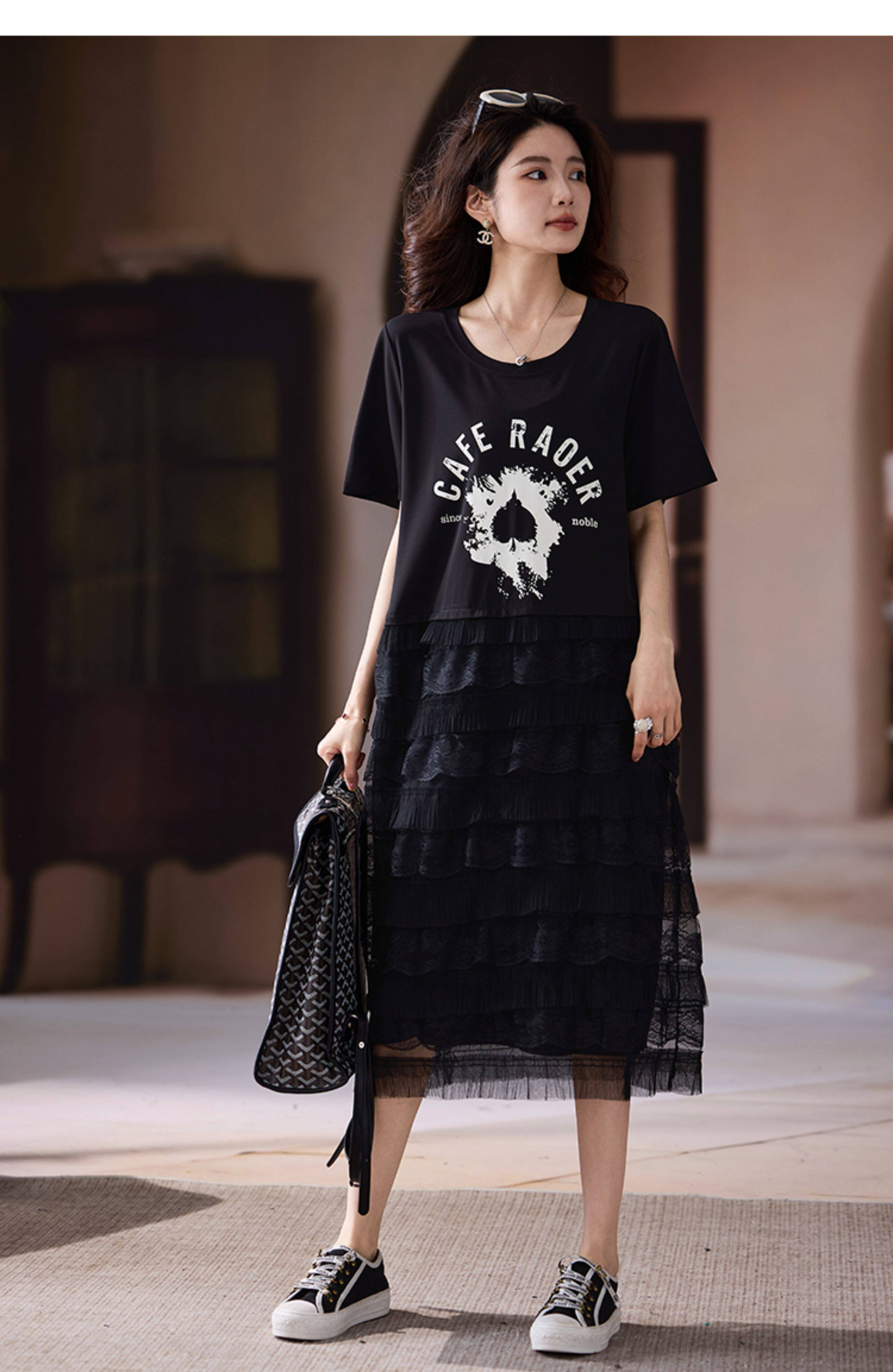 素木蕾絲拼接印花連衣裙女夏季2025年新款大碼a字裙歐貨時尚裙子