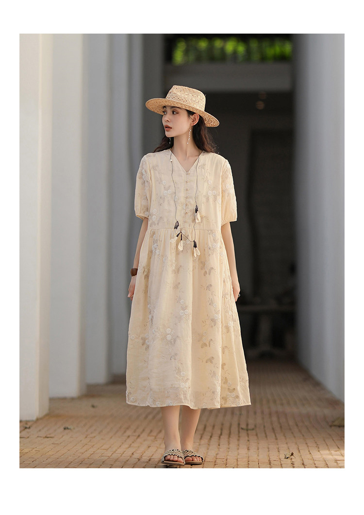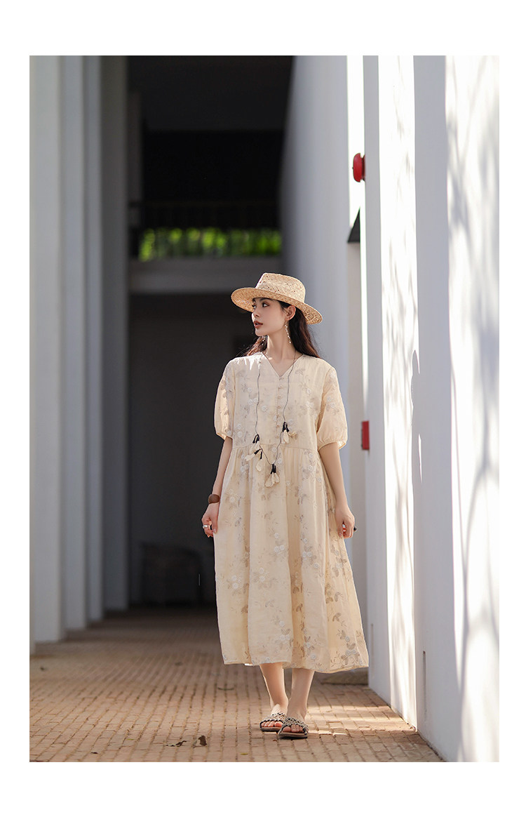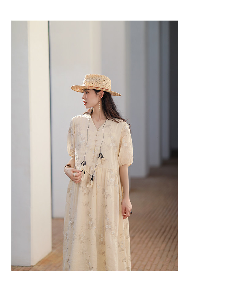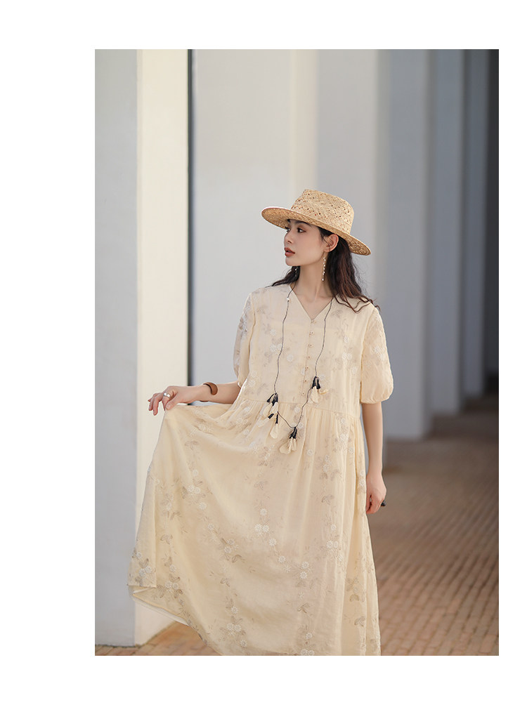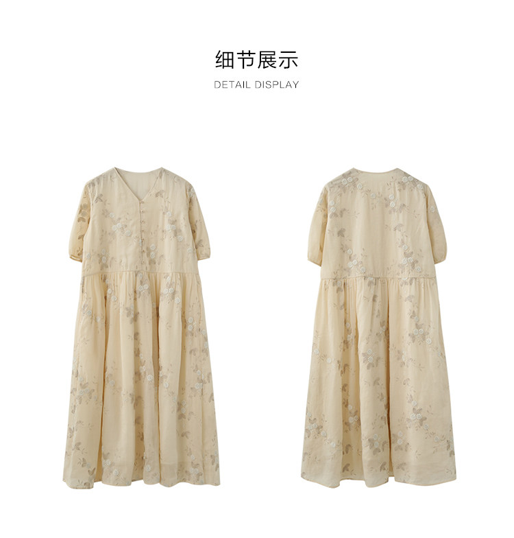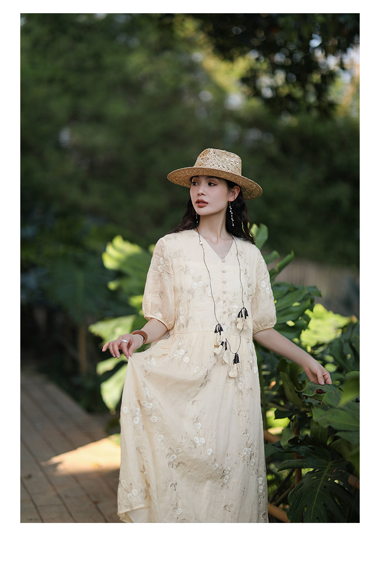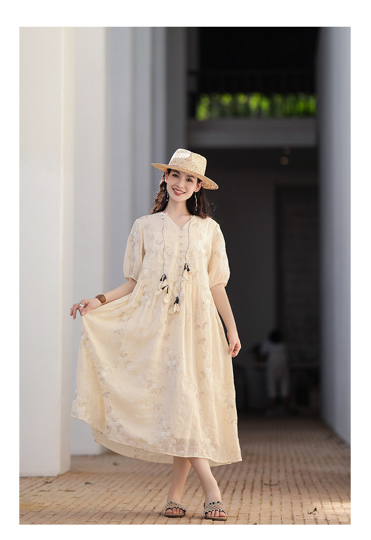 麻霖原創設計夏季100支100%精細苧麻水溶刺綉文藝休閒清涼連衣裙