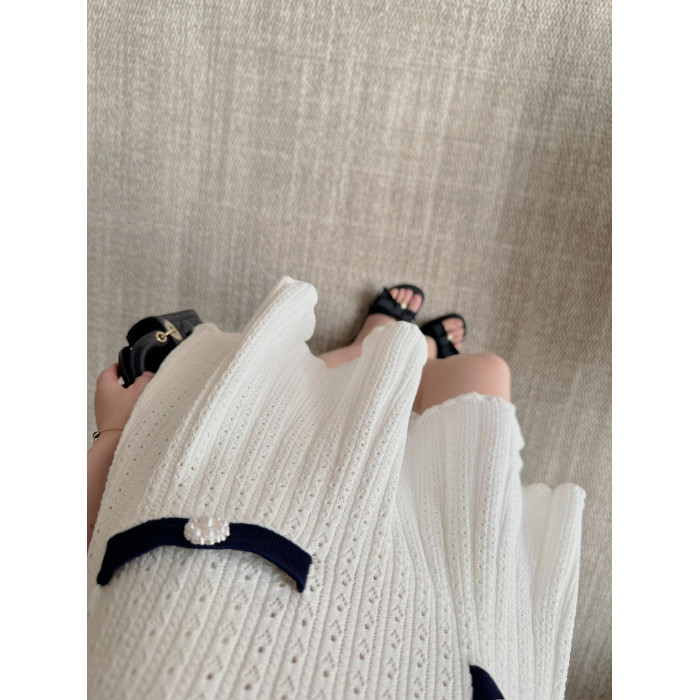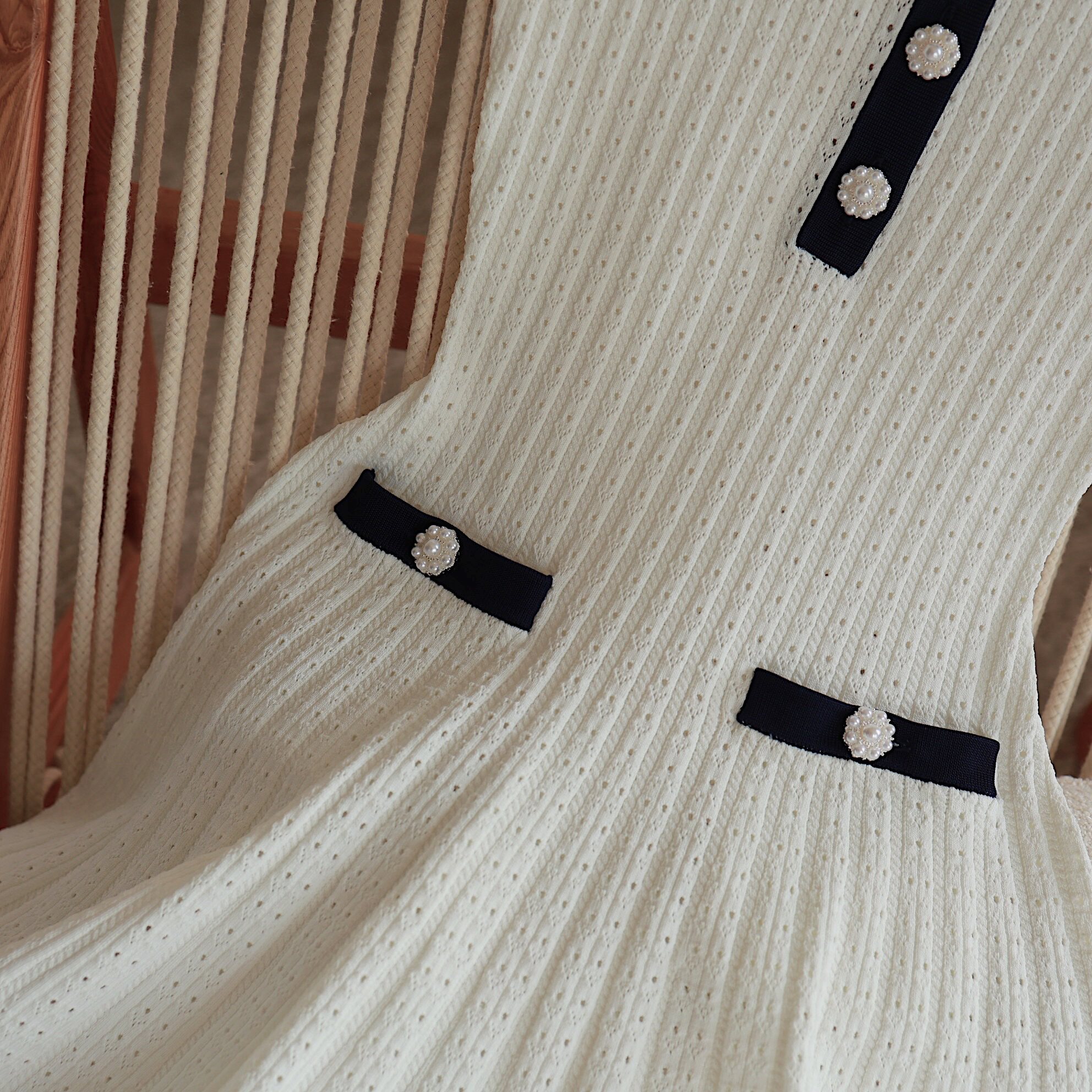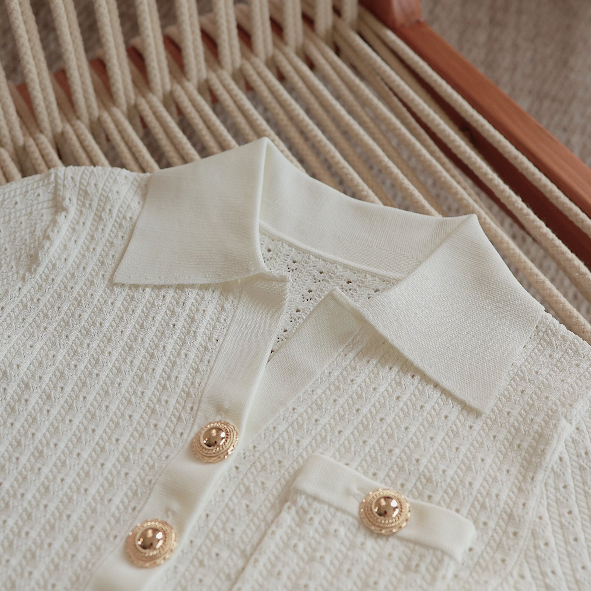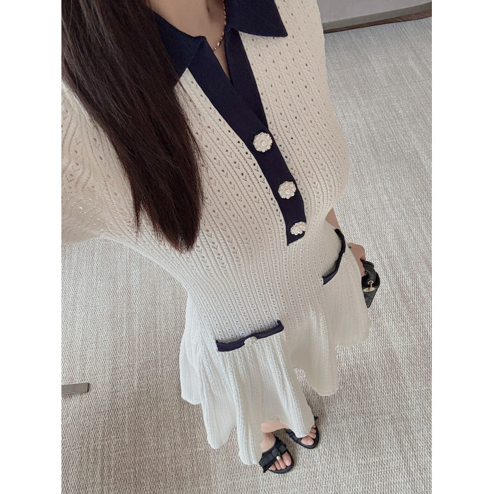 Masakiki七七 優雅小香風珍珠釦鏤空連衣裙+繙領金釦短針織衫
