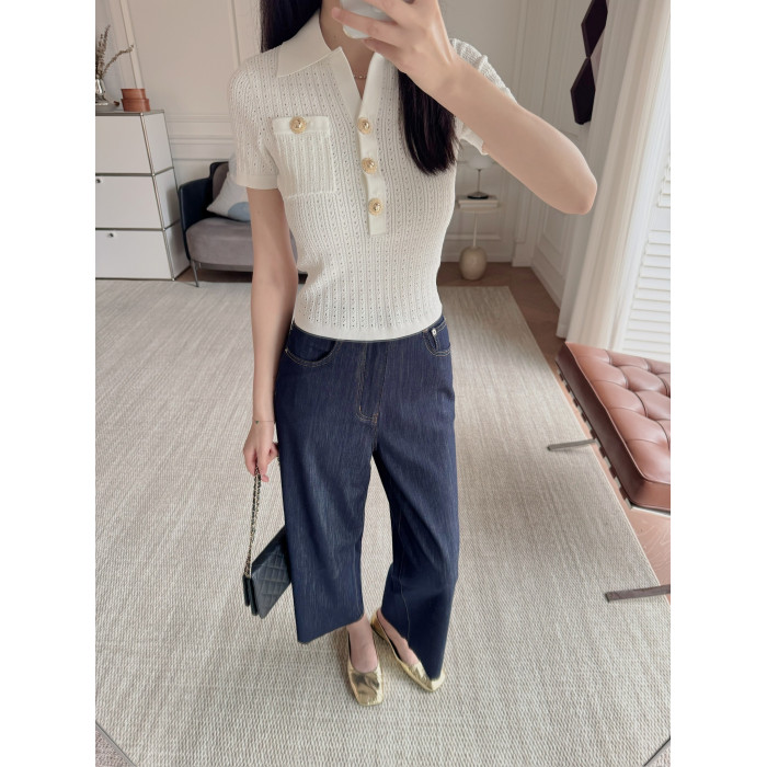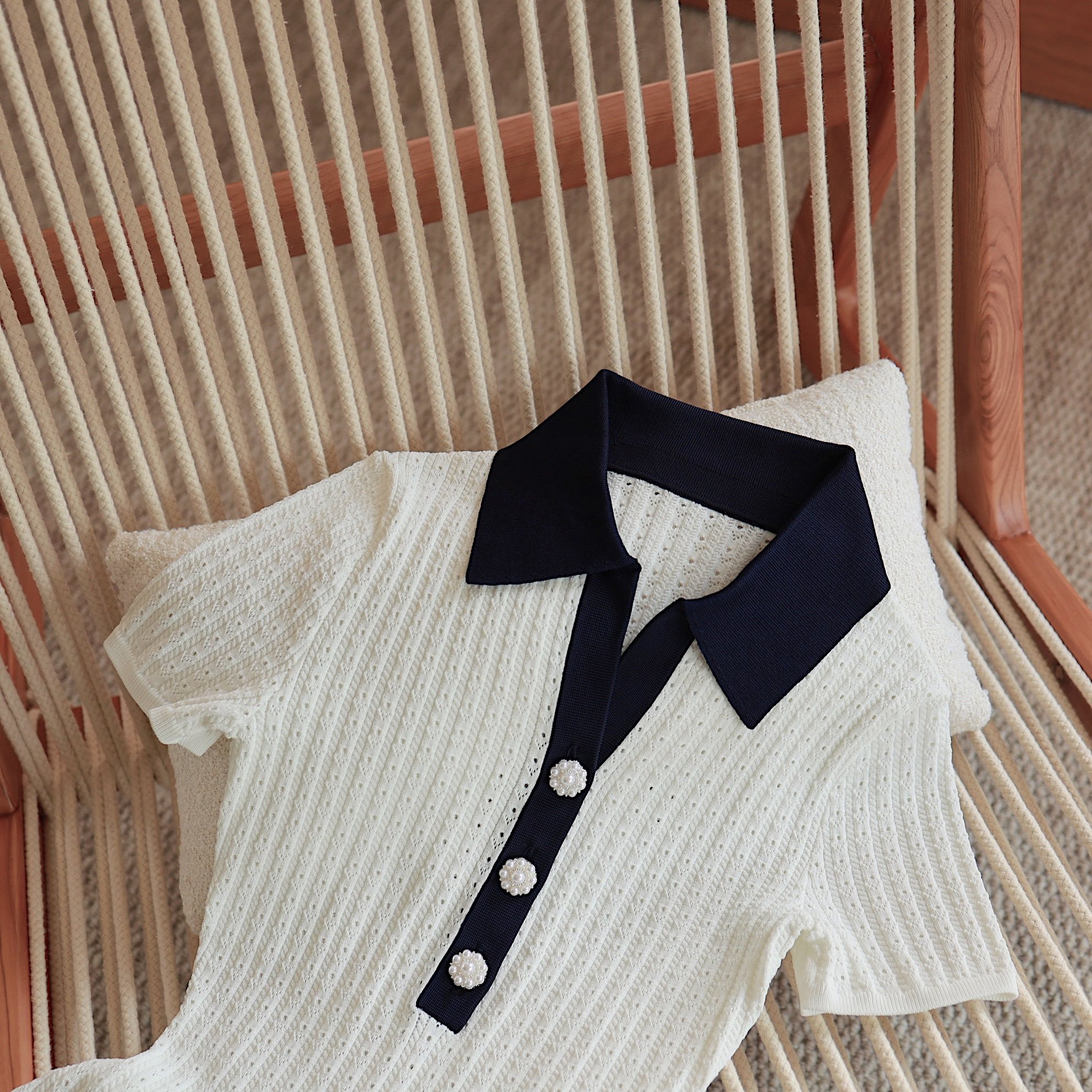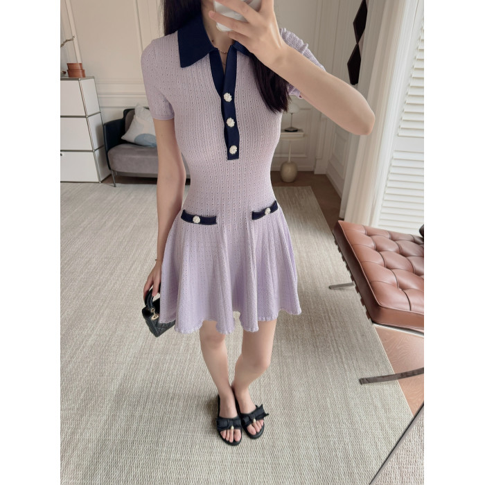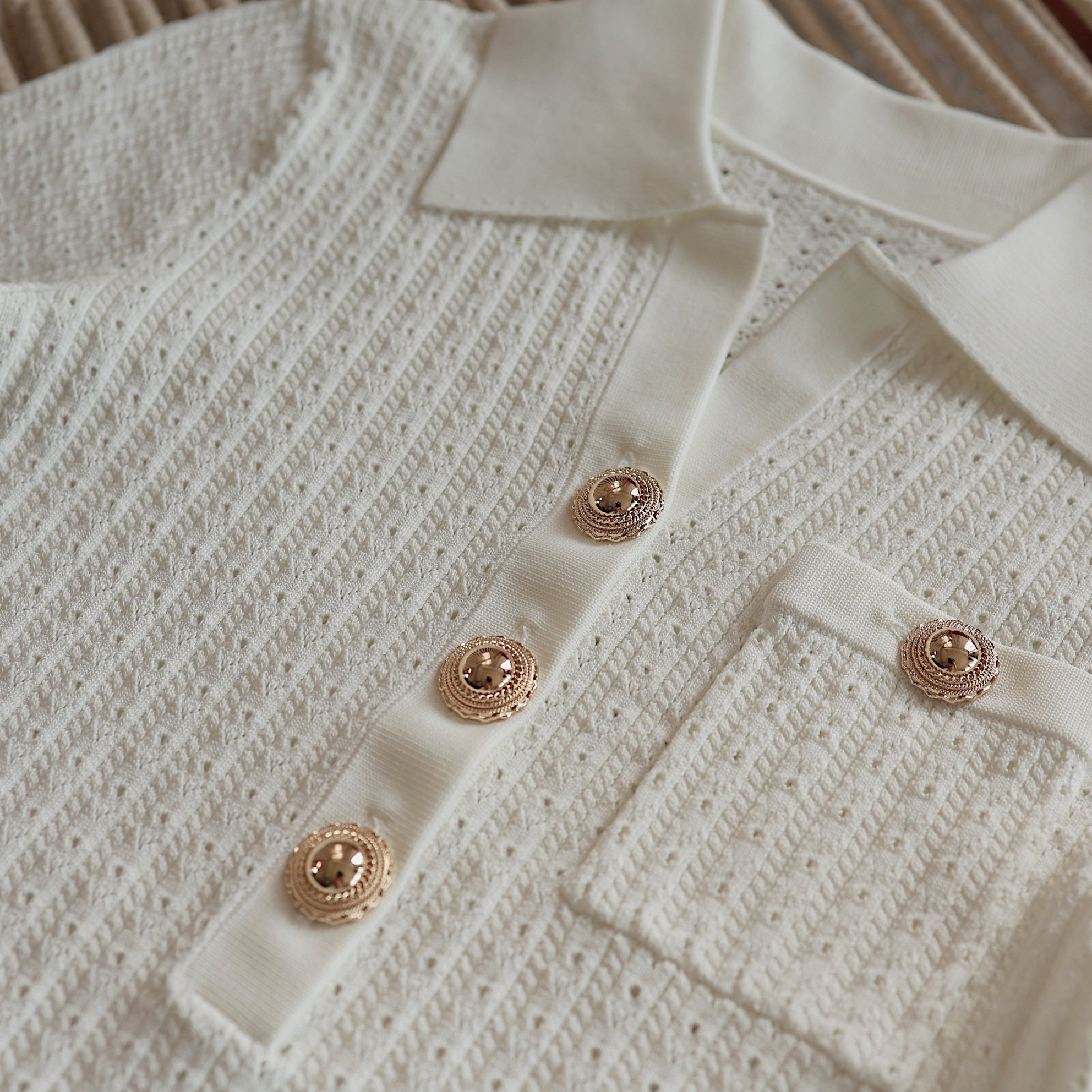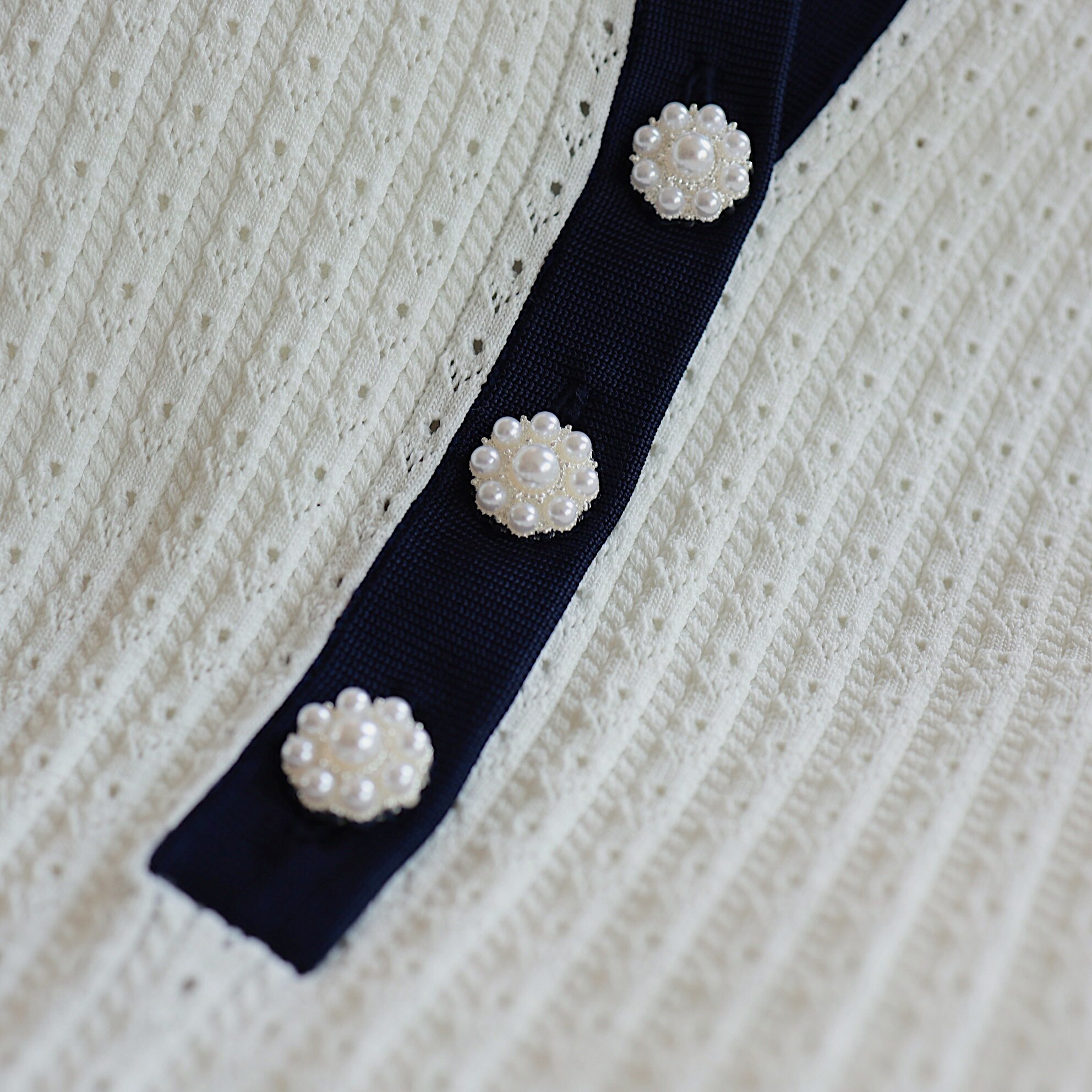 Masakiki七七 優雅小香風珍珠釦鏤空連衣裙+繙領金釦短針織衫