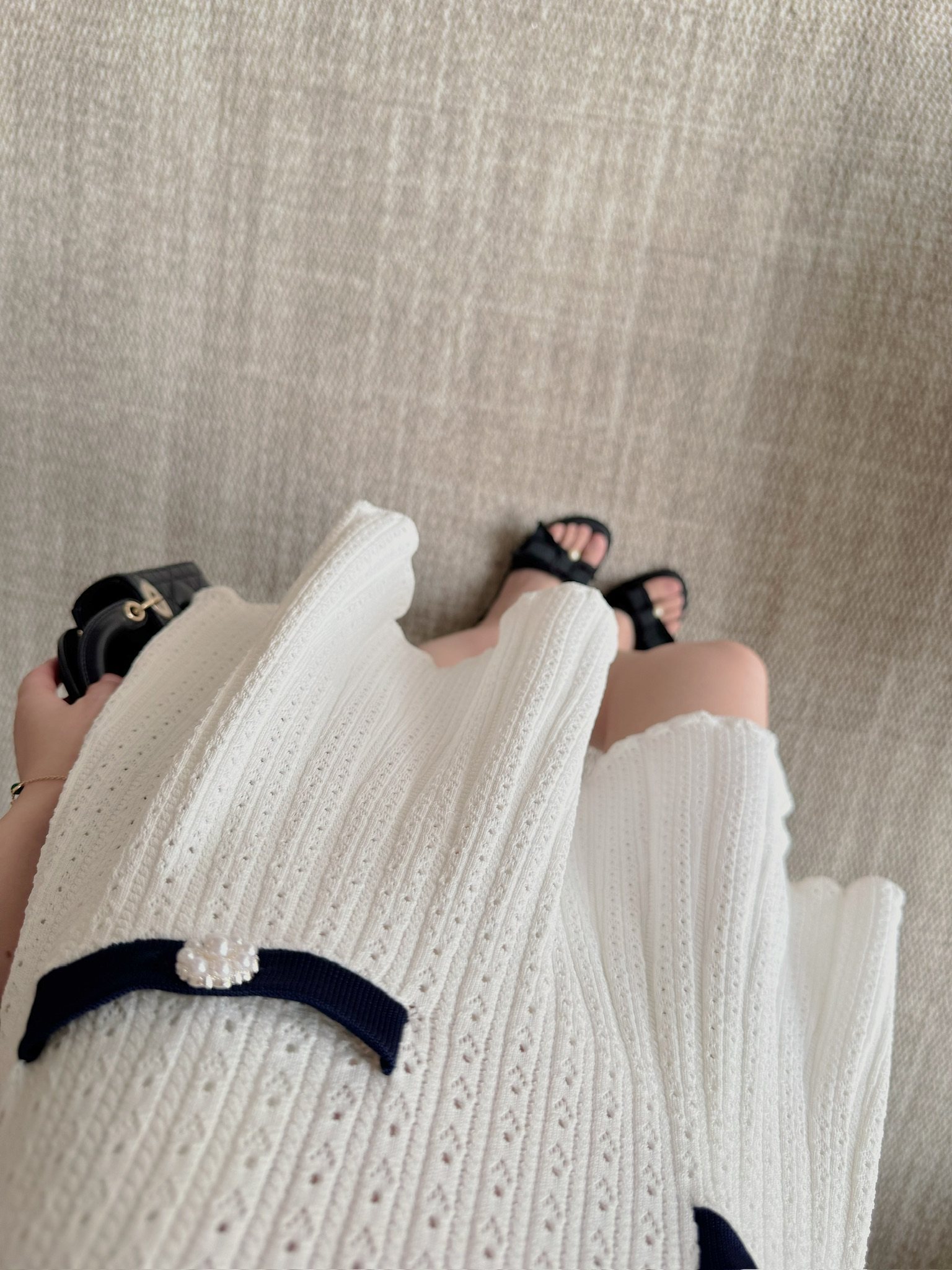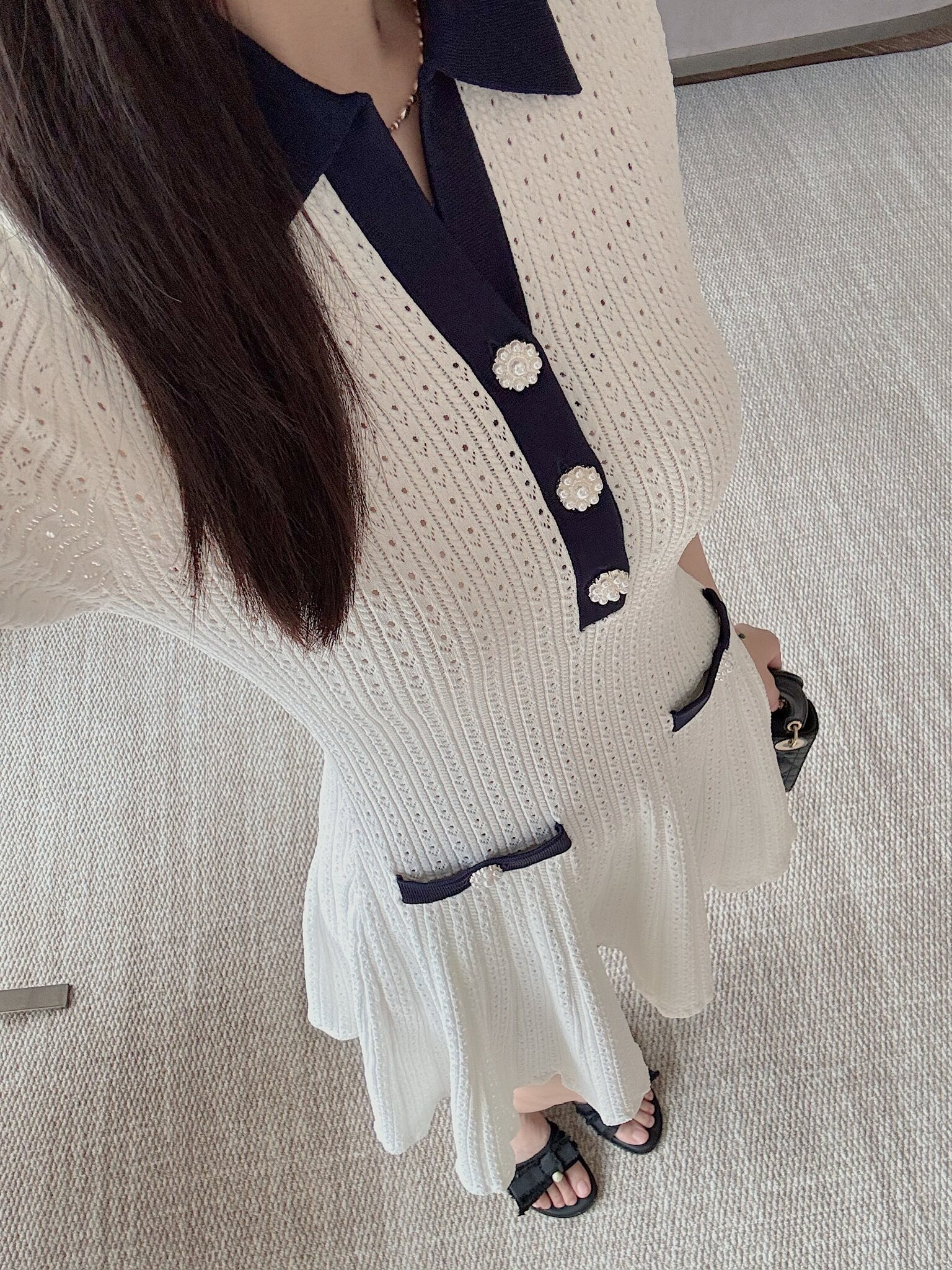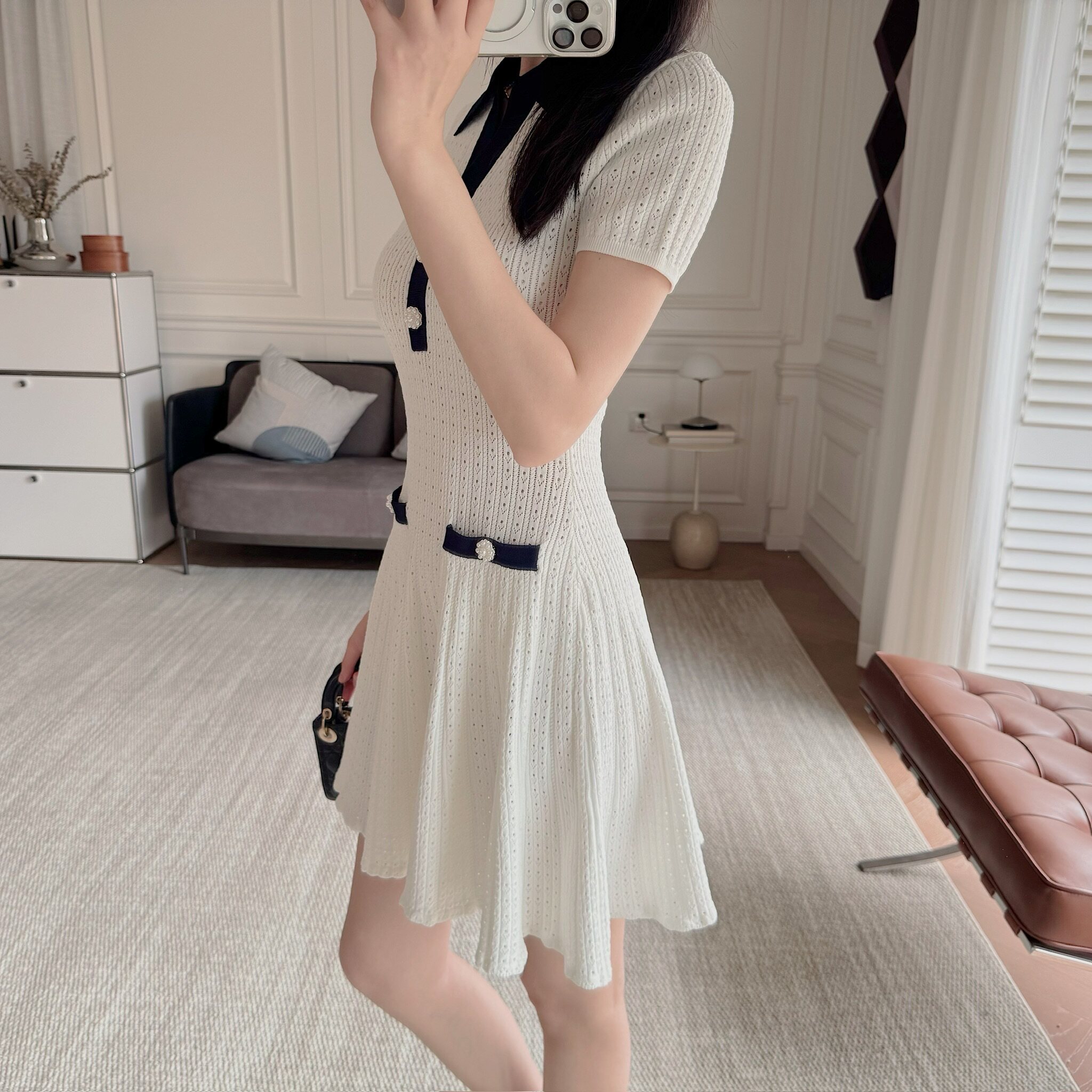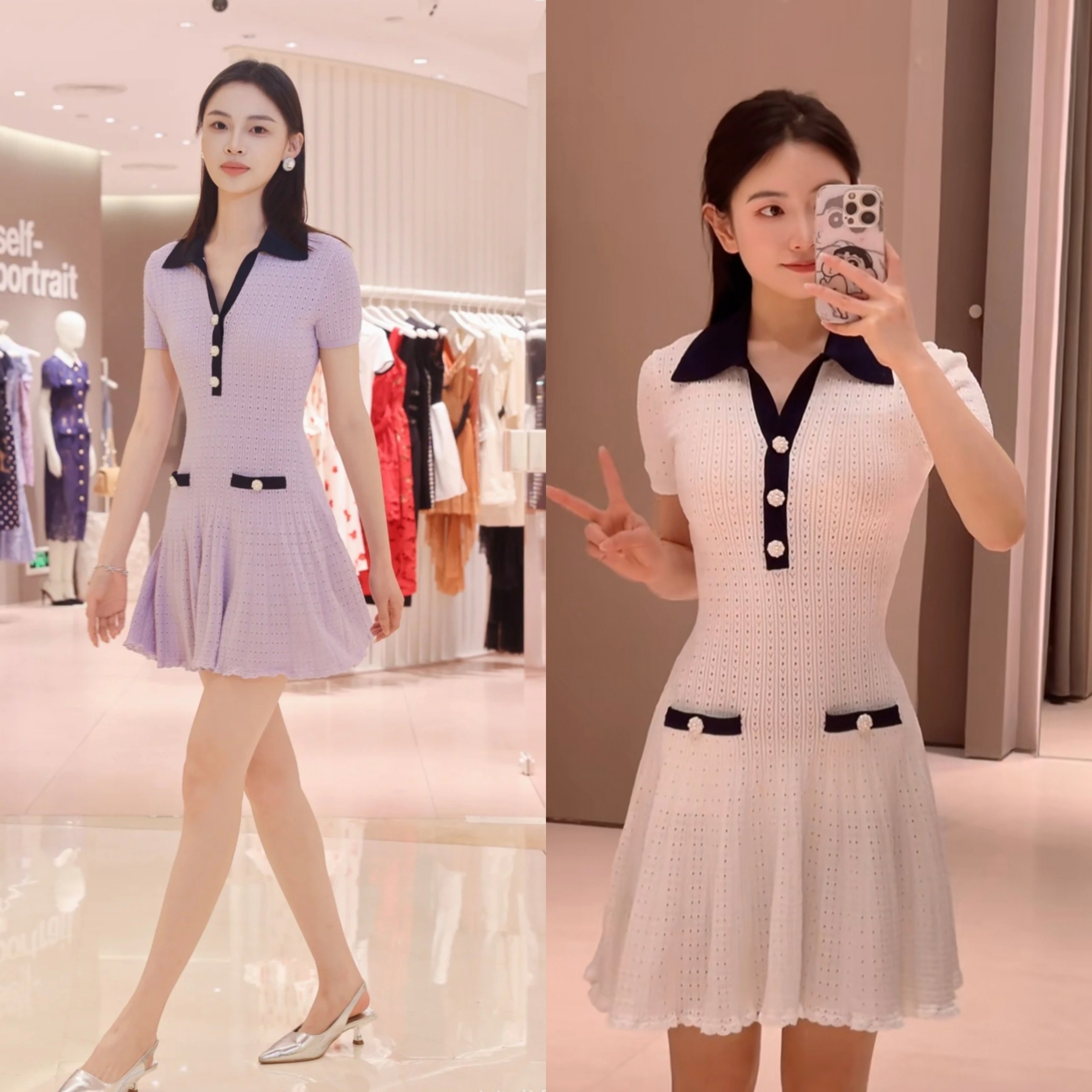 上衣和連衣裙是同系列,都是挑孔鏤空針織
