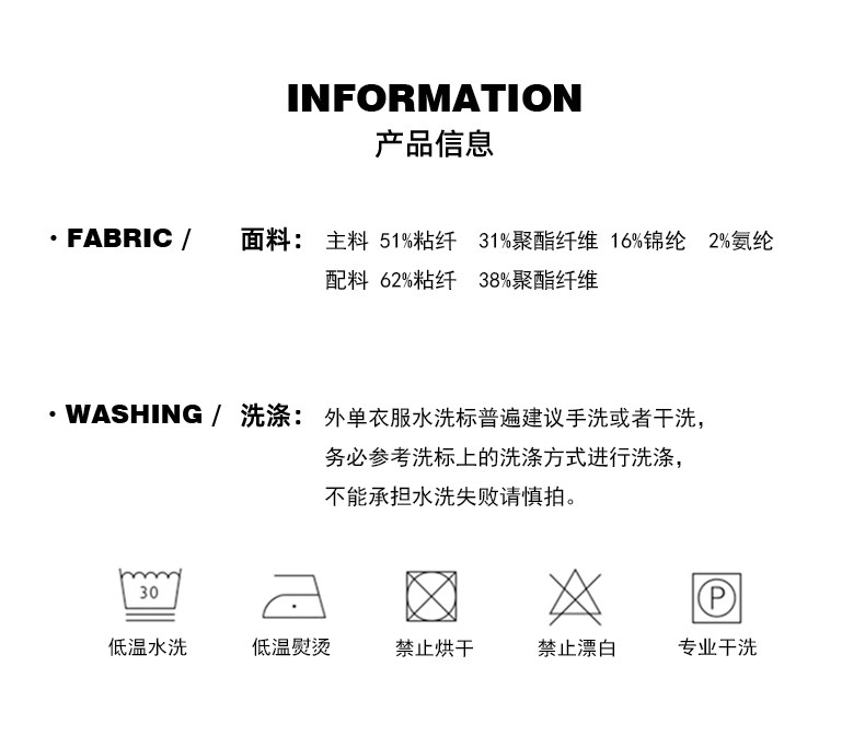 | 材質成分 | 粘膠纖維(粘纖)51% 聚酯纖維31% 聚醯胺纖維(錦綸)16% 聚氨酯彈性纖維(氨綸)2% |