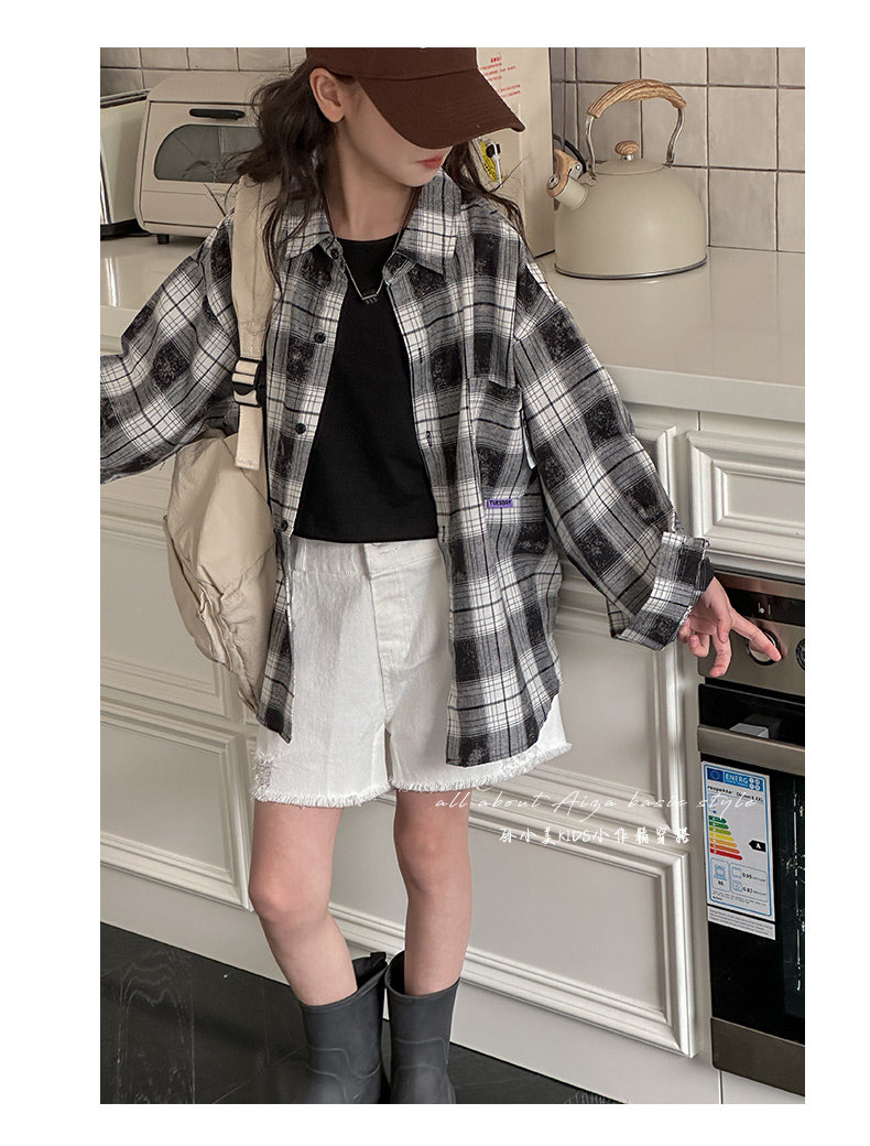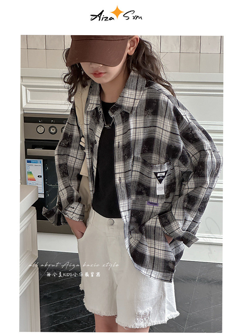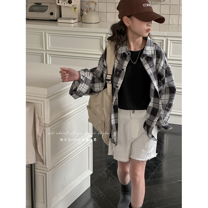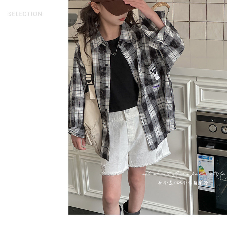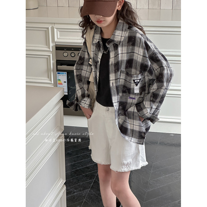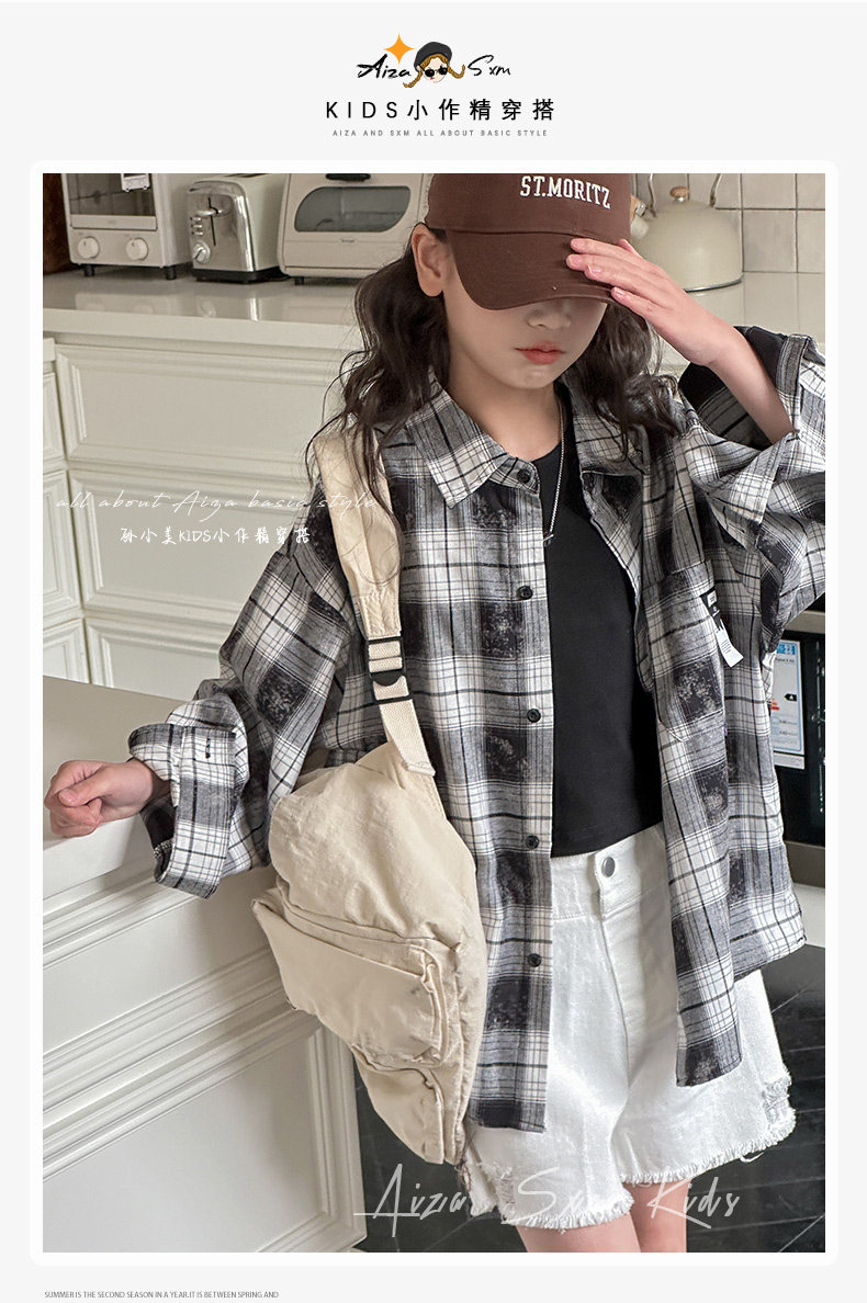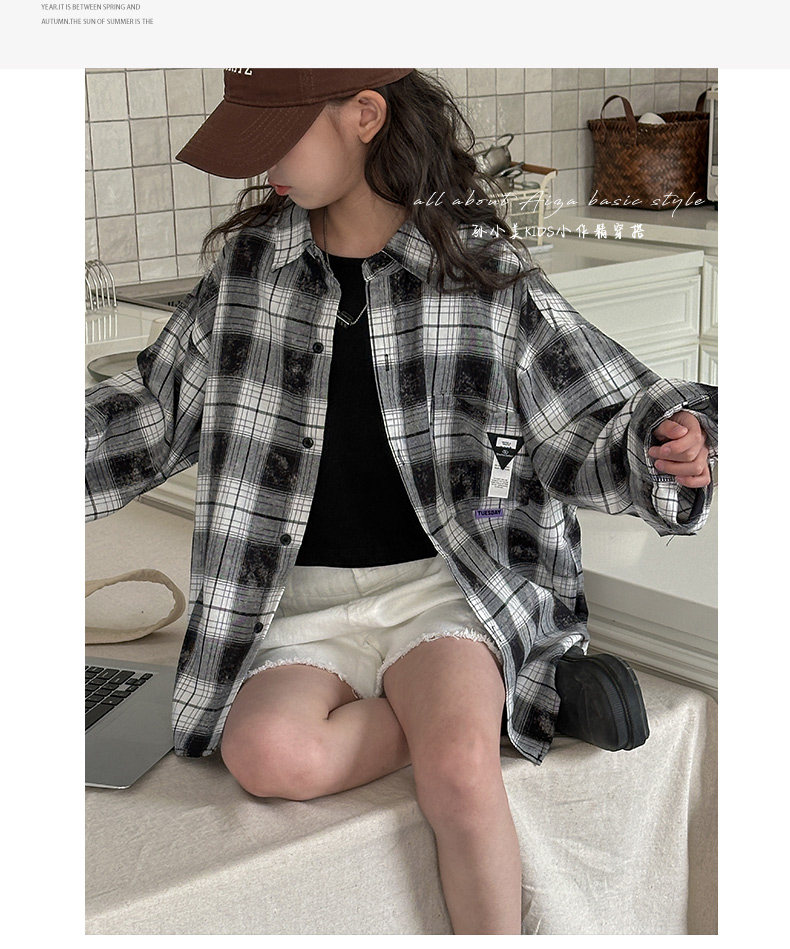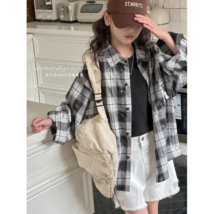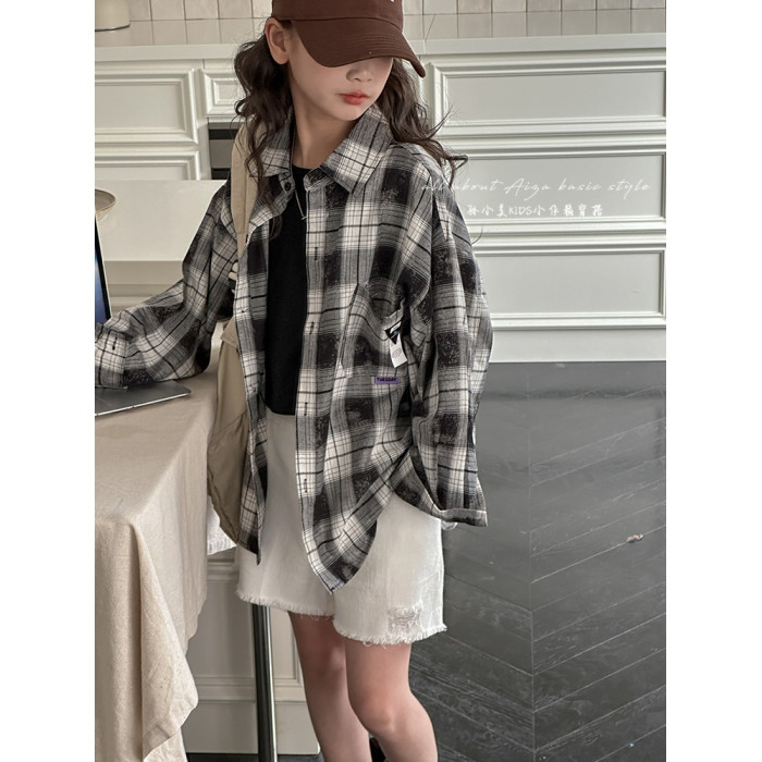 韓國女童黑白格子襯衫2025秋裝韓新款兒童外套女大童春秋洋氣上衣