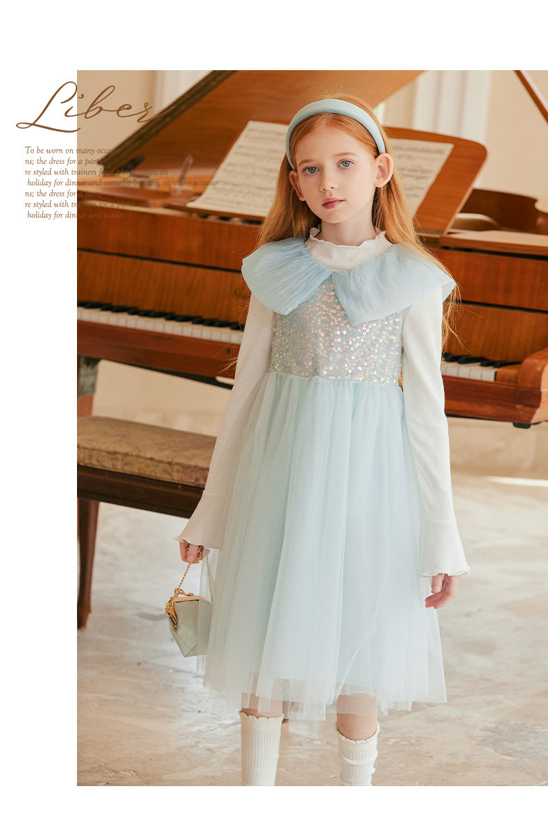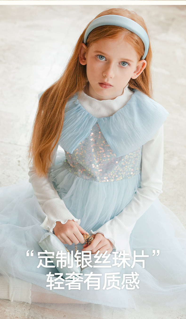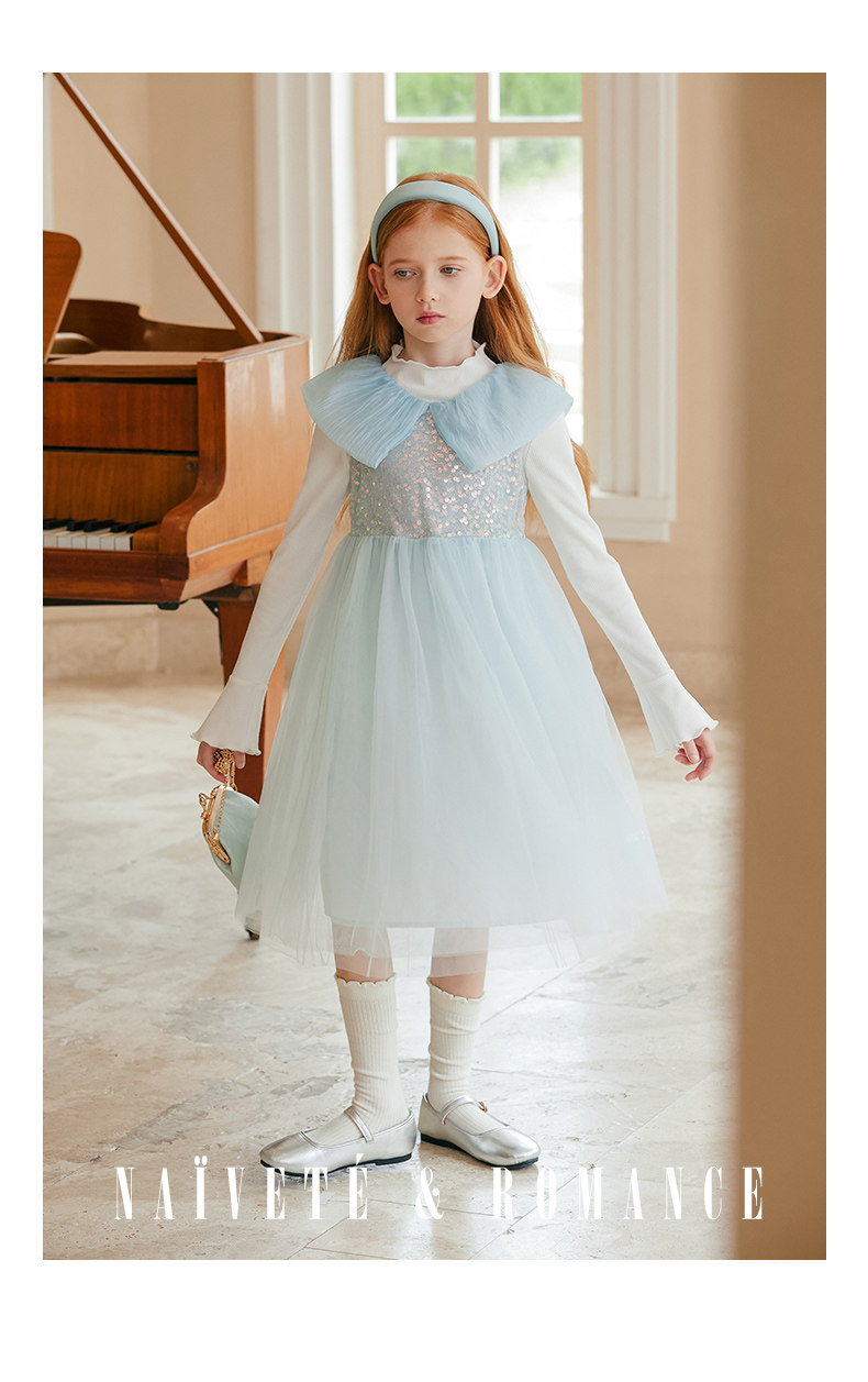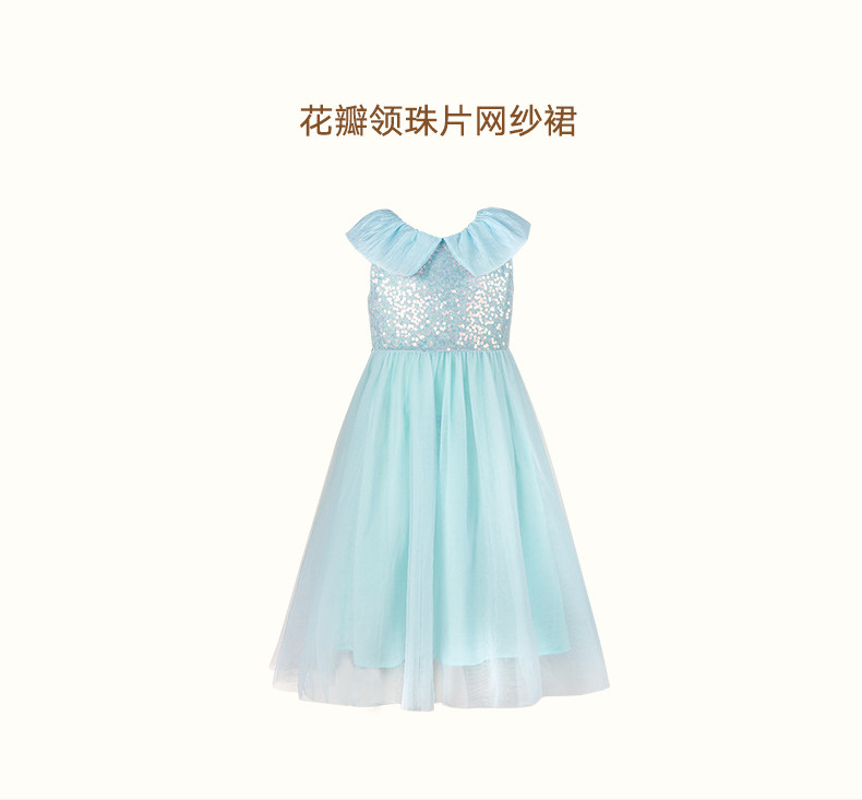 LittleNaive女童連衣裙春秋公主裙新款花瓣領兒童珠片蓬蓬網紗裙