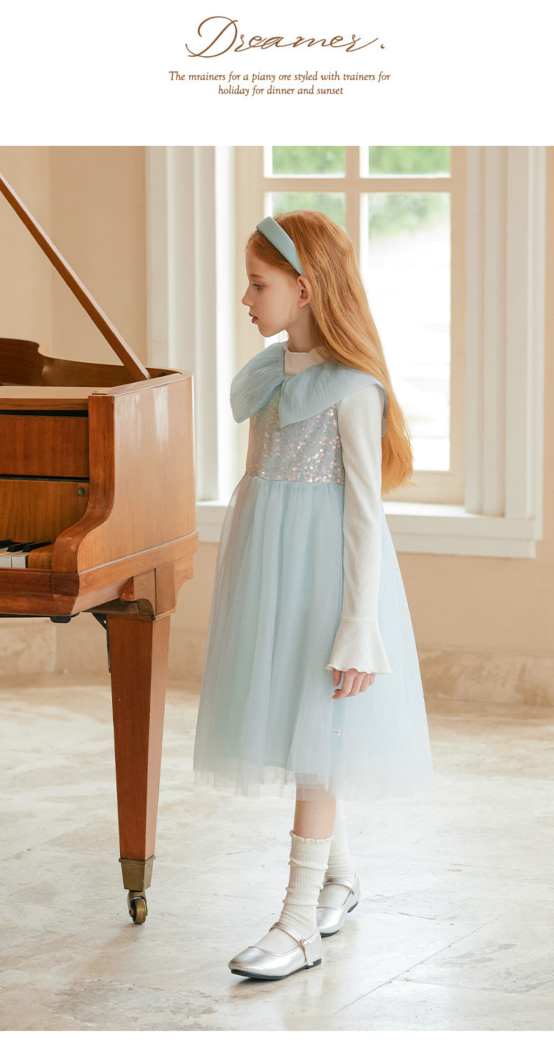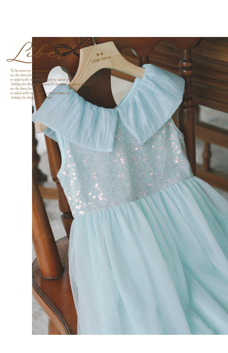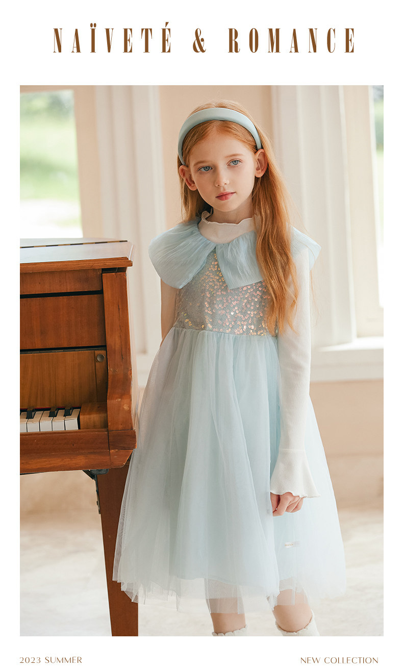 LittleNaive女童連衣裙春秋公主裙新款花瓣領兒童珠片蓬蓬網紗裙