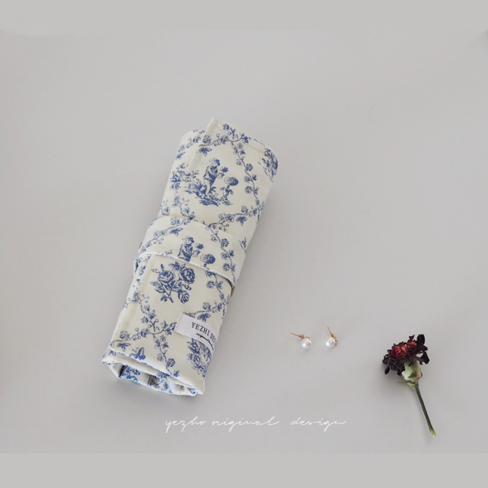 野梔原創美妝刷包手工法式復古浪漫藍色印花旅遊可攜式化妝刷收納包