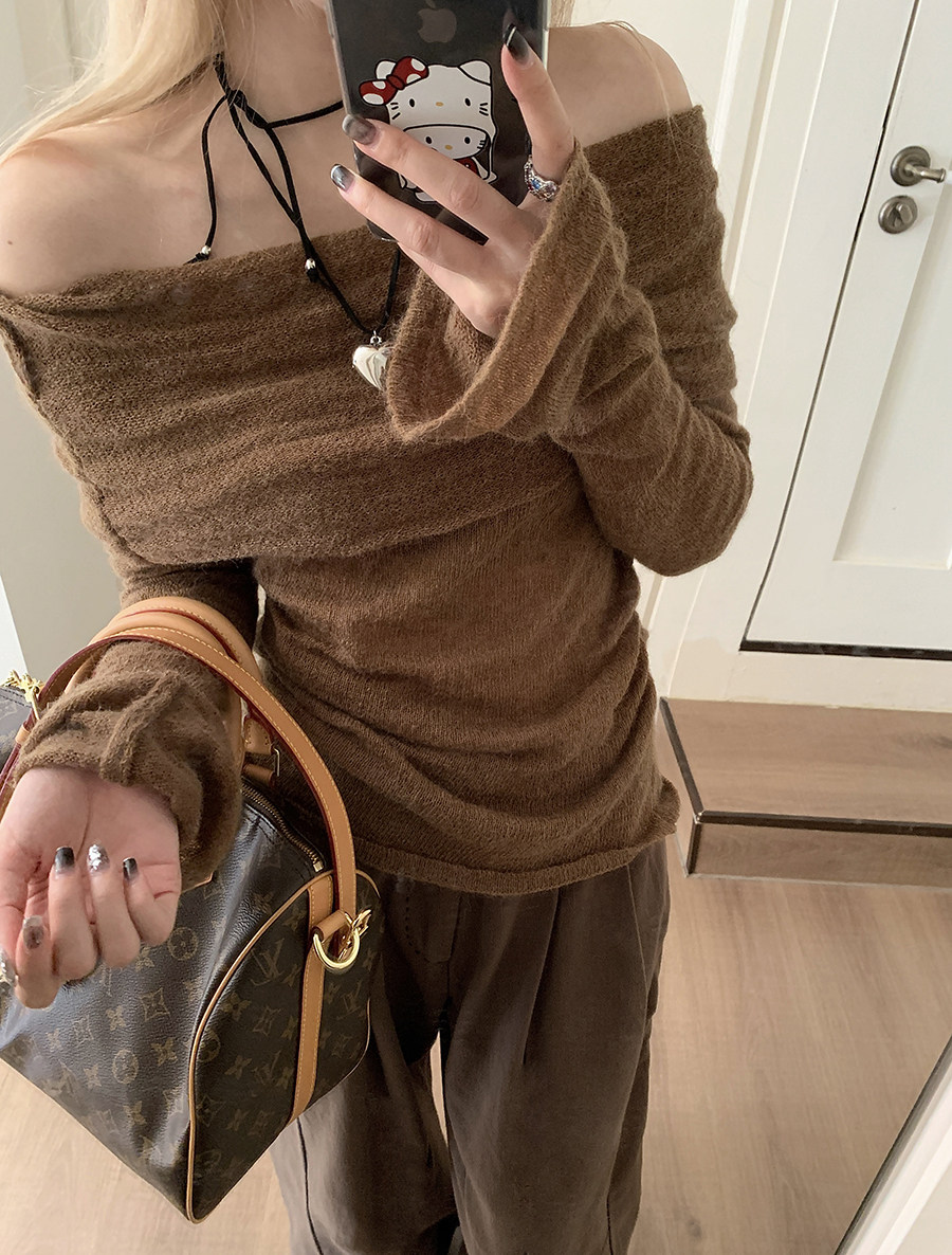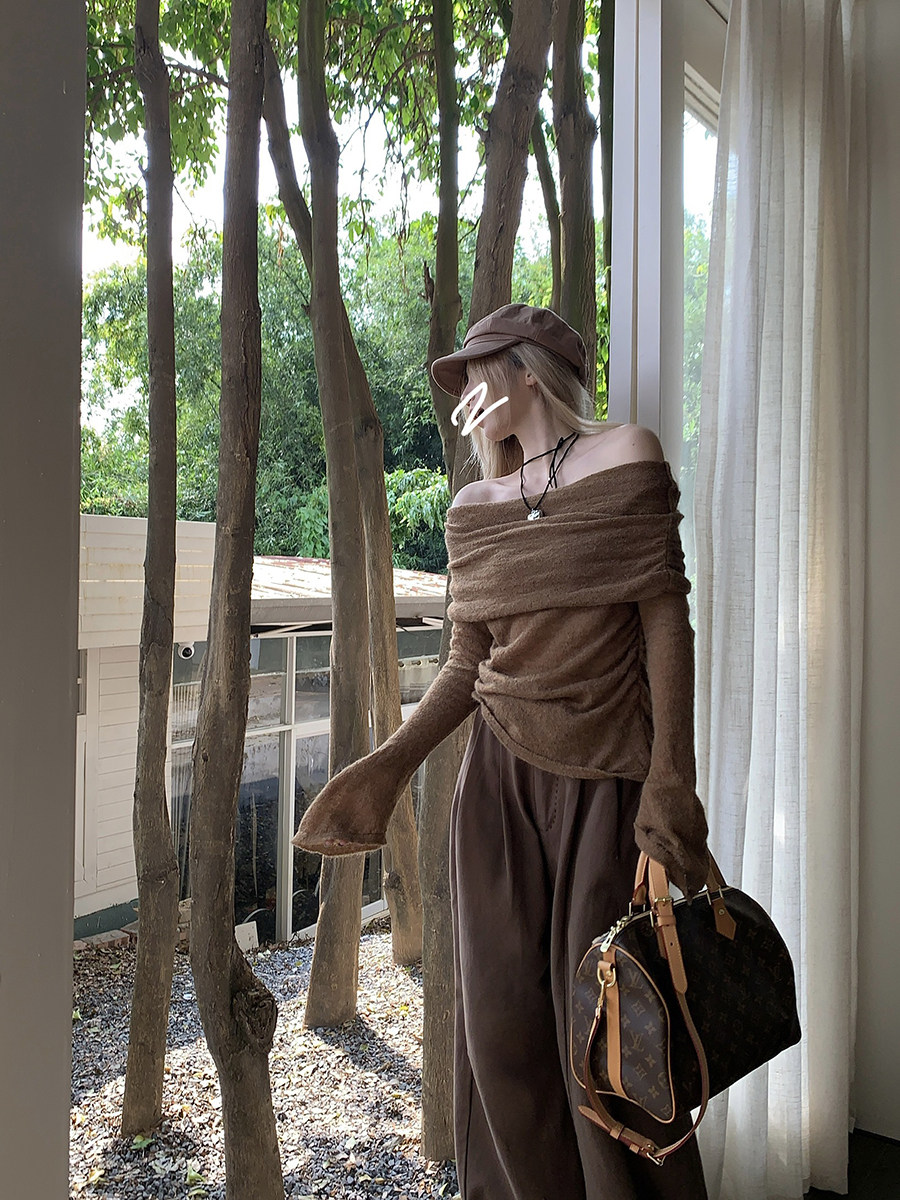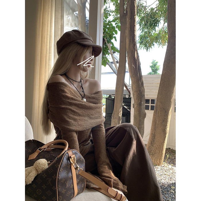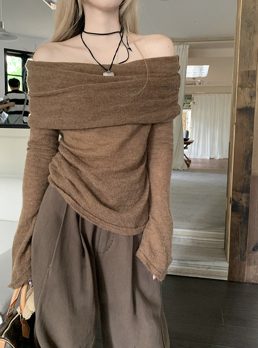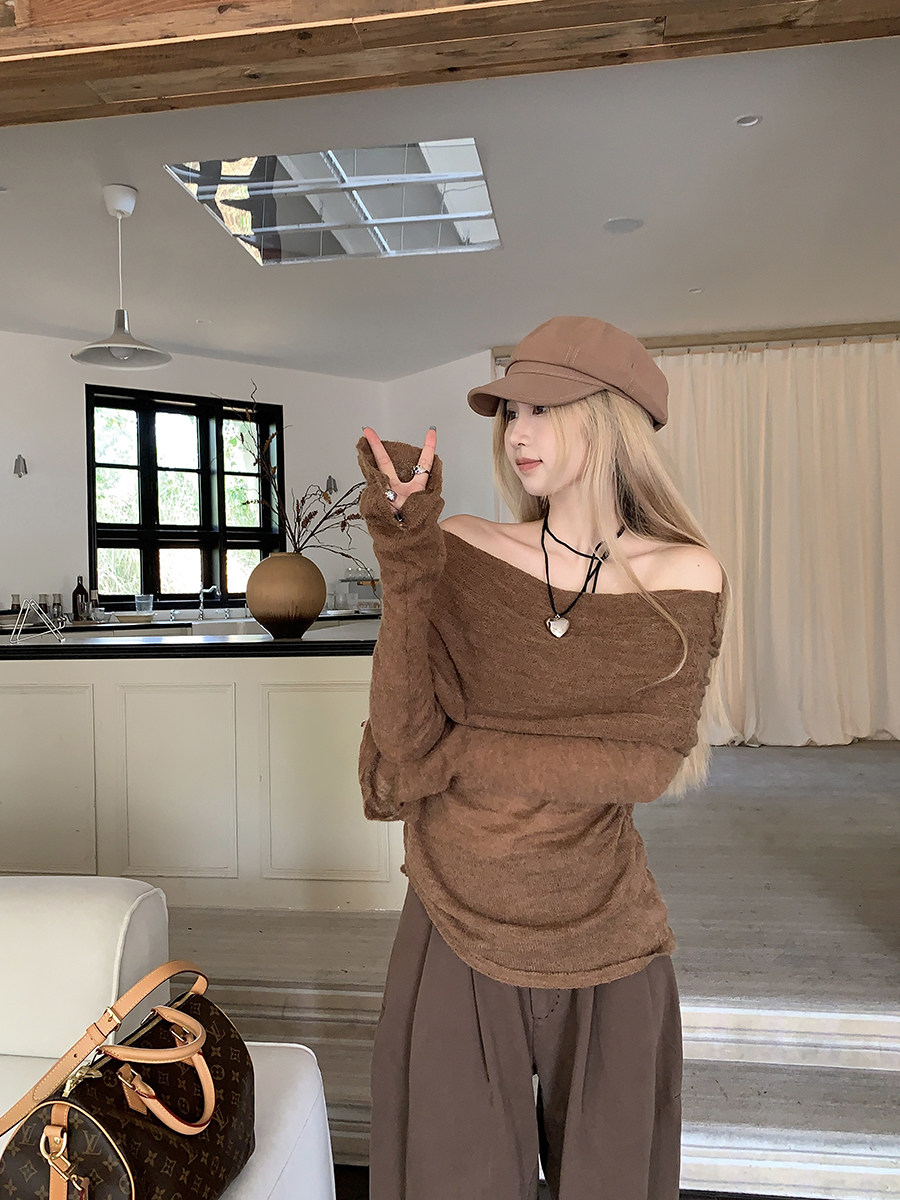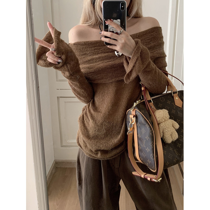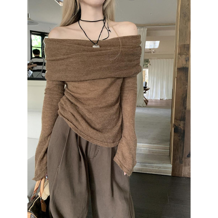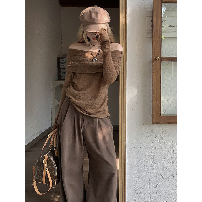 初秋氛圍感美拉德穿搭一字肩打底衫女秋季露肩高級感針織衫上衣
