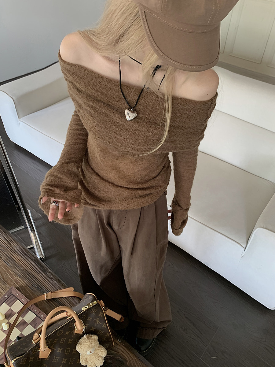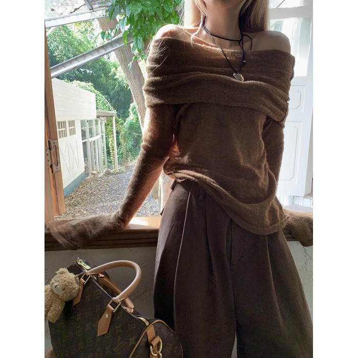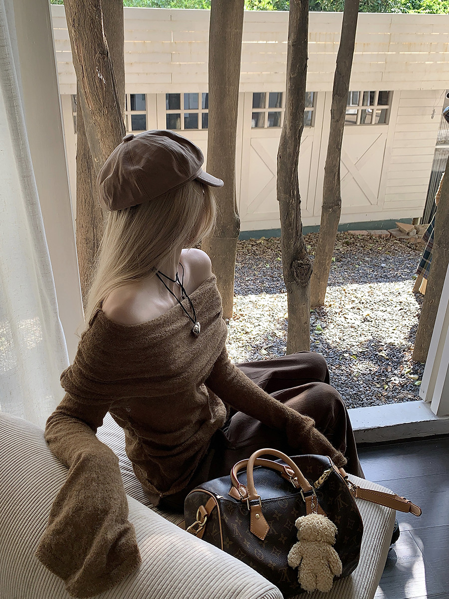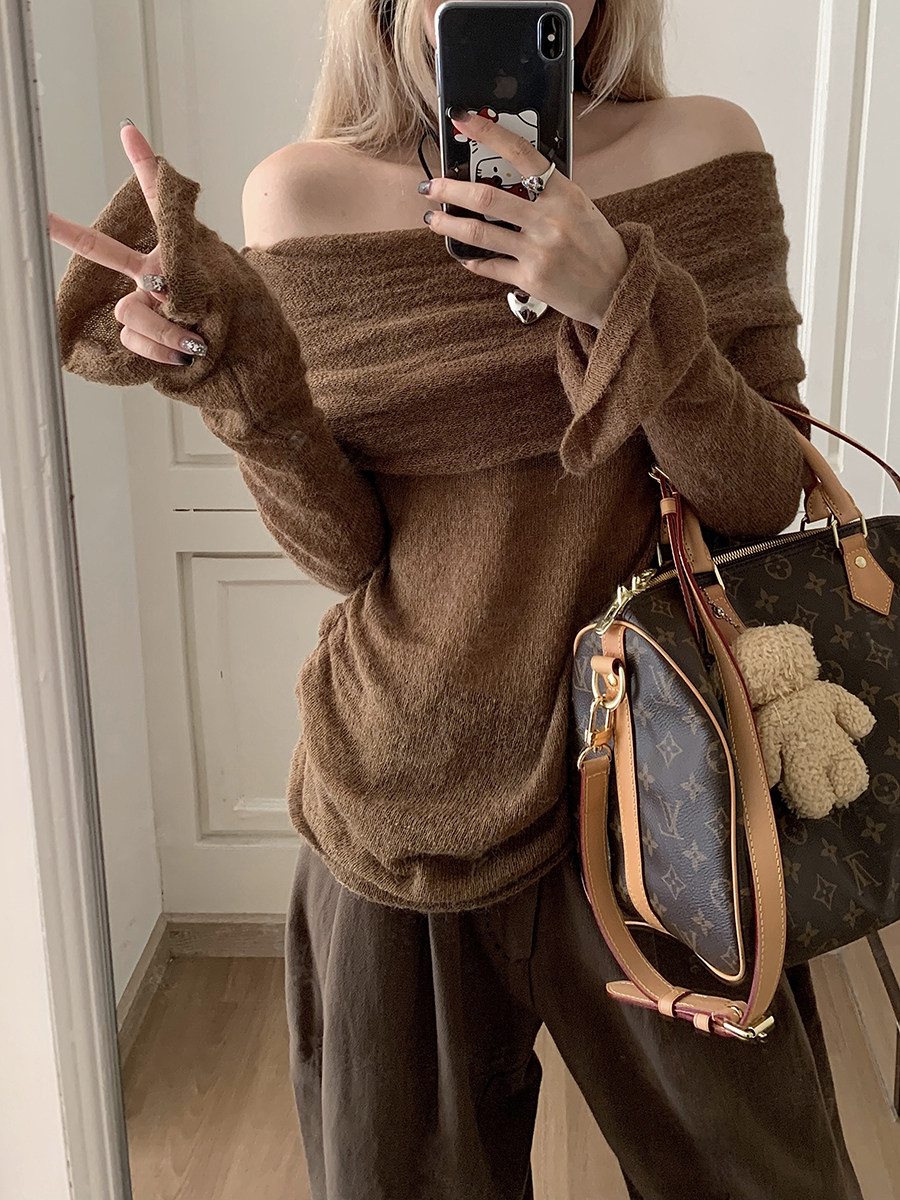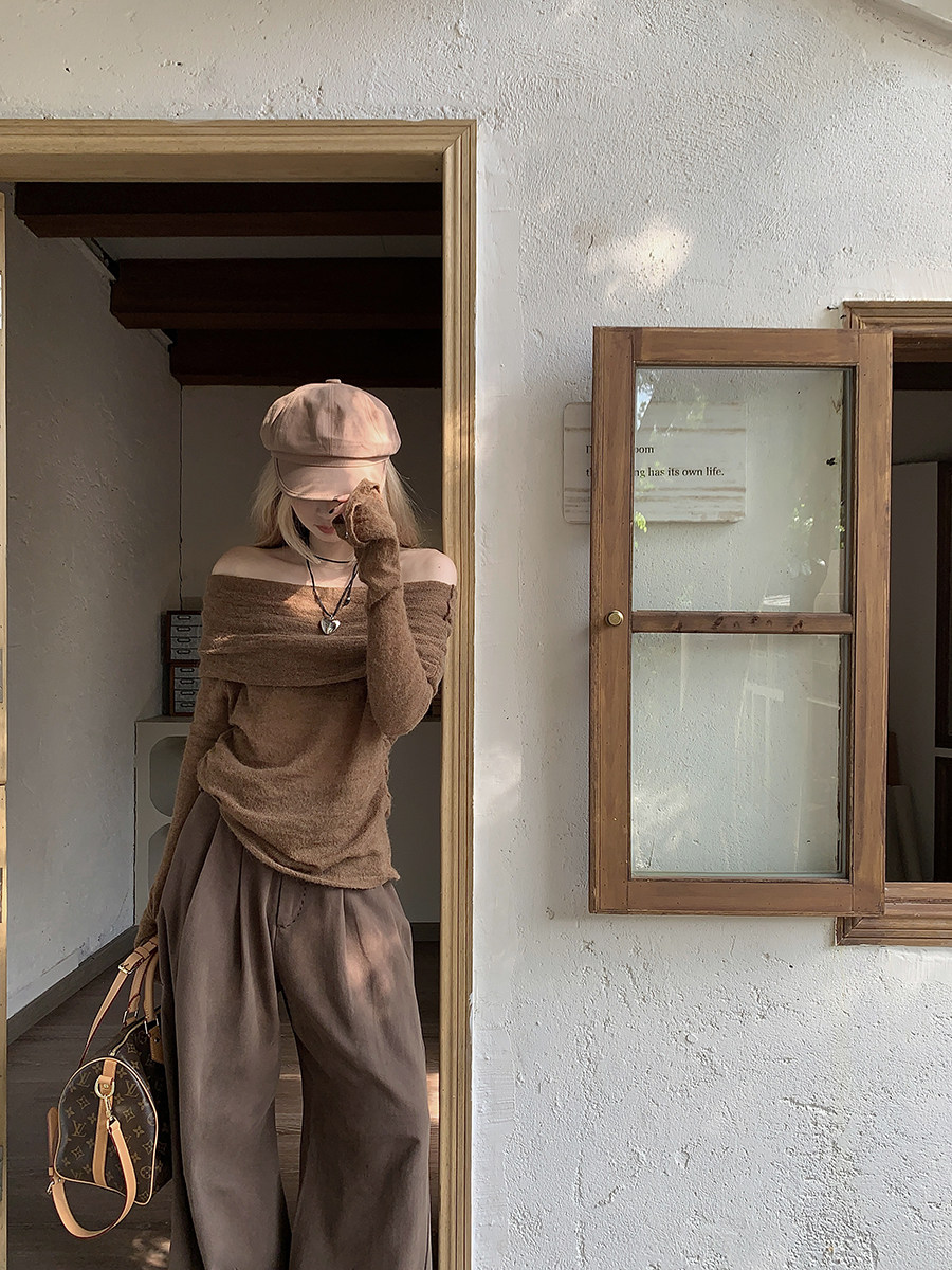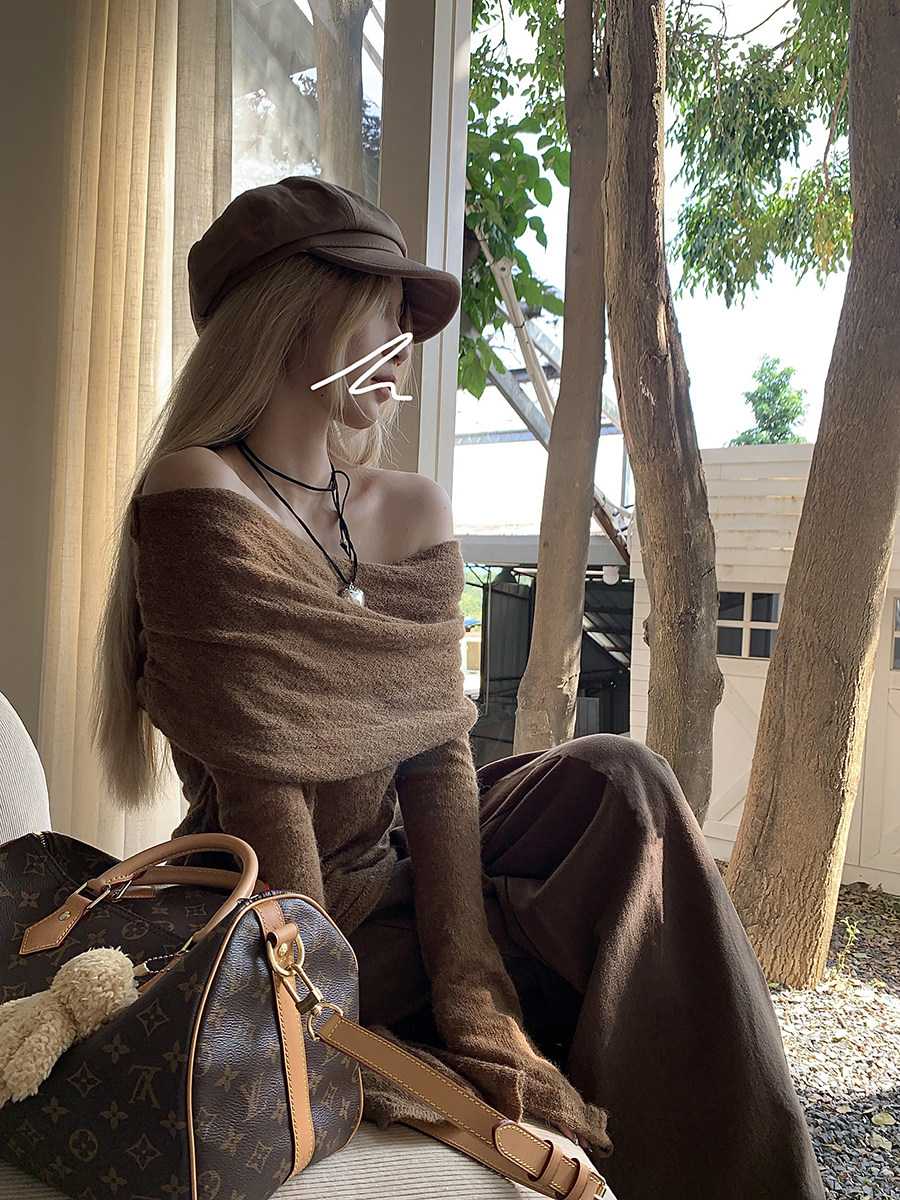 初秋氛圍感美拉德穿搭一字肩打底衫女秋季露肩高級感針織衫上衣