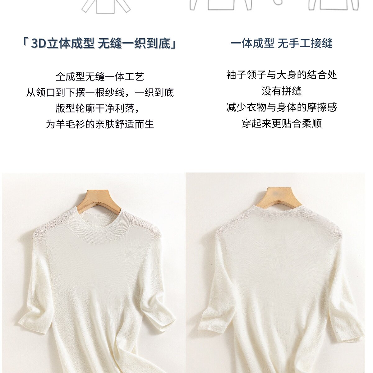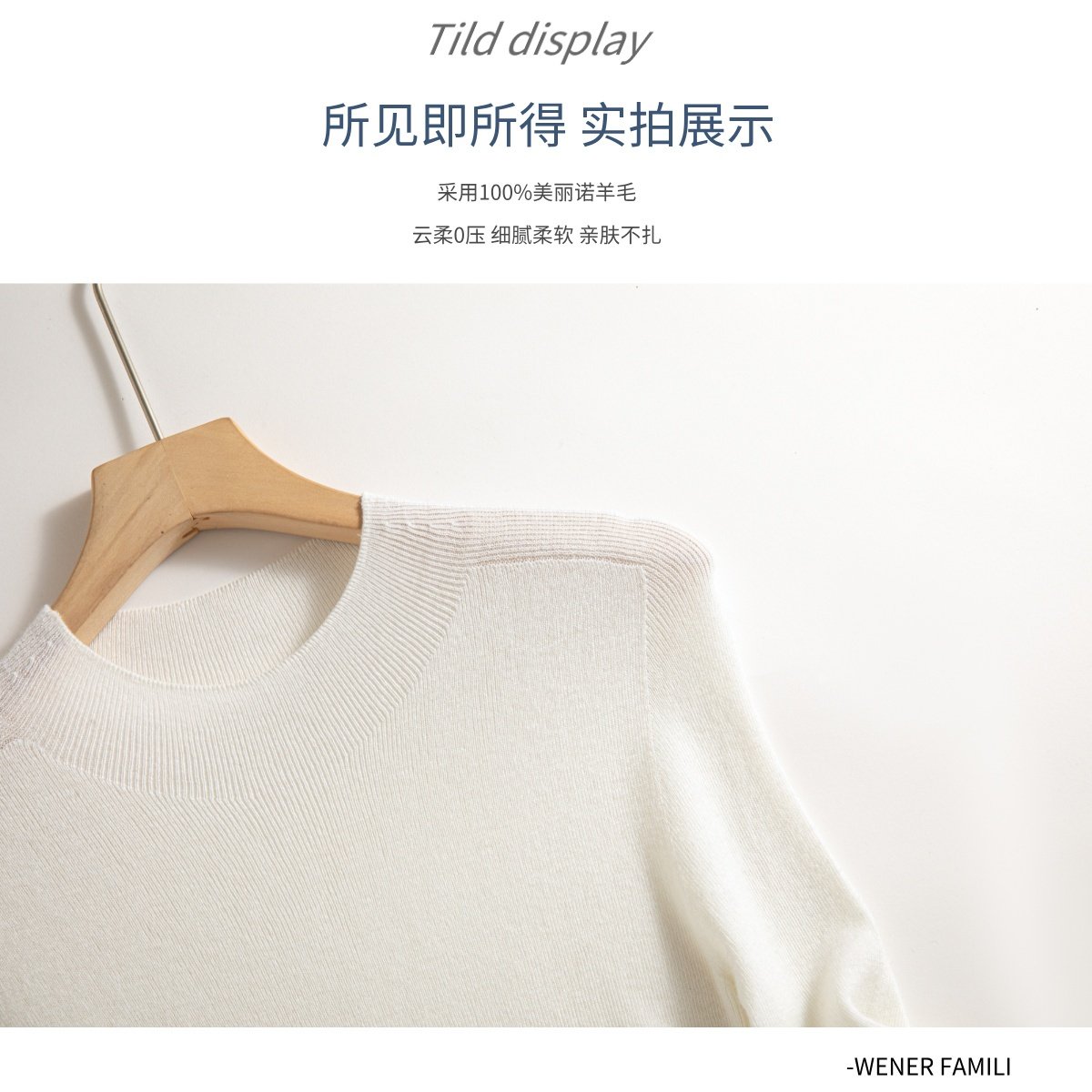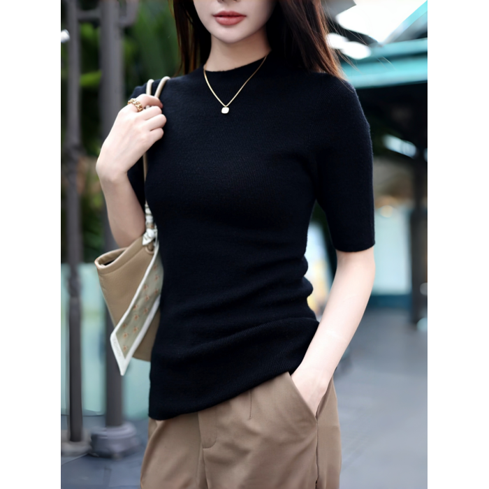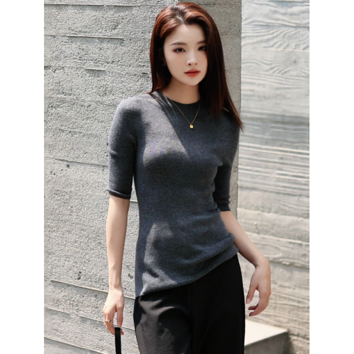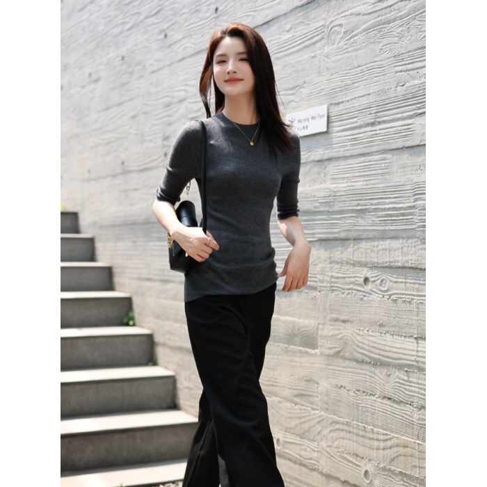 溫爾家 可機洗30%美麗諾羊毛打底衫女中袖春秋季修身針織衫上衣