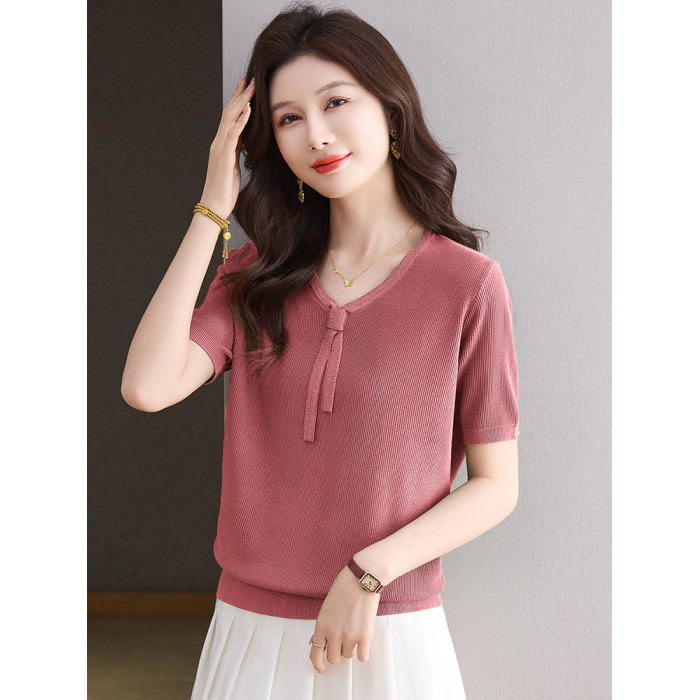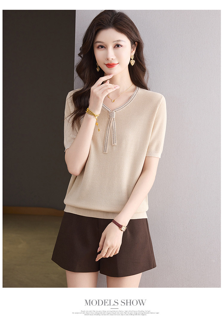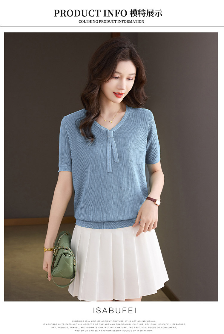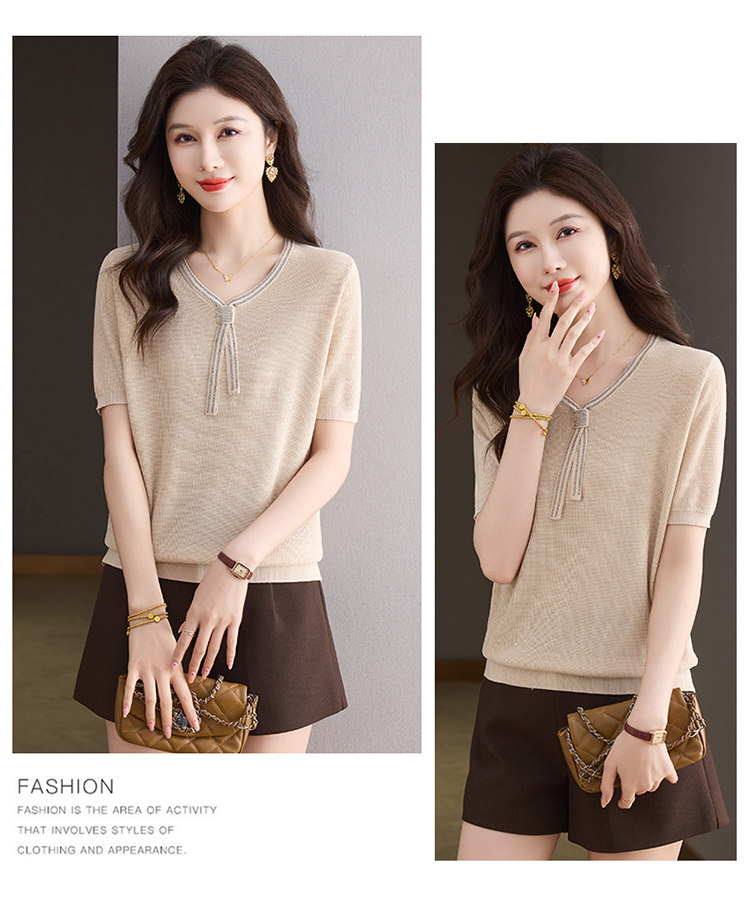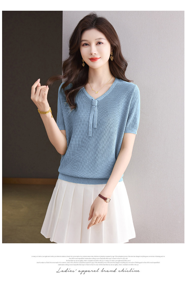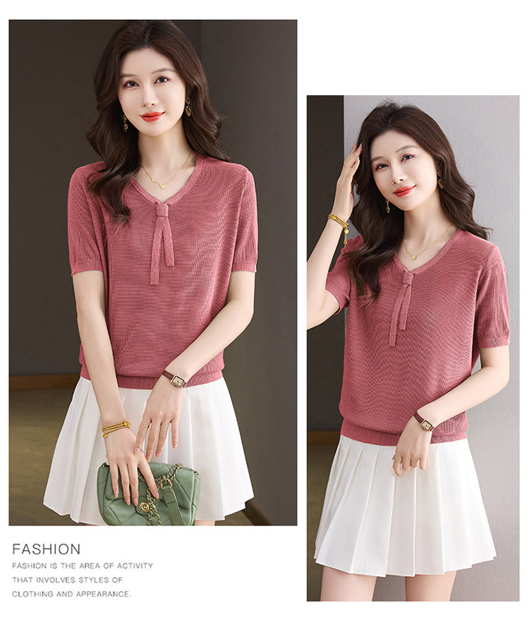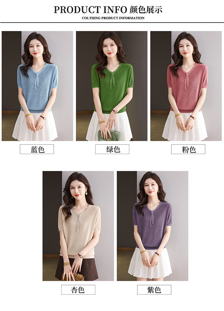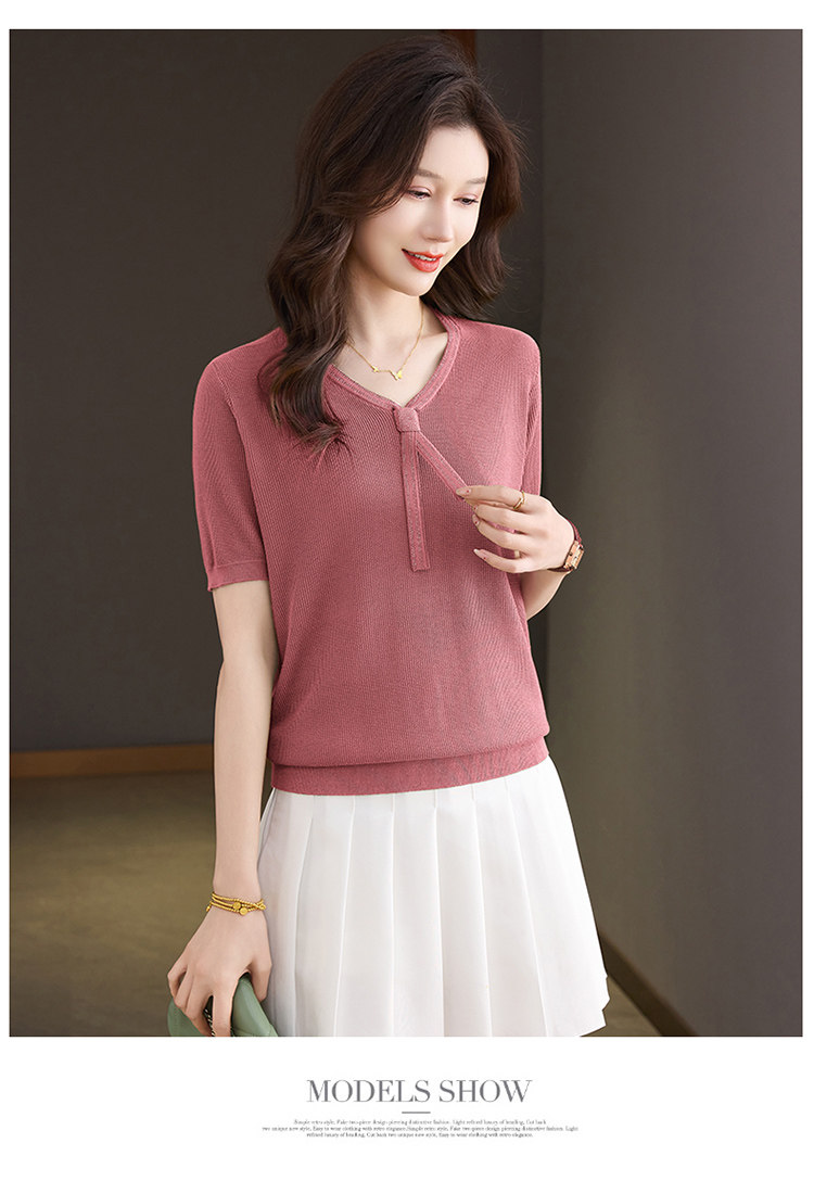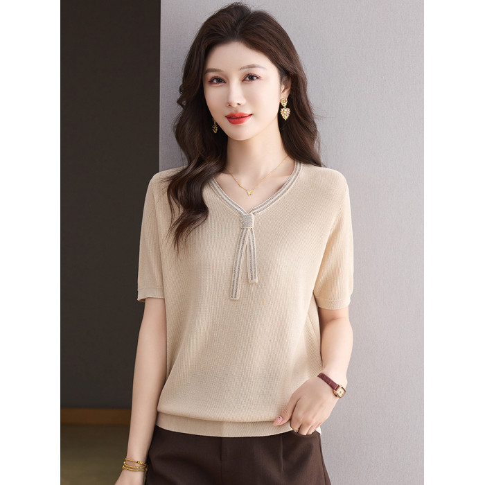 桑蠶絲針織衫女寬松薄款上衣短款短袖r恤時尚減齡媽媽裝V領打底衫