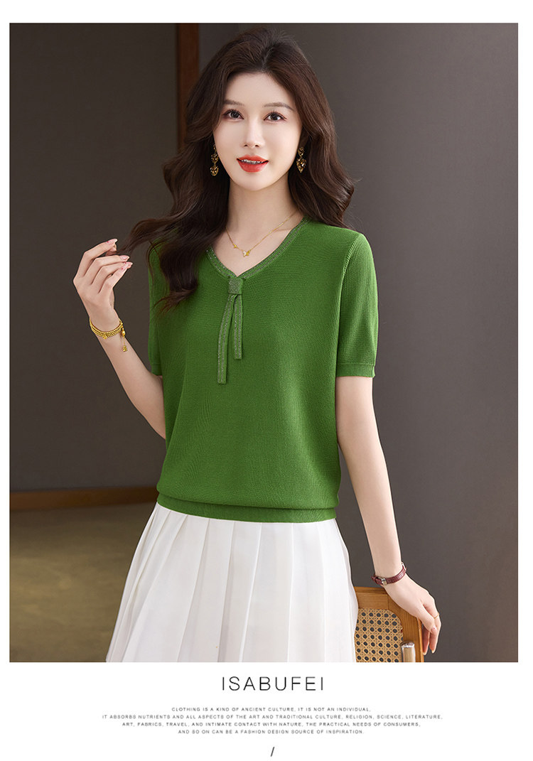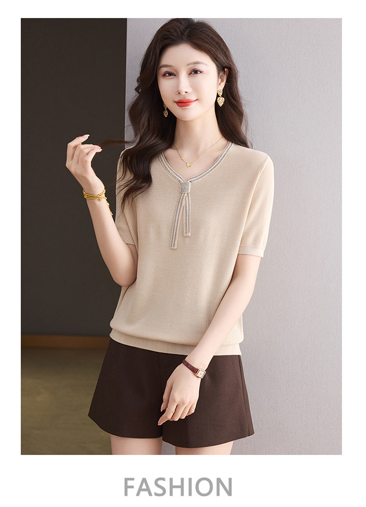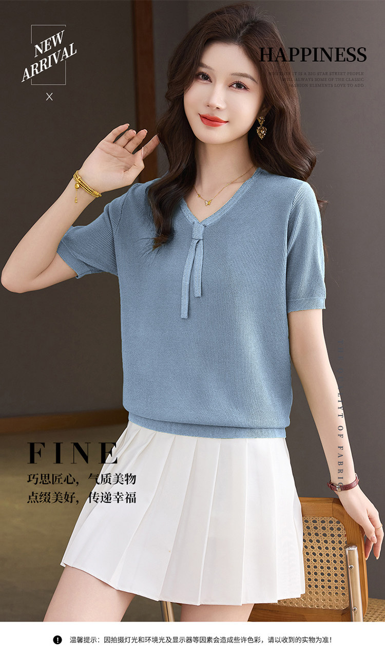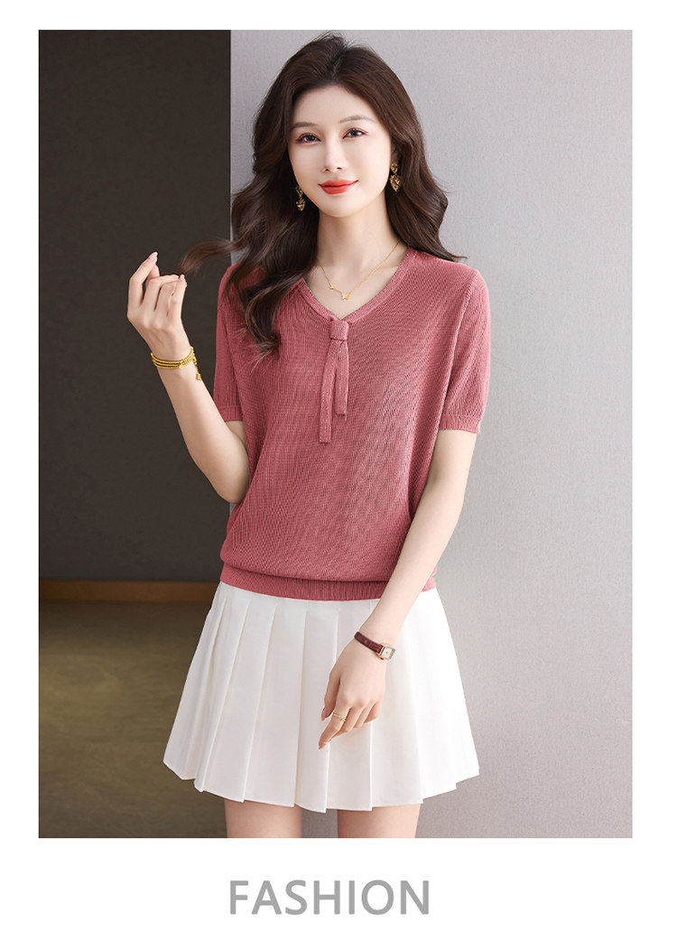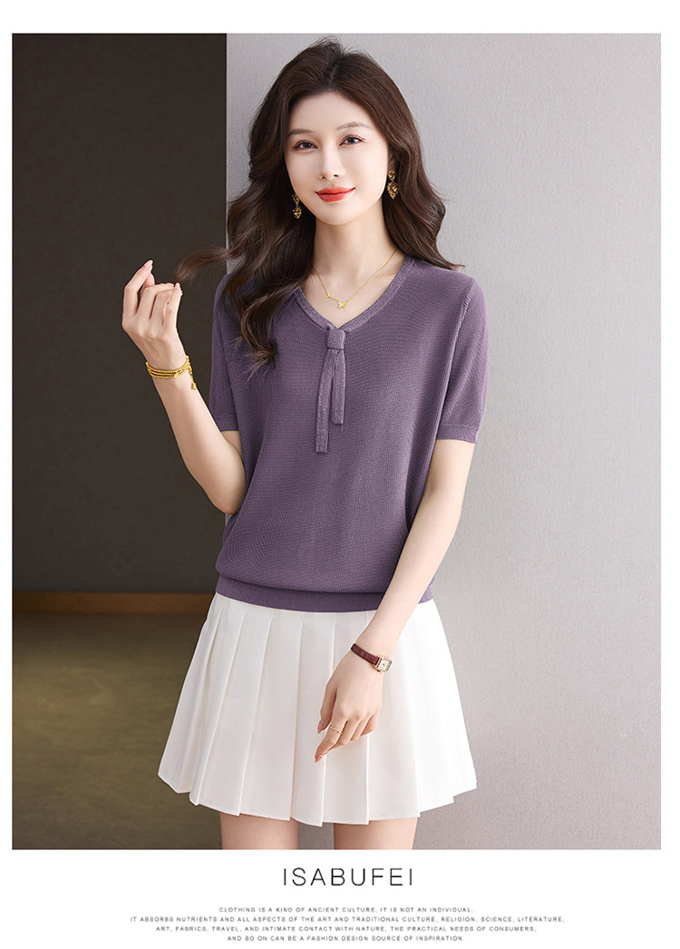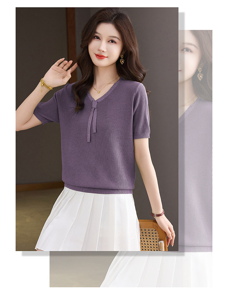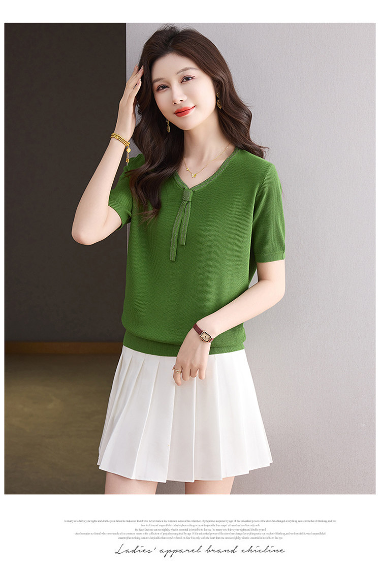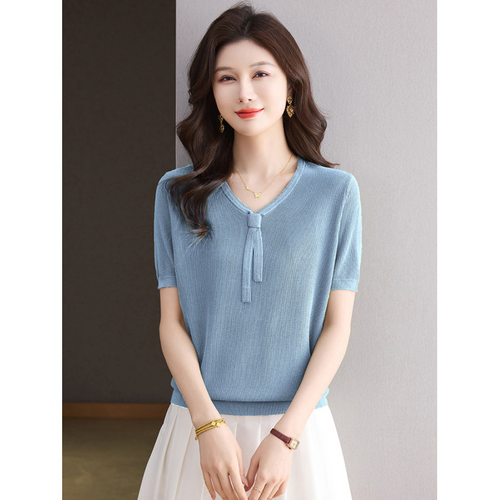 桑蠶絲針織衫女寬松薄款上衣短款短袖r恤時尚減齡媽媽裝V領打底衫