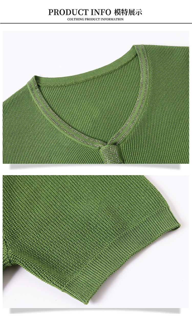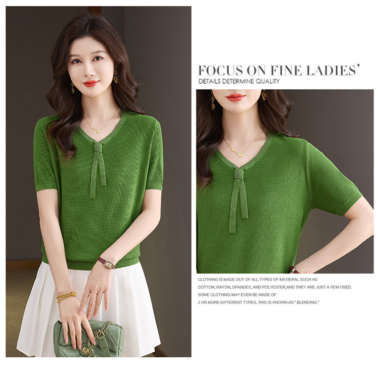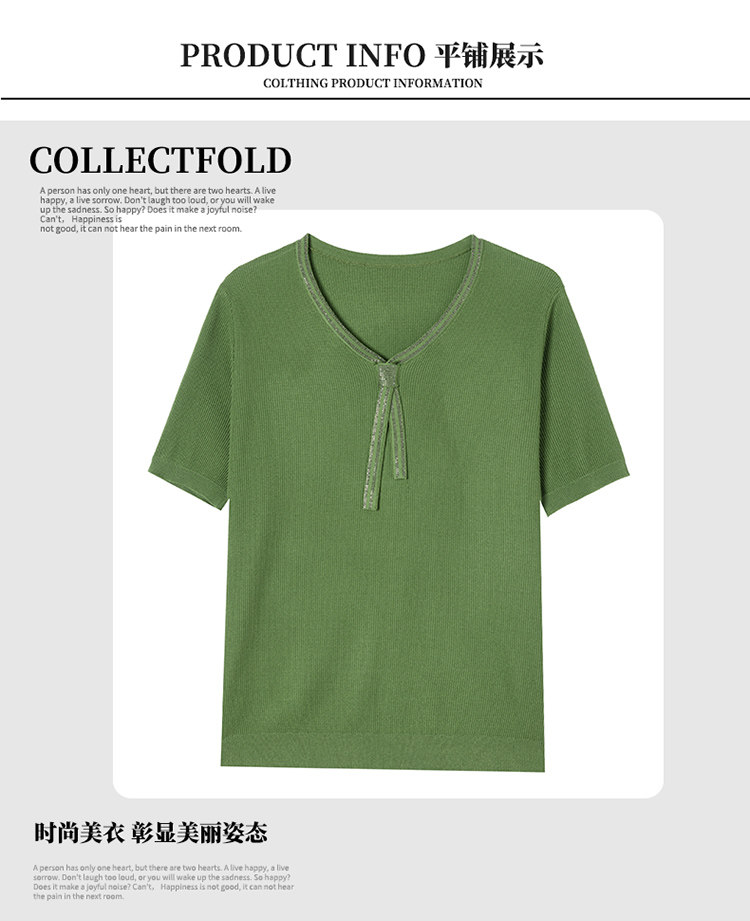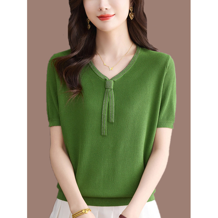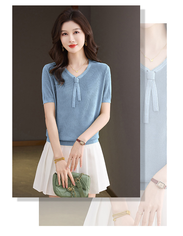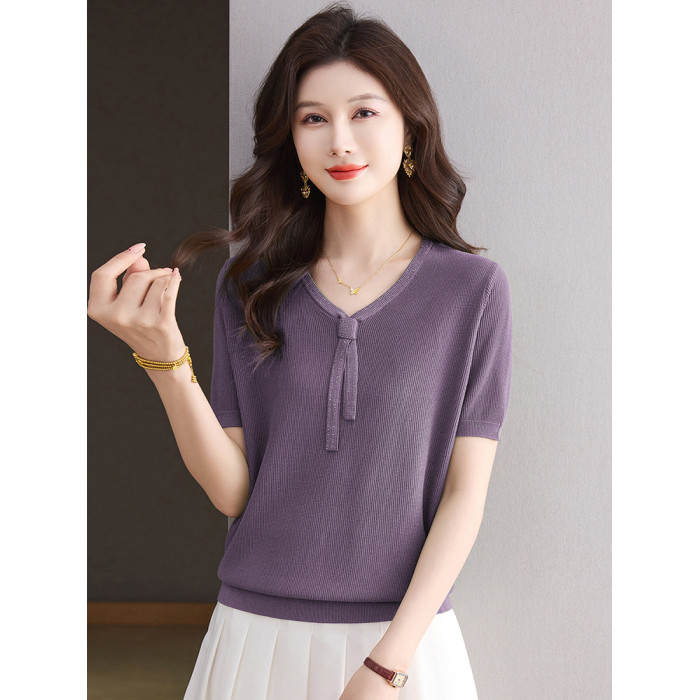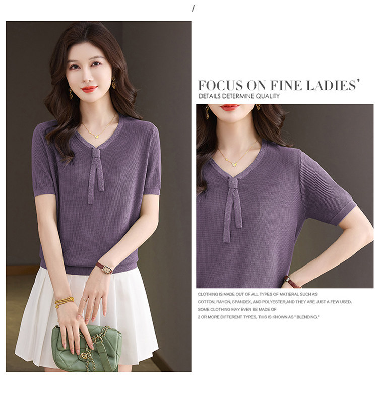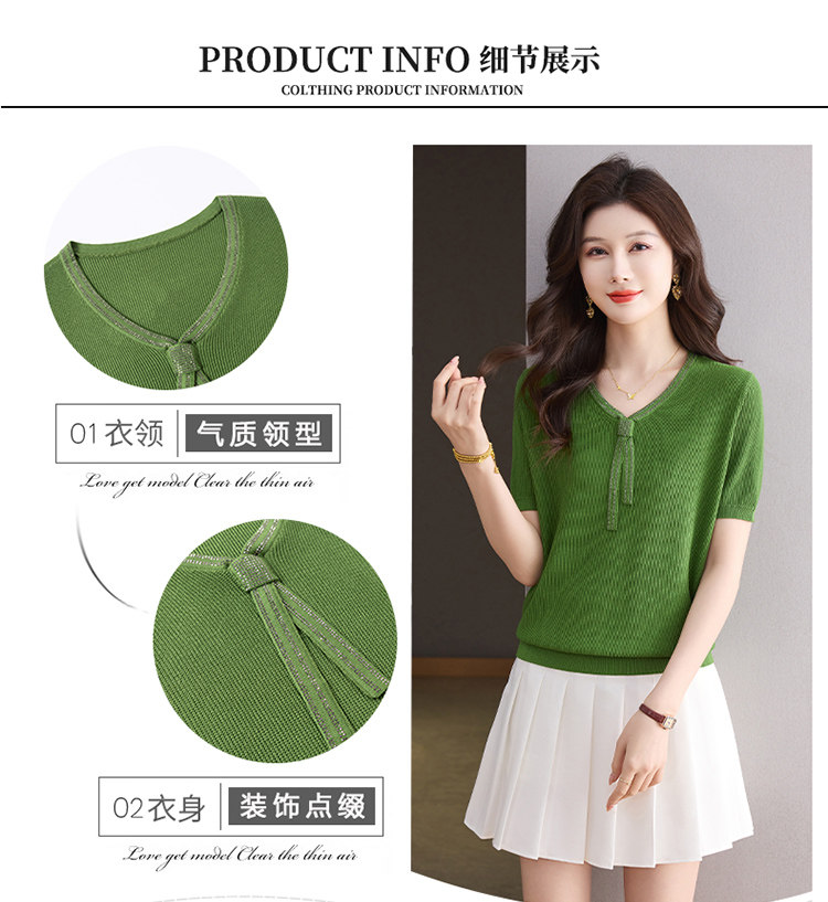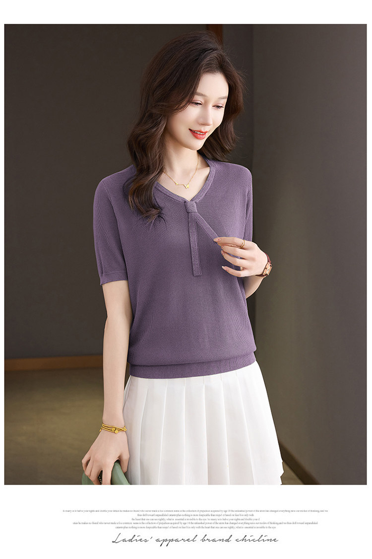 桑蠶絲針織衫女寬松薄款上衣短款短袖r恤時尚減齡媽媽裝V領打底衫