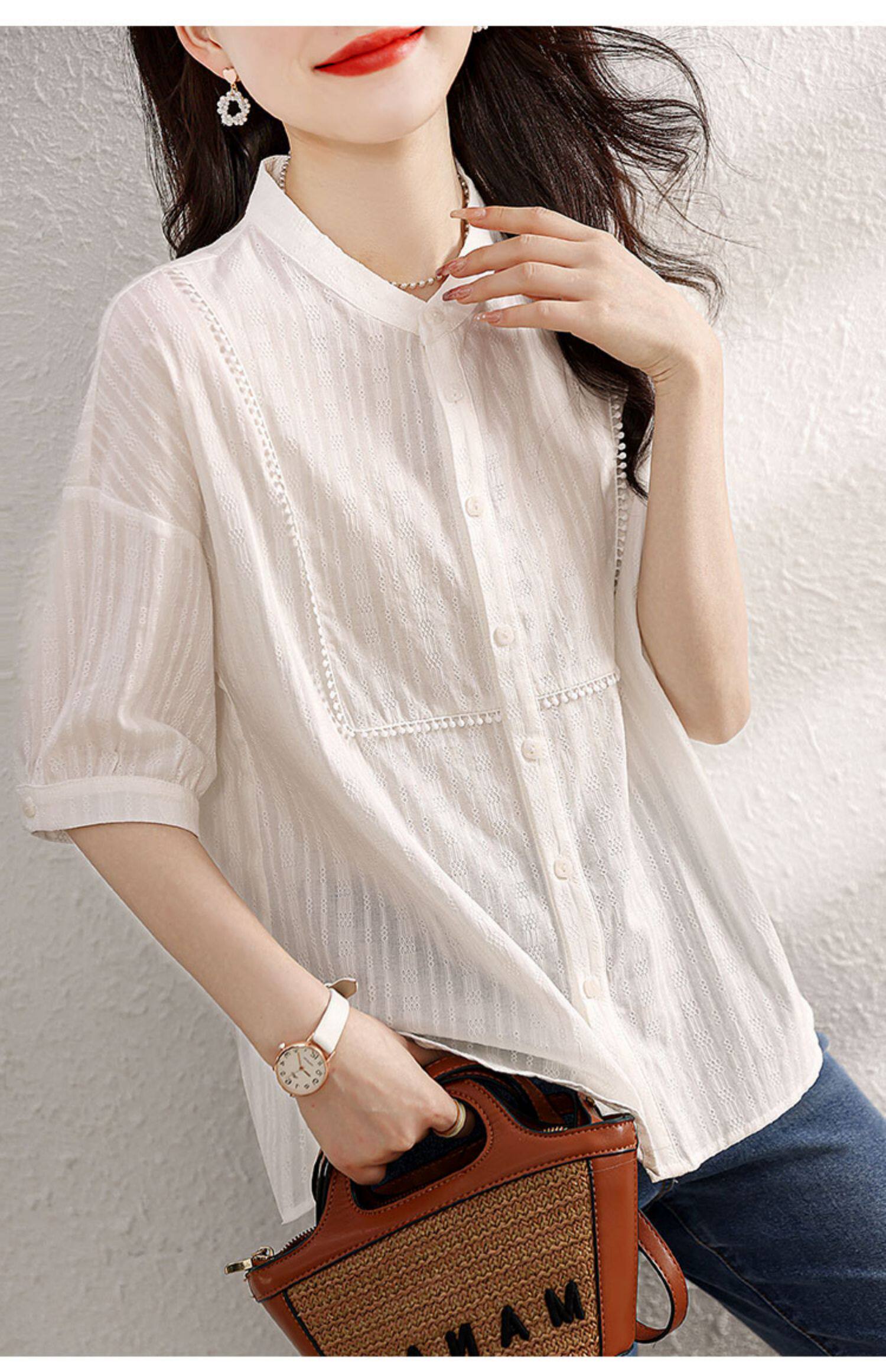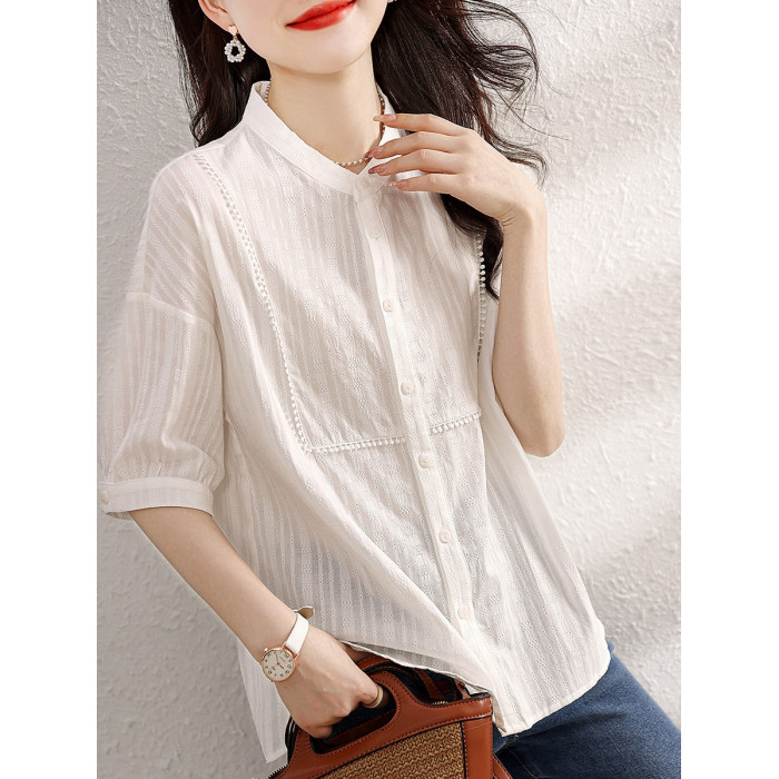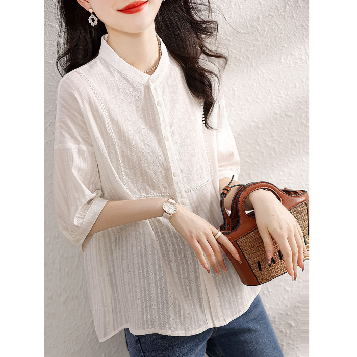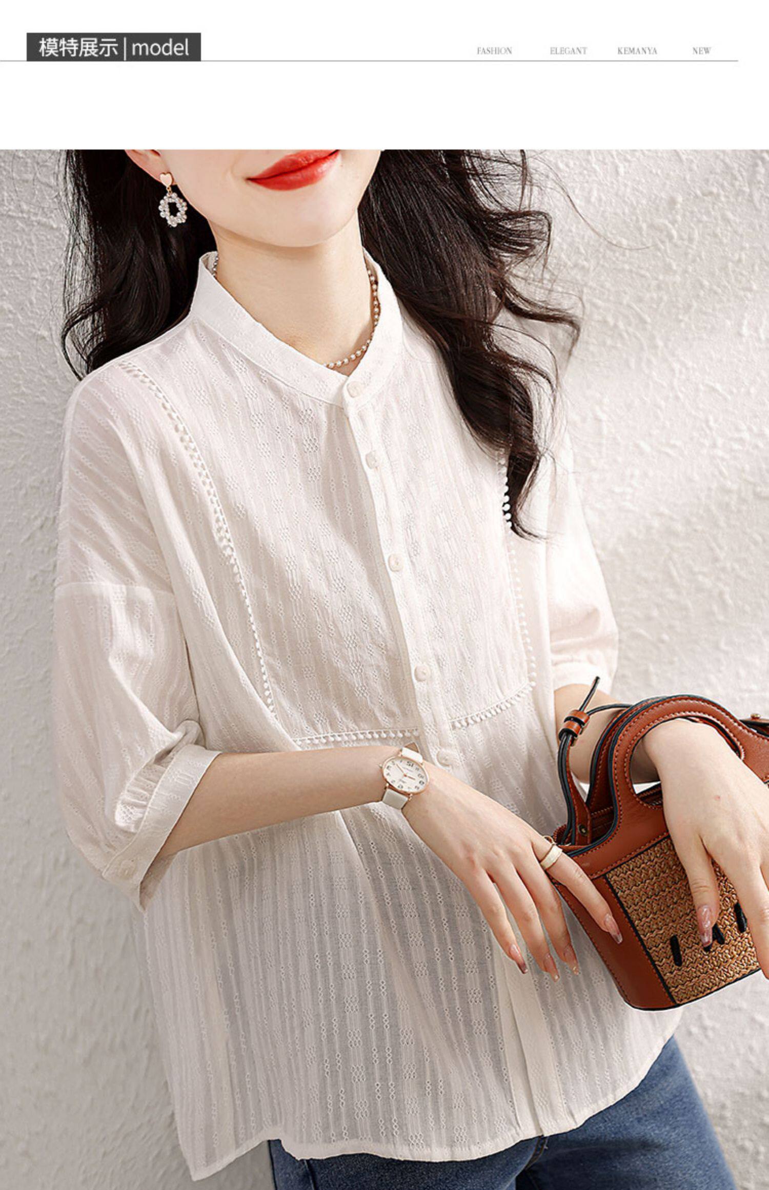 九月陌墨氣質減齡襯衫2024夏季新款百搭肌理上衣顯瘦五分袖女襯衣