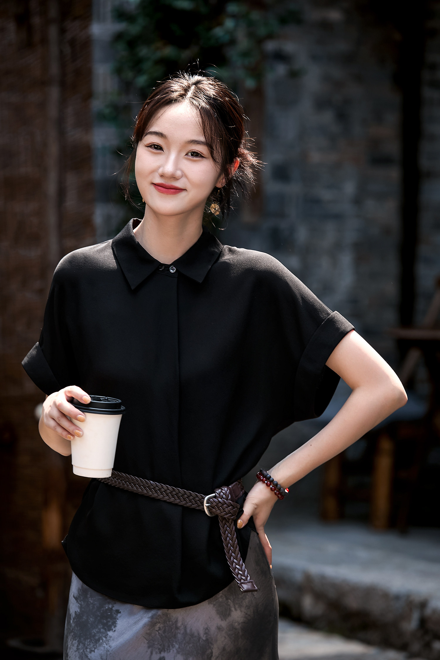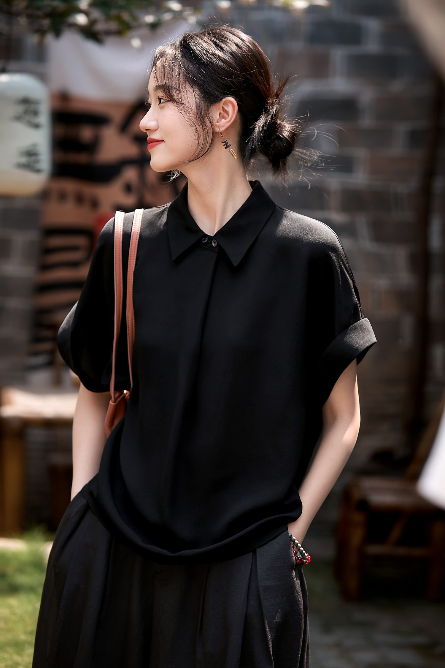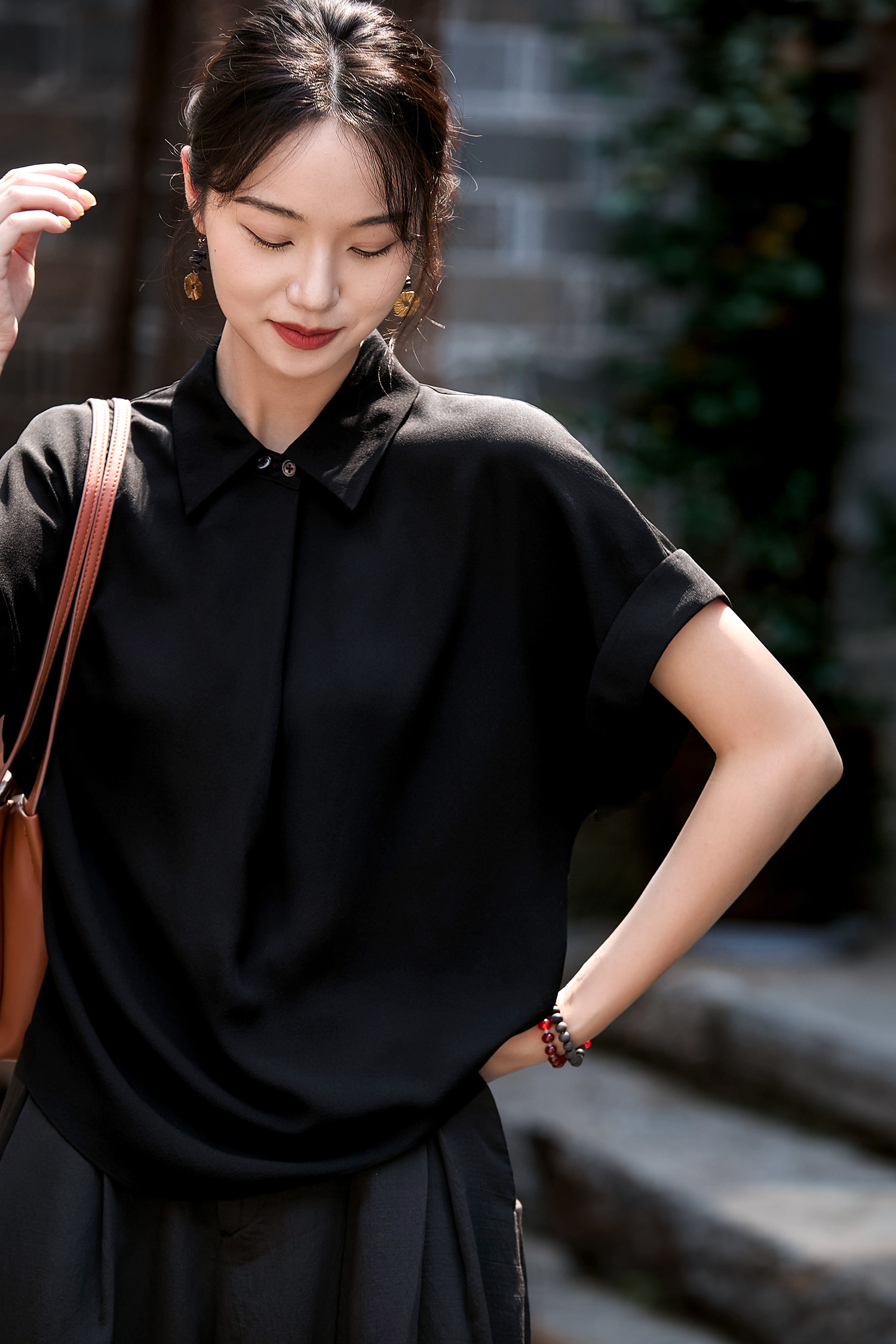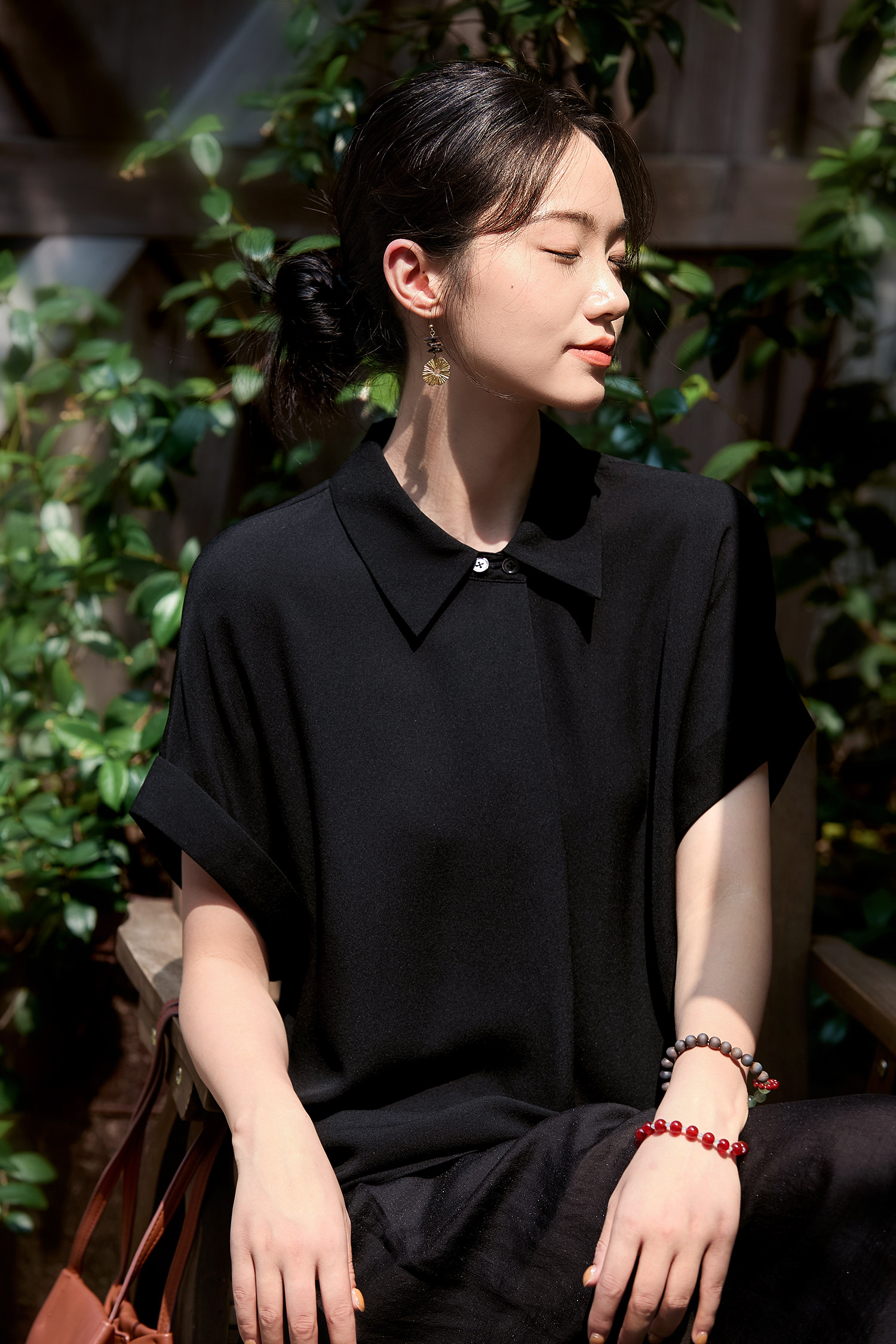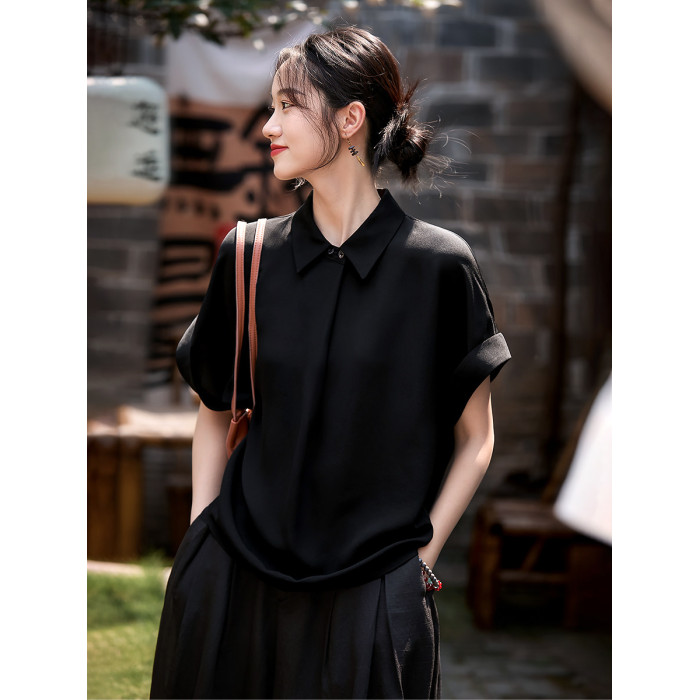 笑涵閣 高級知識分子風 簡約率性建宏縐真絲親膚襯衫小上衣25年